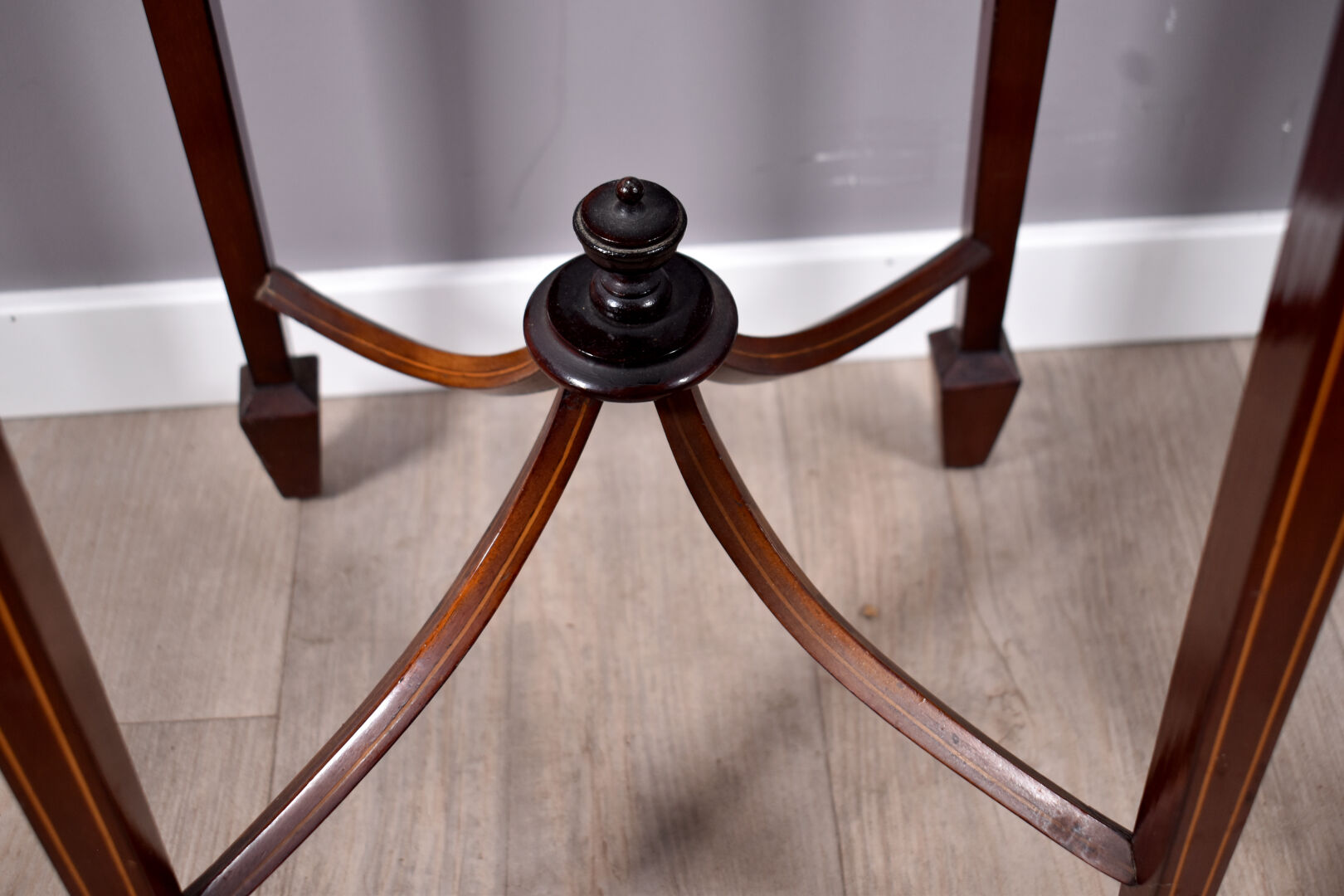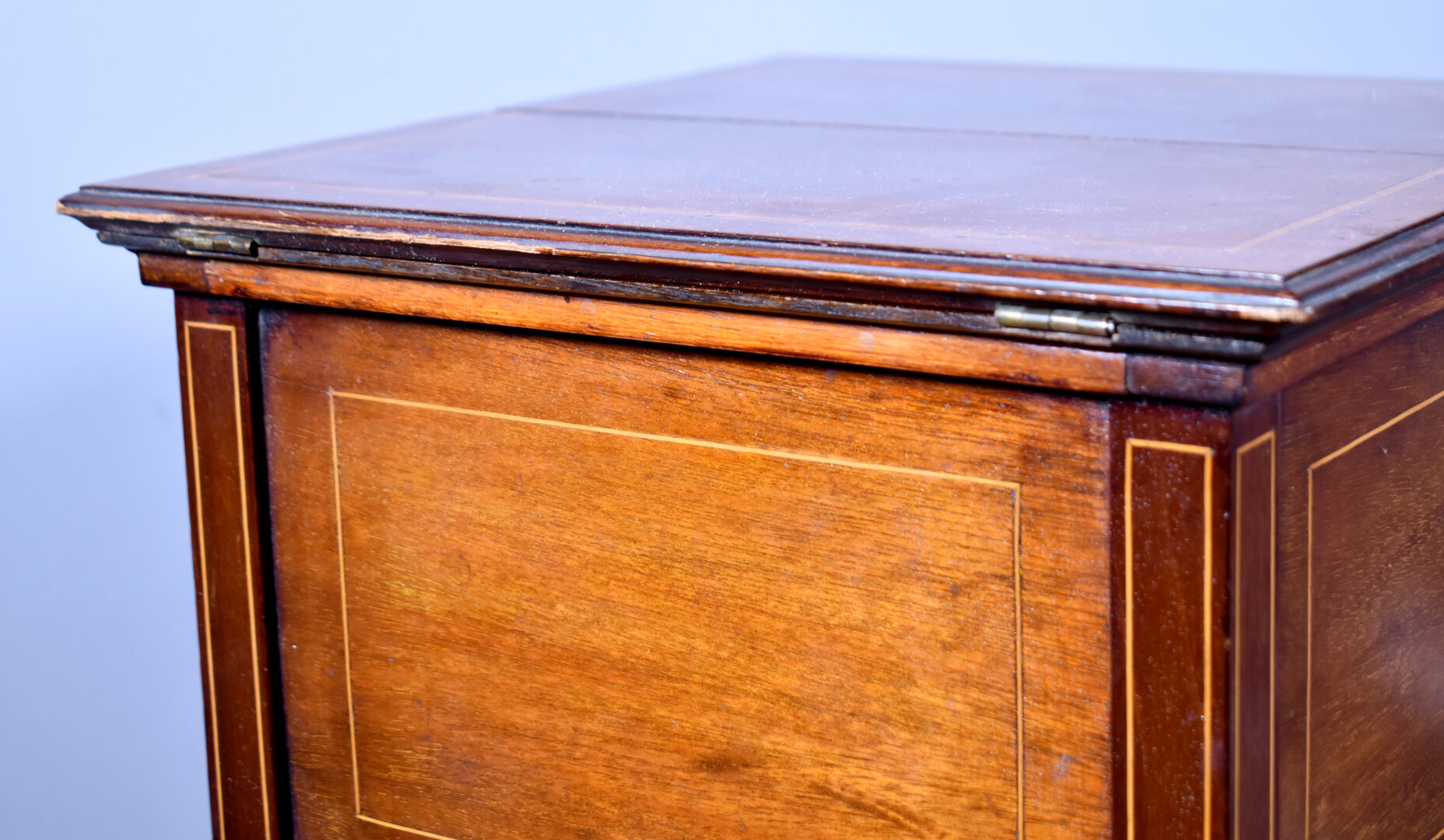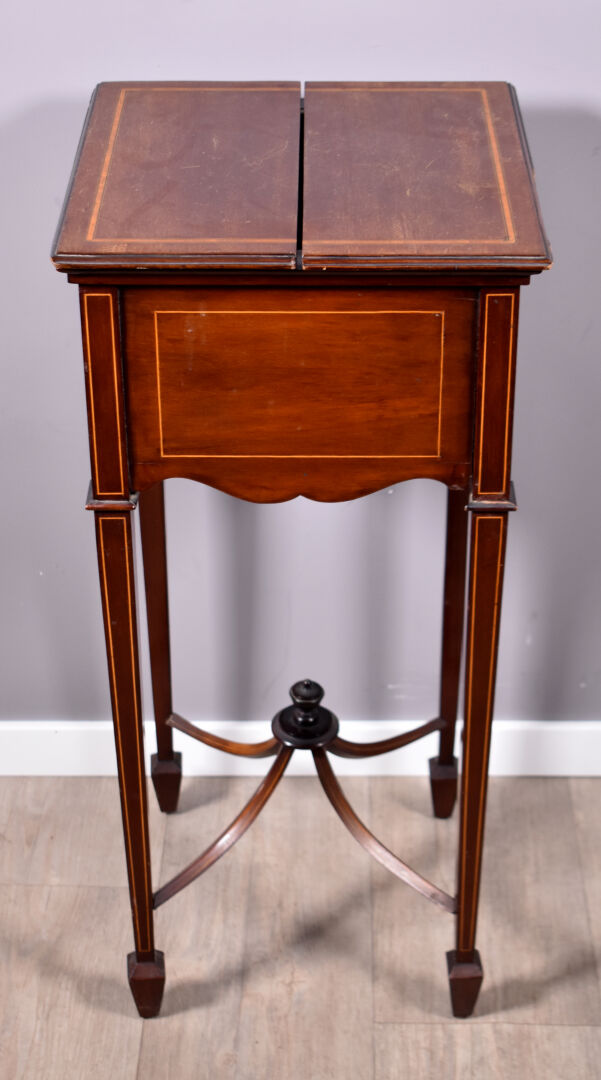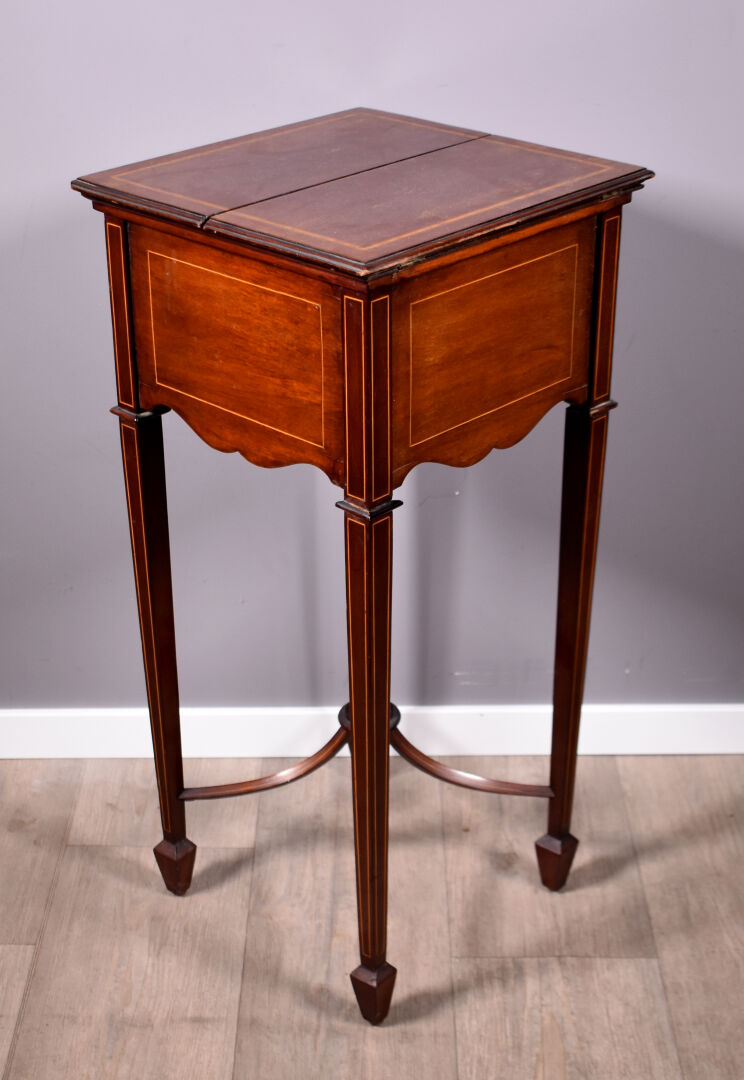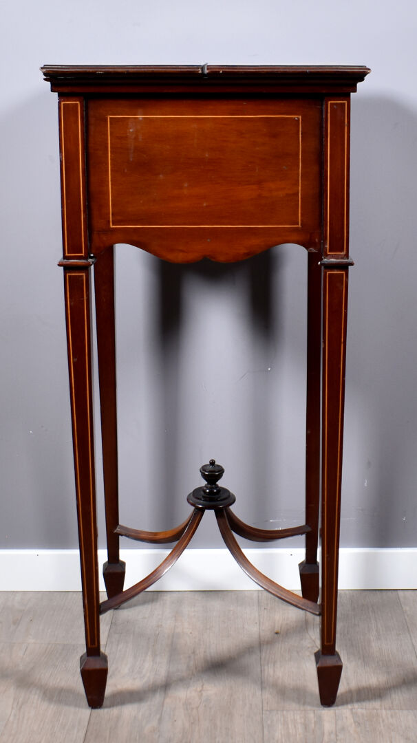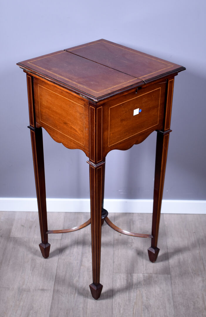 Petite table à ouvrage en placage d’acajou et filets de bois blond (insolée, rayures et petits éclats). Le plateau ouvrant sur un intérieur garnis de satin bleu et cuir vert (usures et décolorations). Plaque « Kirby Bird & Co, fabriqué en Angleterre ». Haut. : 74 cm. Larg. : 35 cm. Prof. : 35 cm.
