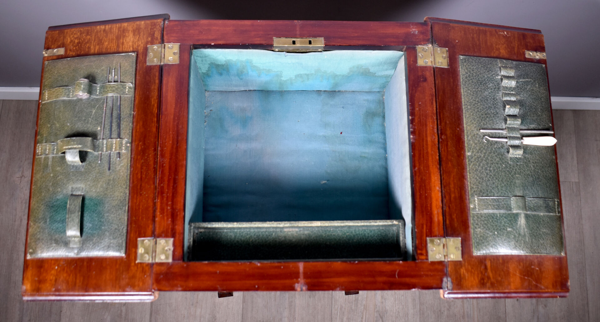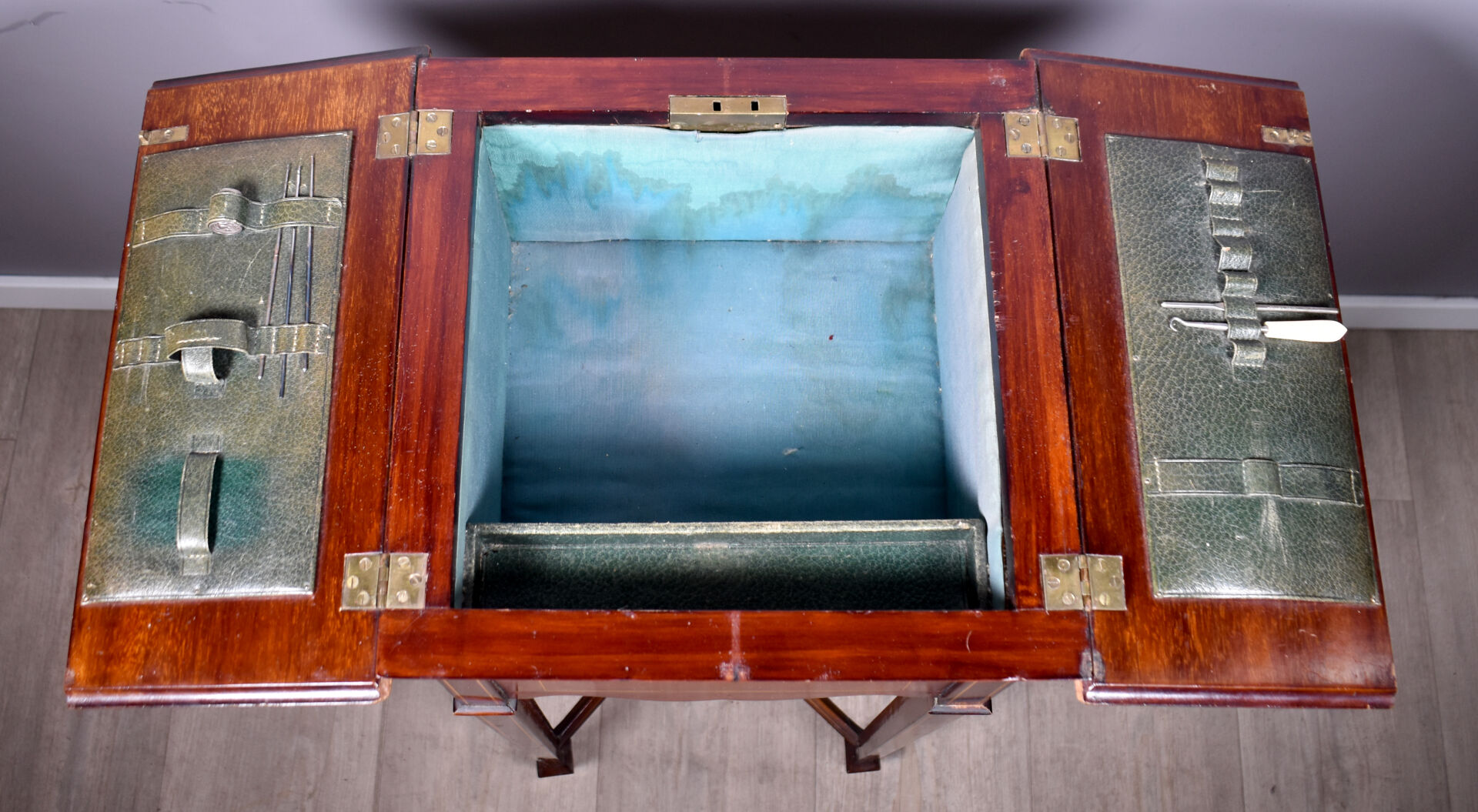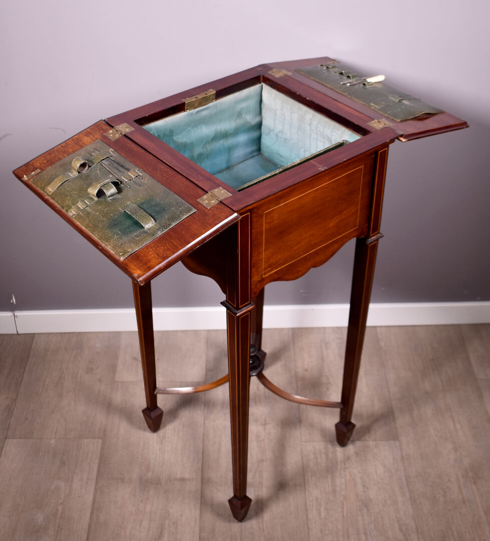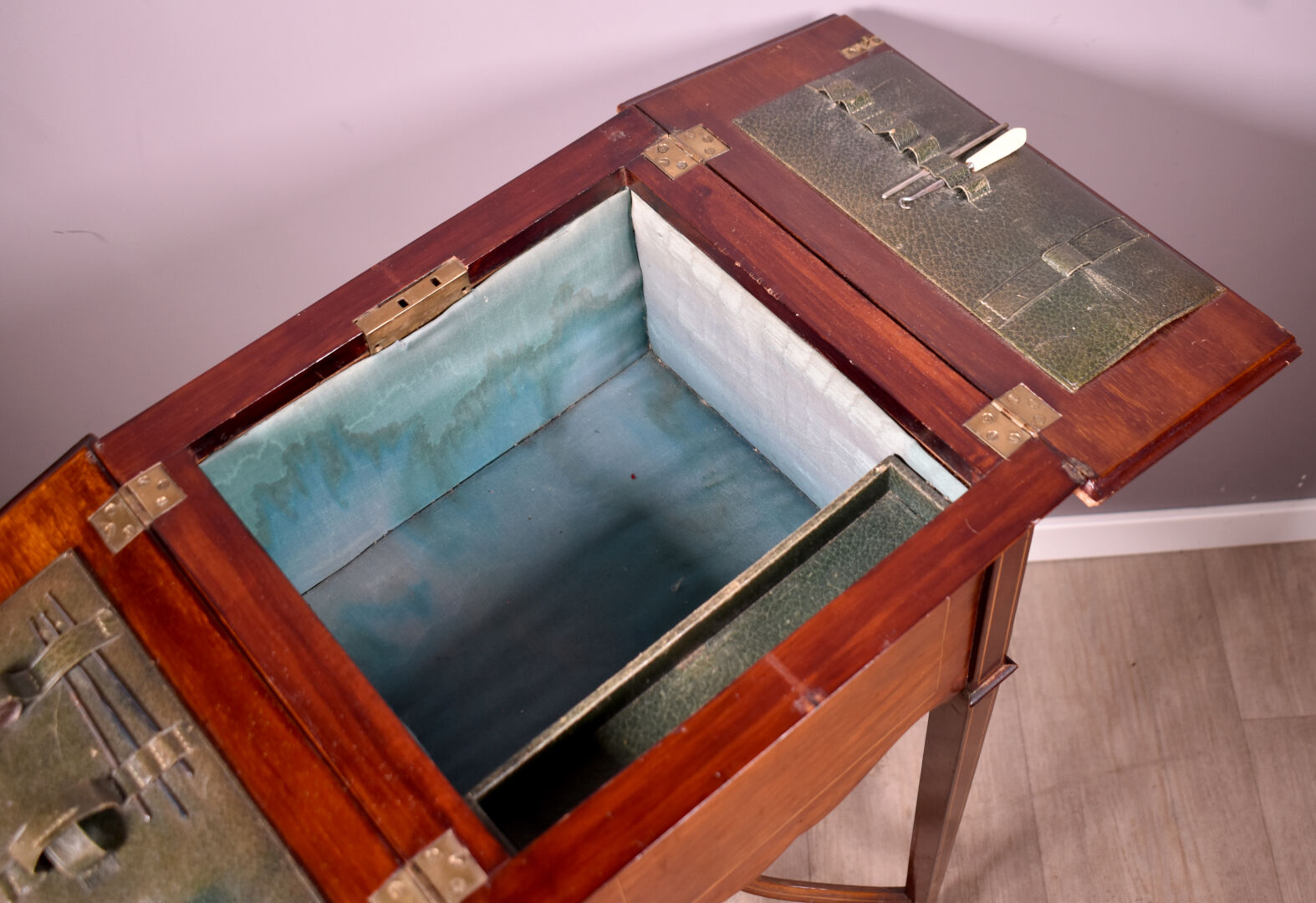 Petite table à ouvrage en placage d’acajou et filets de bois blond (insolée, rayures et petits éclats). Le plateau ouvrant sur un intérieur garnis de satin bleu et cuir vert (usures et décolorations). Plaque « Kirby Bird & Co, fabriqué en Angleterre ».