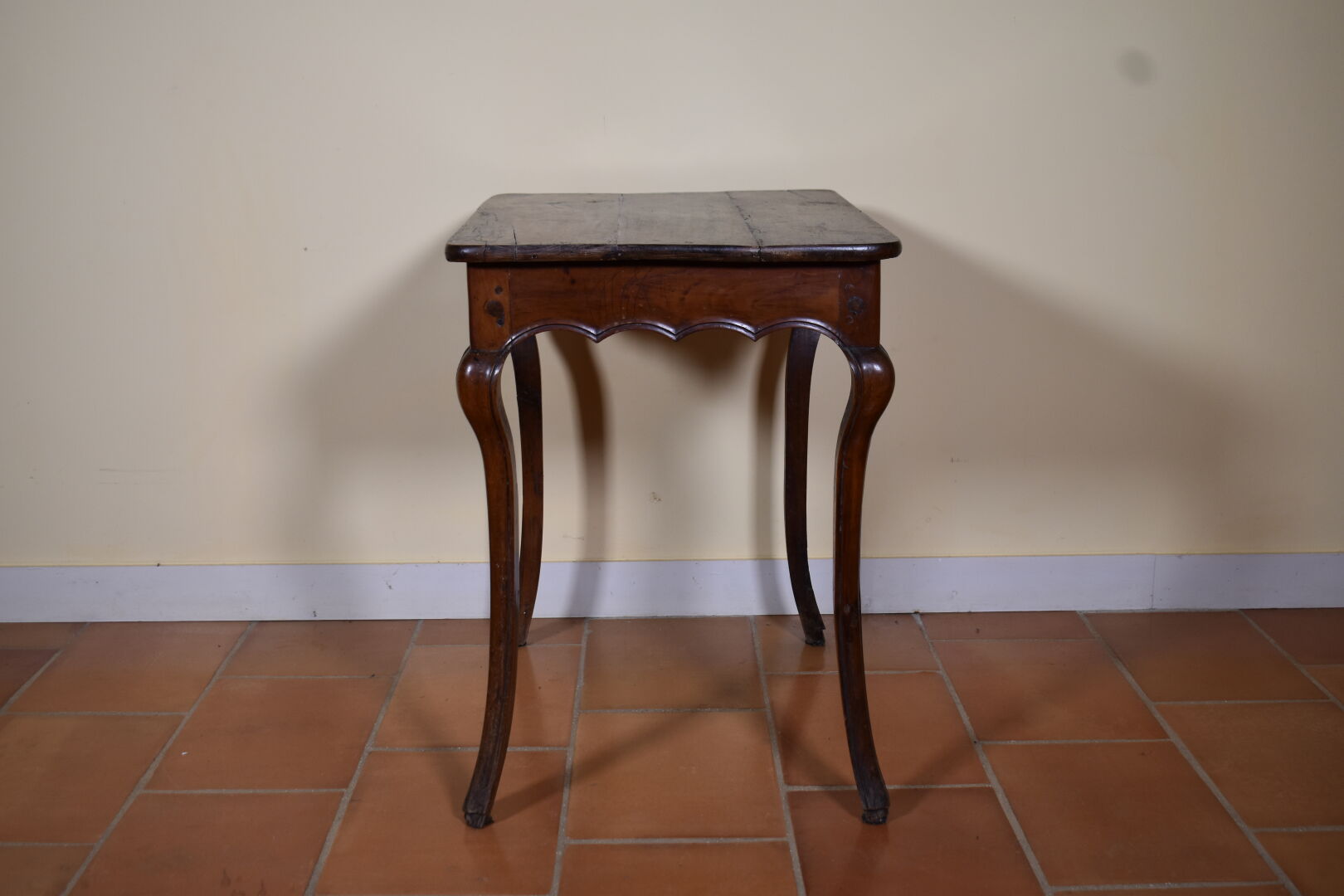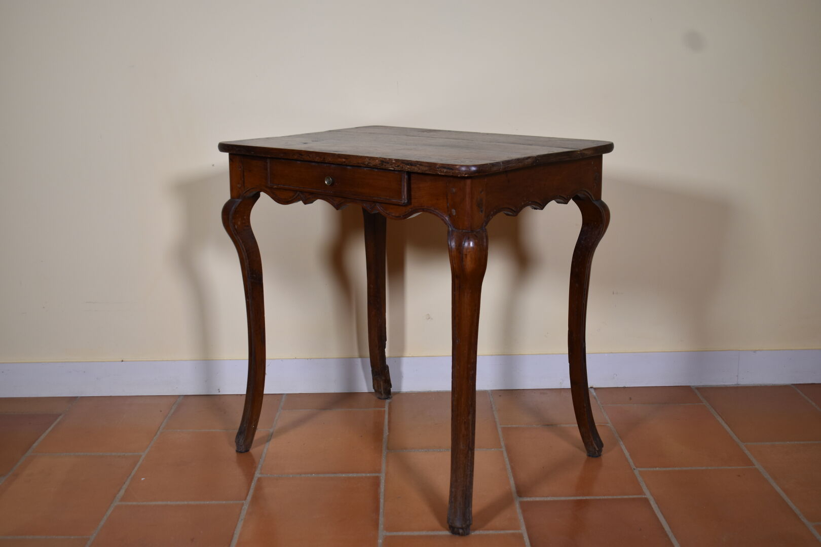 Petite table en bois fruitier, ouvrant à un tiroir, ceinture violonée, pieds légèrement cambrés (fentes et usures). Époque Régence. Haut. : 74 cm – Larg. : 75 cm – Prof. : 54 cm.