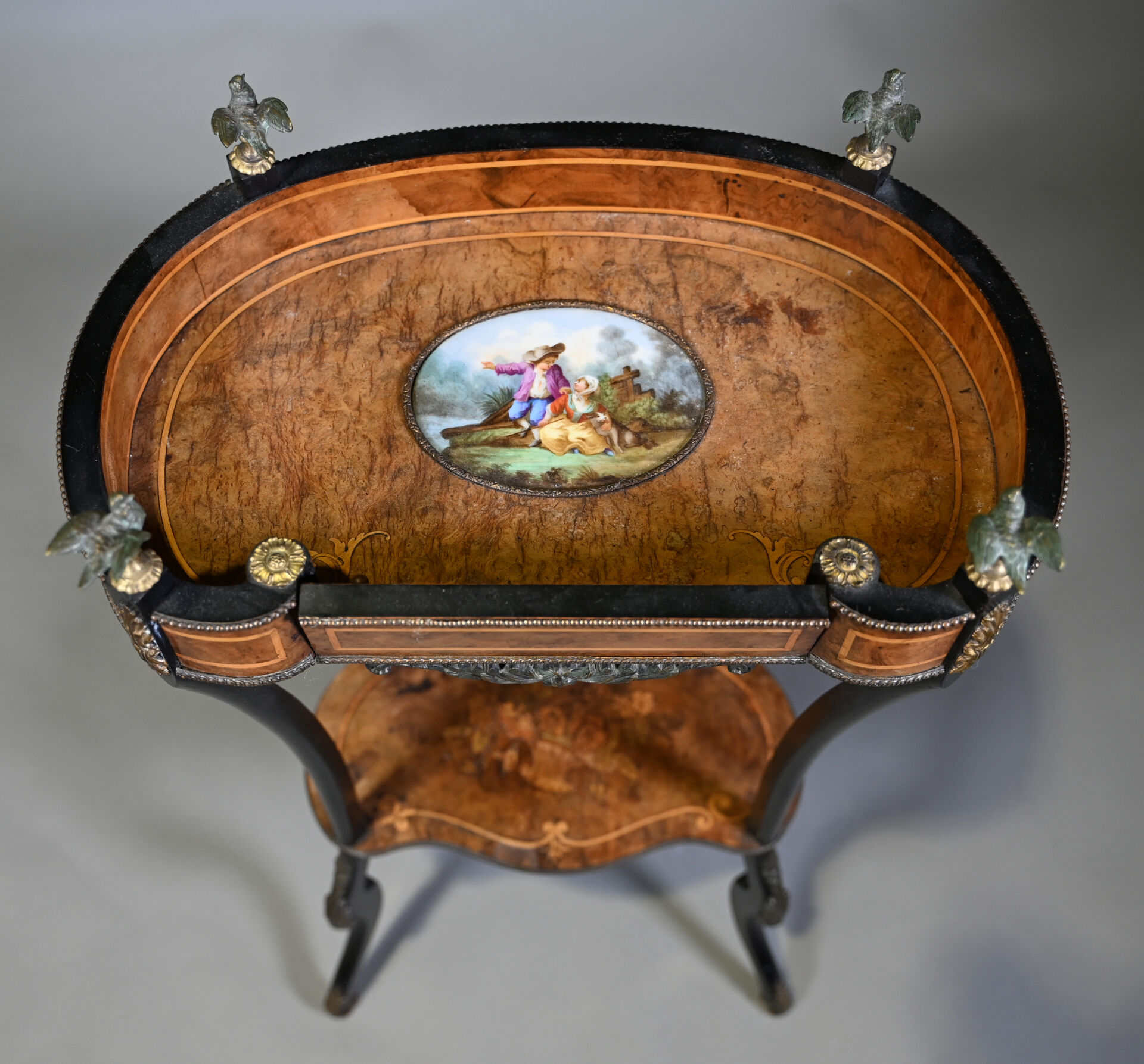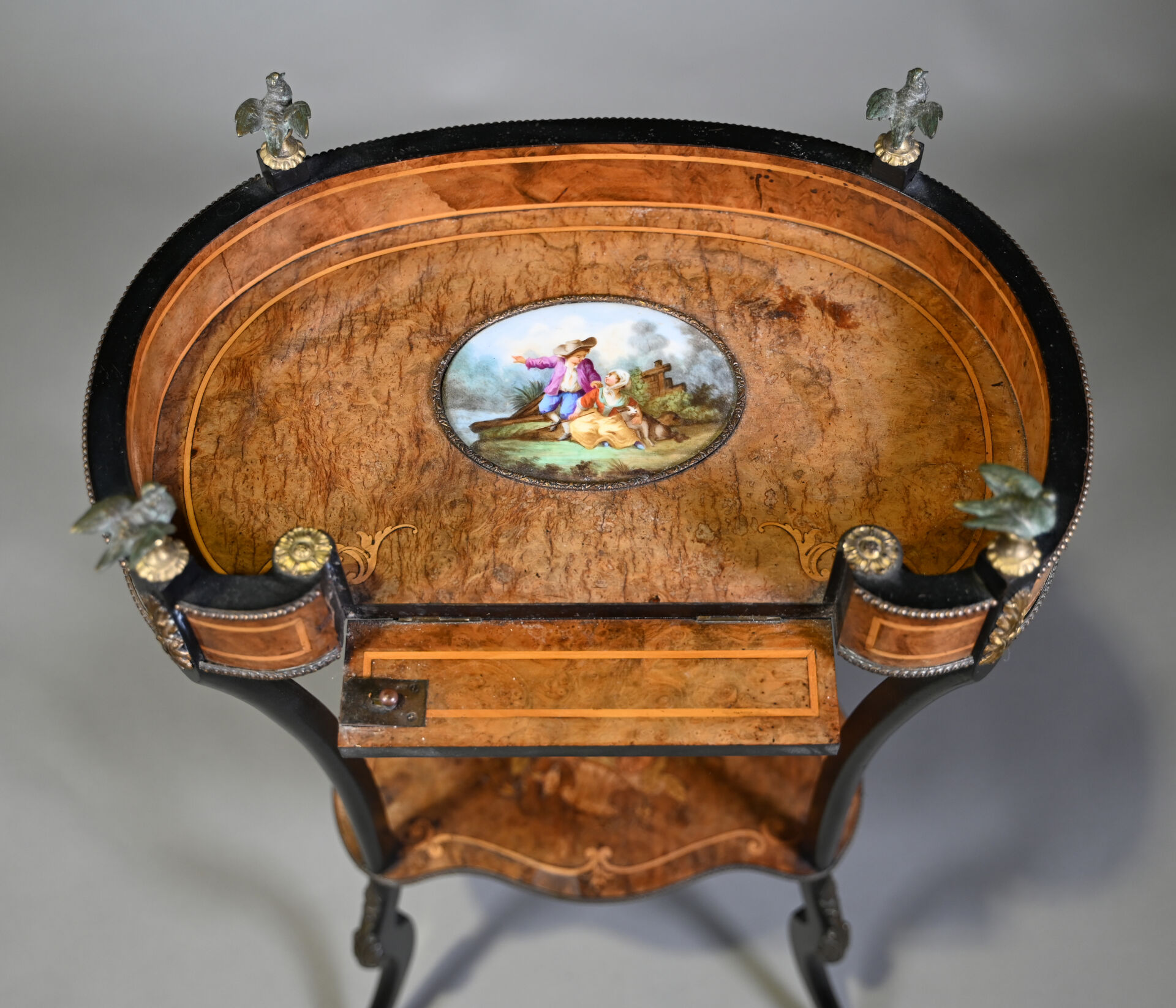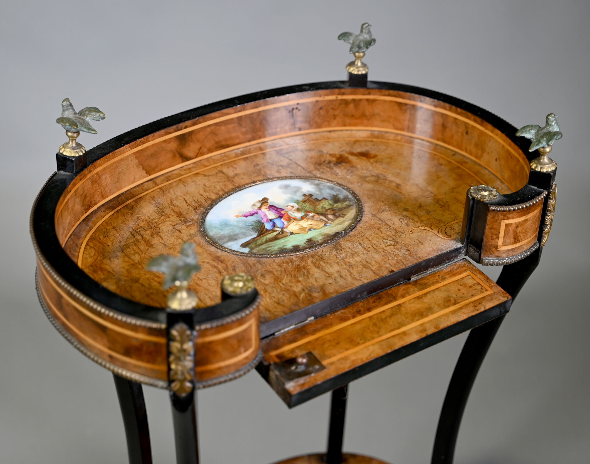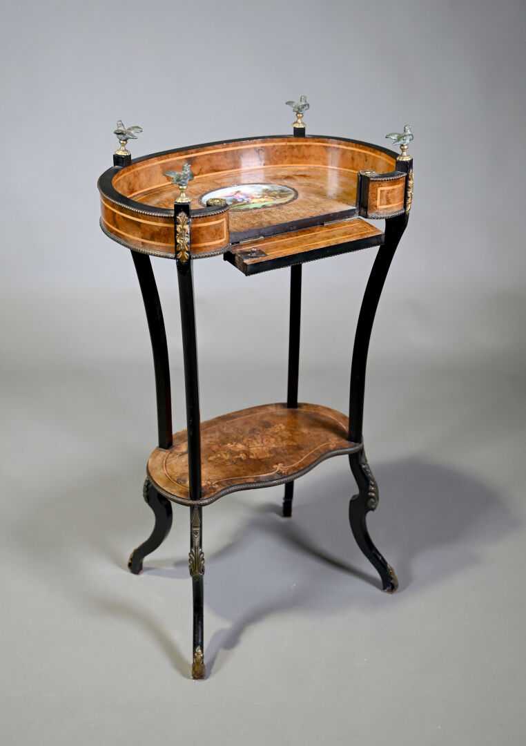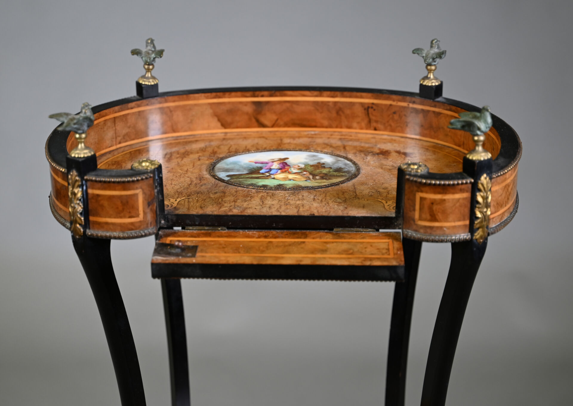 Petite table rognon en bois noirci et bois de placage (usures, insolée). Le plateau supérieur ouvrant, orné d’un médaillon de porcelaine représentant un couple de jeunes bergers. Les pieds cambrés. Epoque Napoléon III. Haut. 84 cm – Larg. : 48 cm – Prof. : 33 cm.