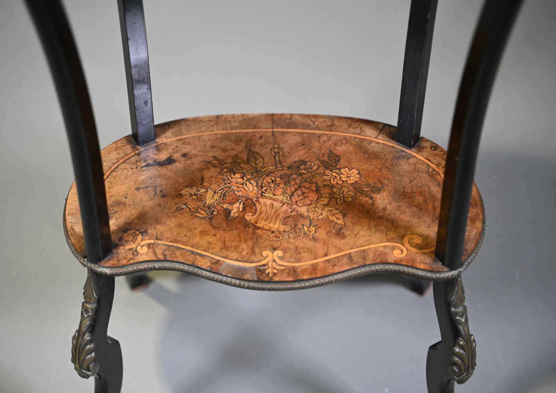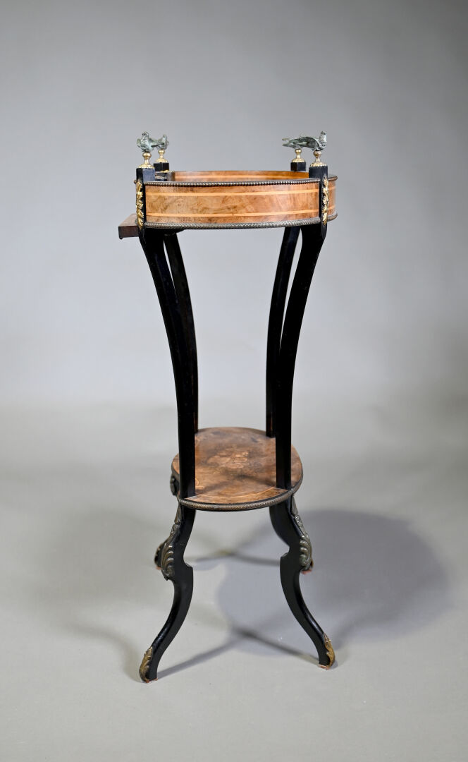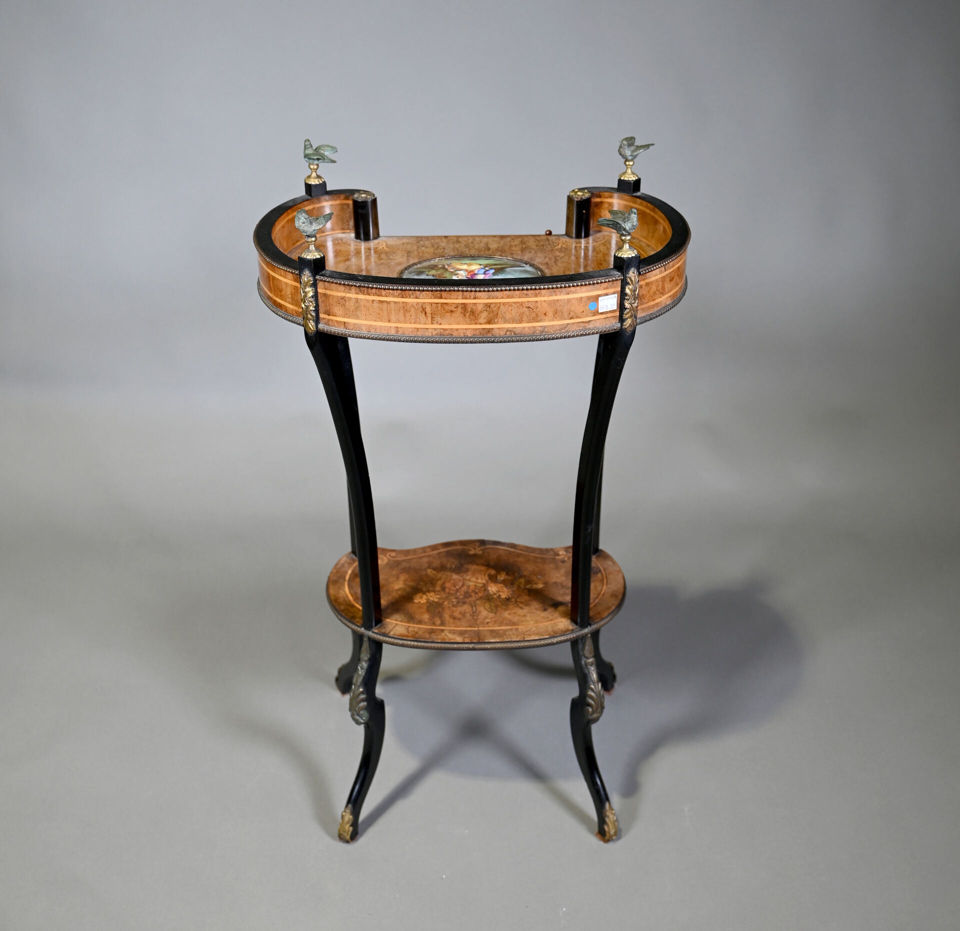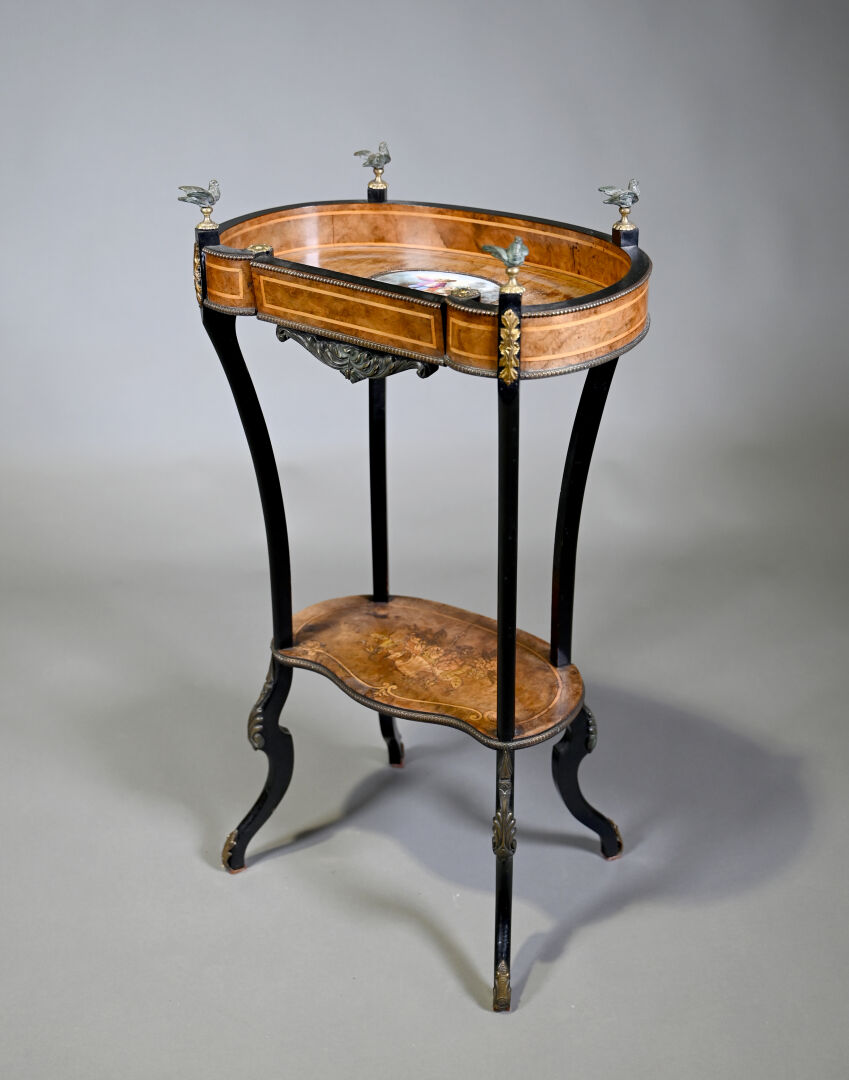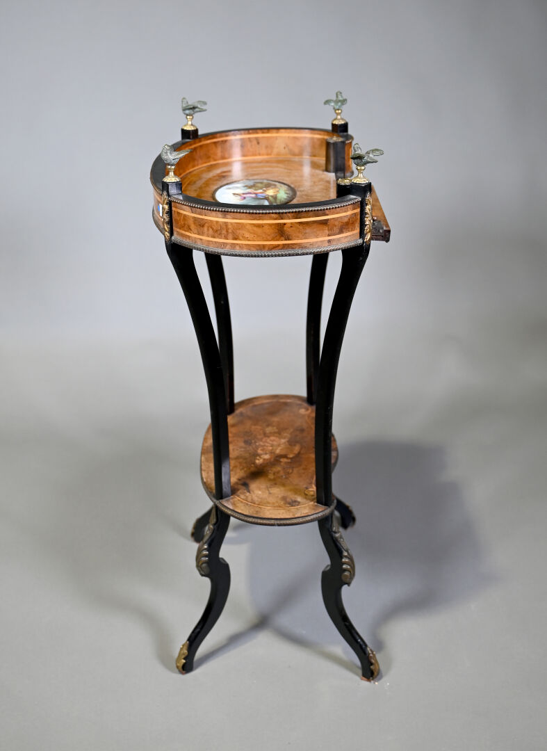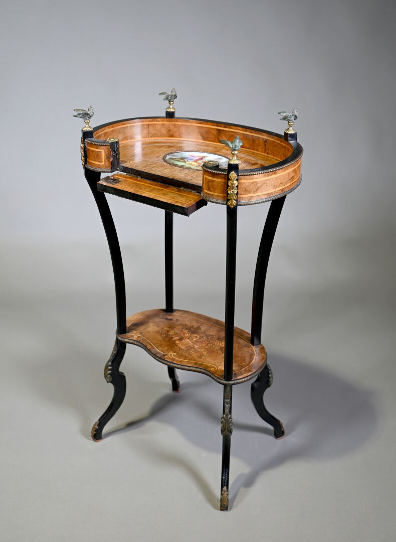 Petite table rognon en bois noirci et bois de placage (usures, insolée). Le plateau supérieur ouvrant, orné d’un médaillon de porcelaine représentant un couple de jeunes bergers. Les pieds cambrés. Epoque Napoléon III. Haut. 84 cm – Larg. : 48 cm – Prof. : 33 cm.
