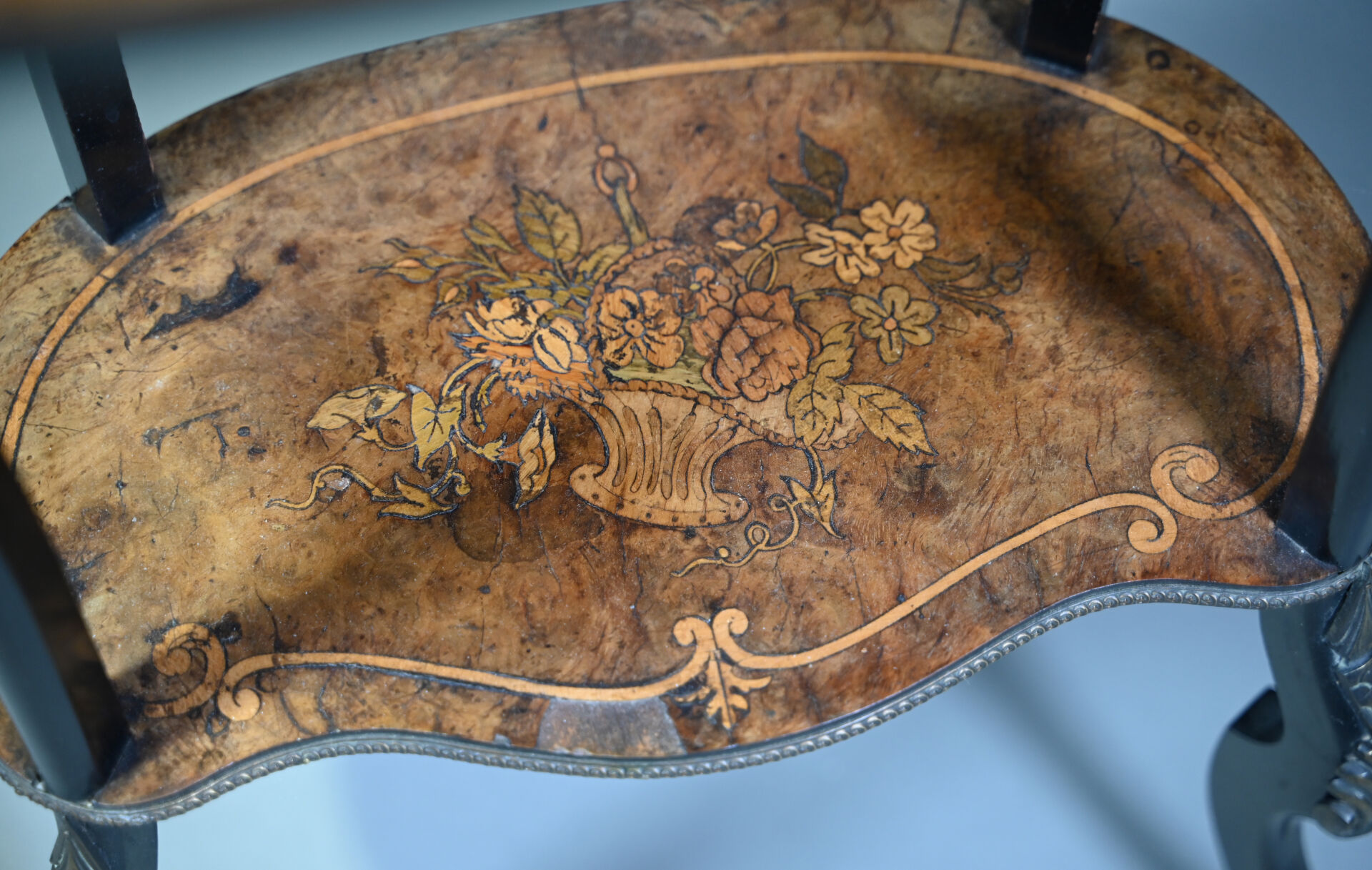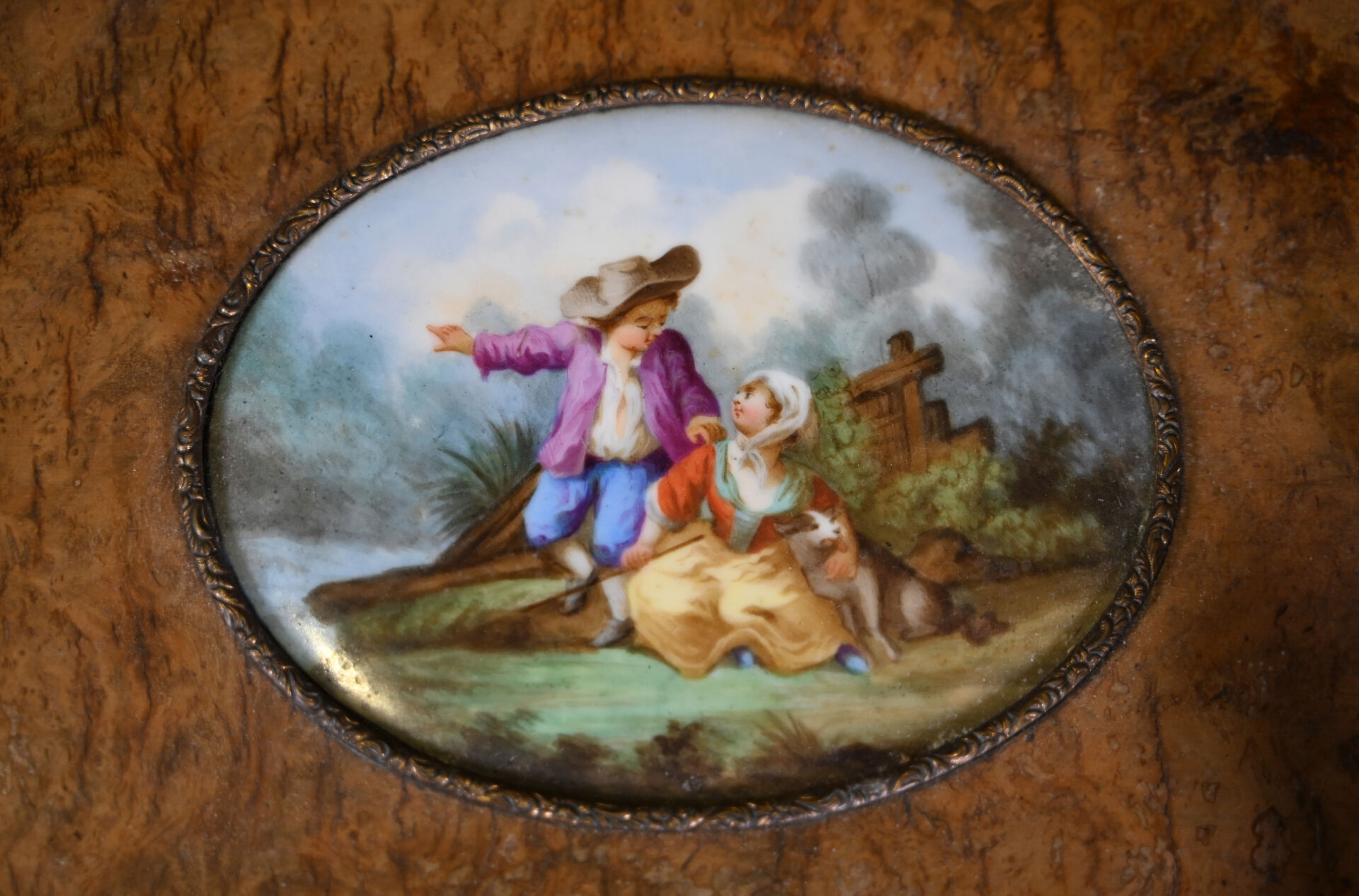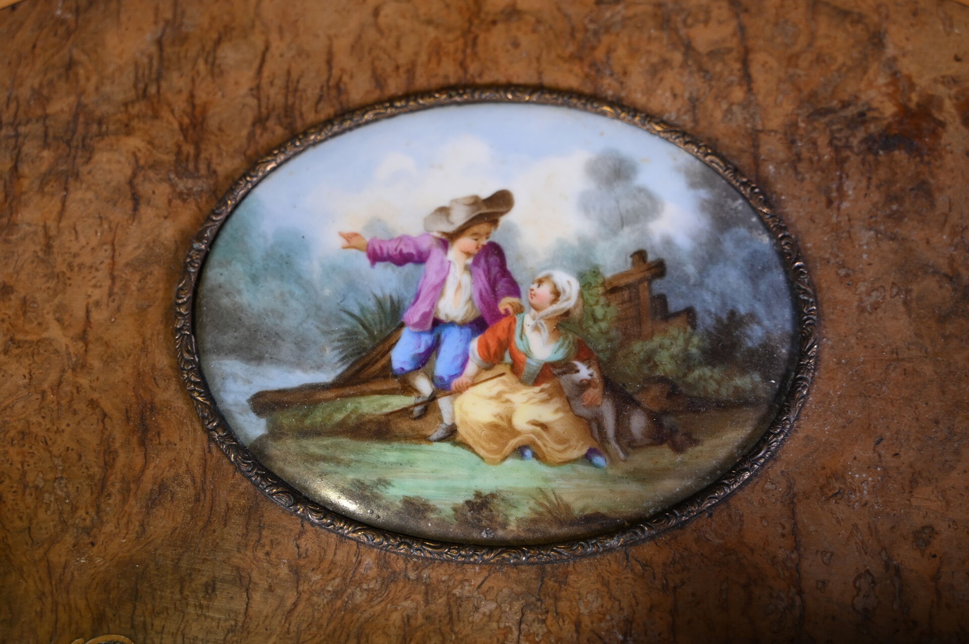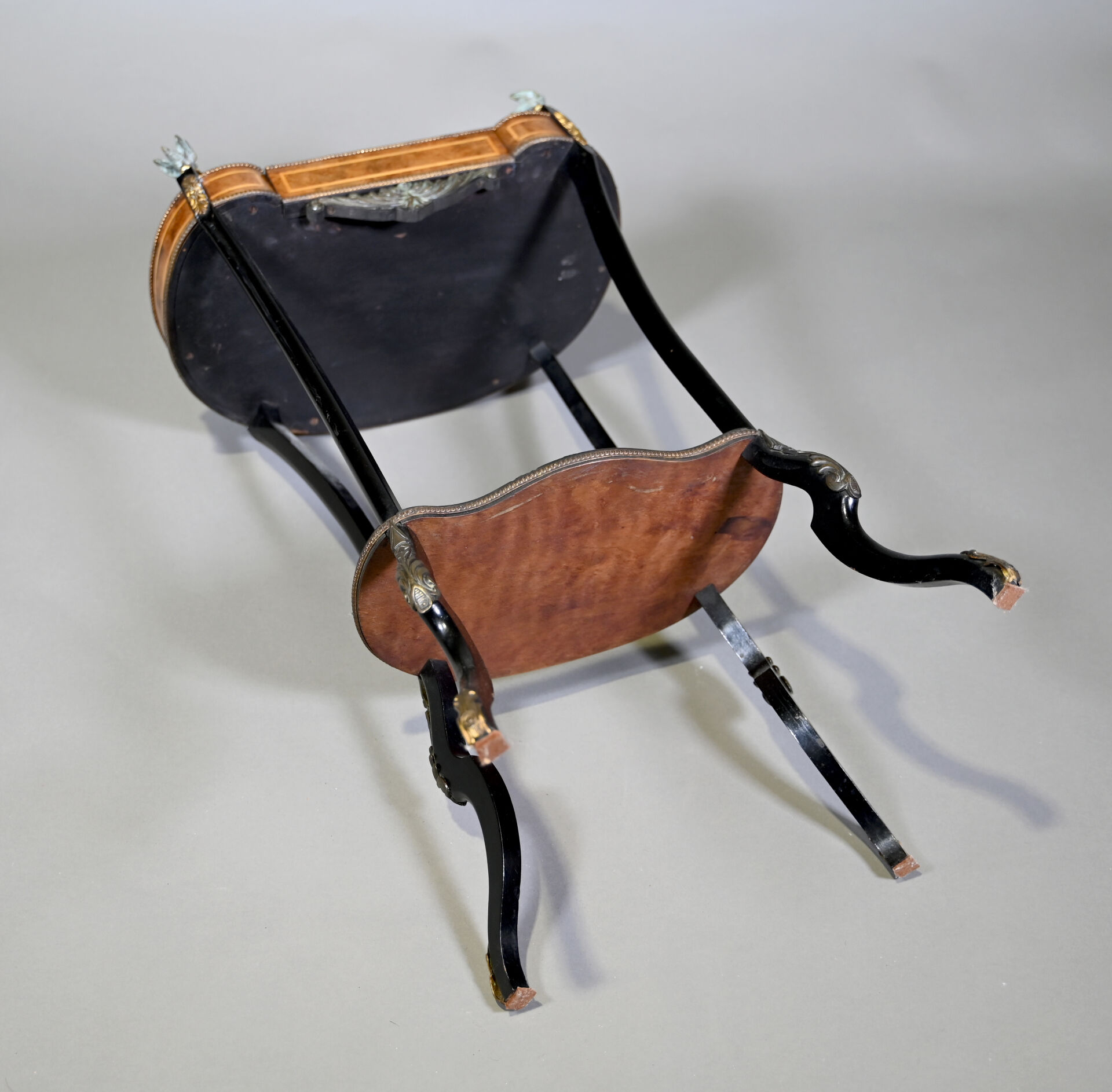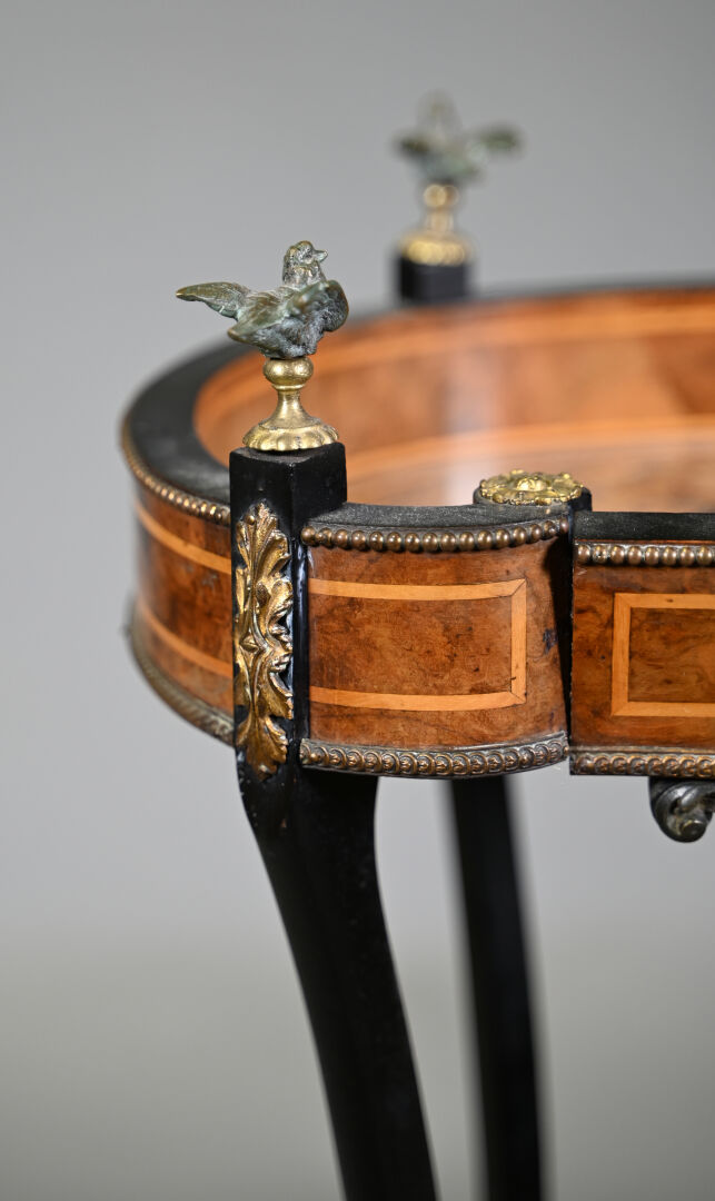 Petite table rognon en bois noirci et bois de placage (usures, insolée). Le plateau supérieur ouvrant, orné d’un médaillon de porcelaine représentant un couple de jeunes bergers. Les pieds cambrés. Epoque Napoléon III. Haut. 84 cm – Larg. : 48 cm – Prof. : 33 cm.