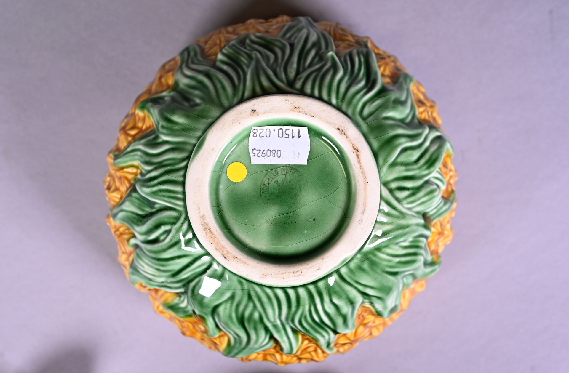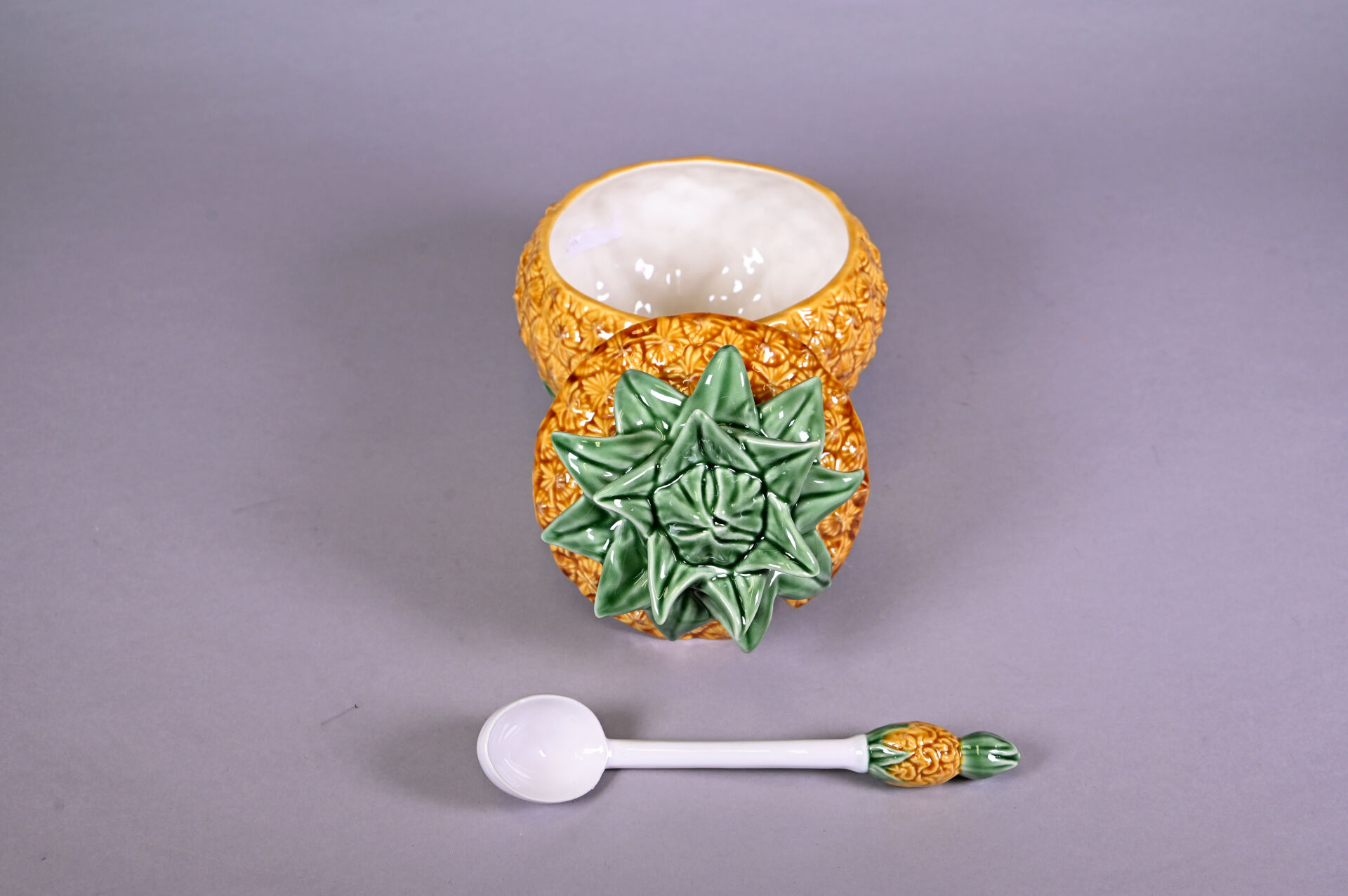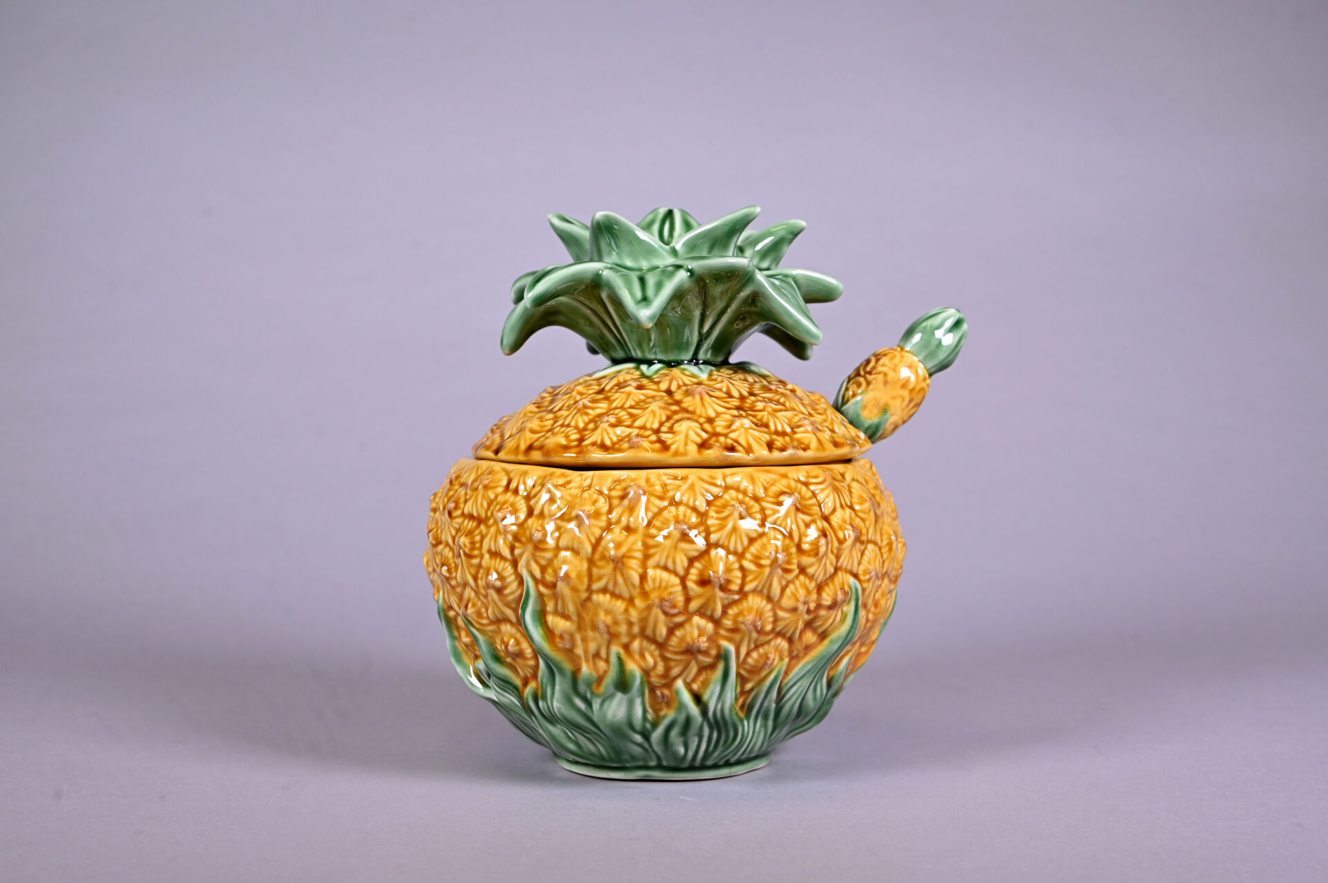 Petite terrine et sa cuillère en barbotine en forme d’ananas. Marque au dessous. Haut. : 21 cm.