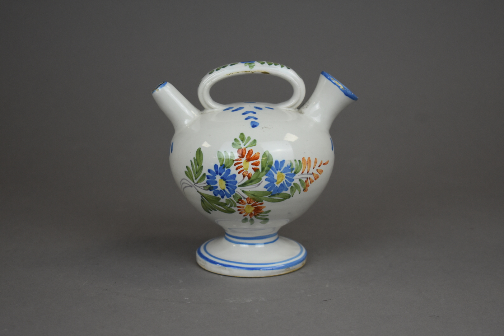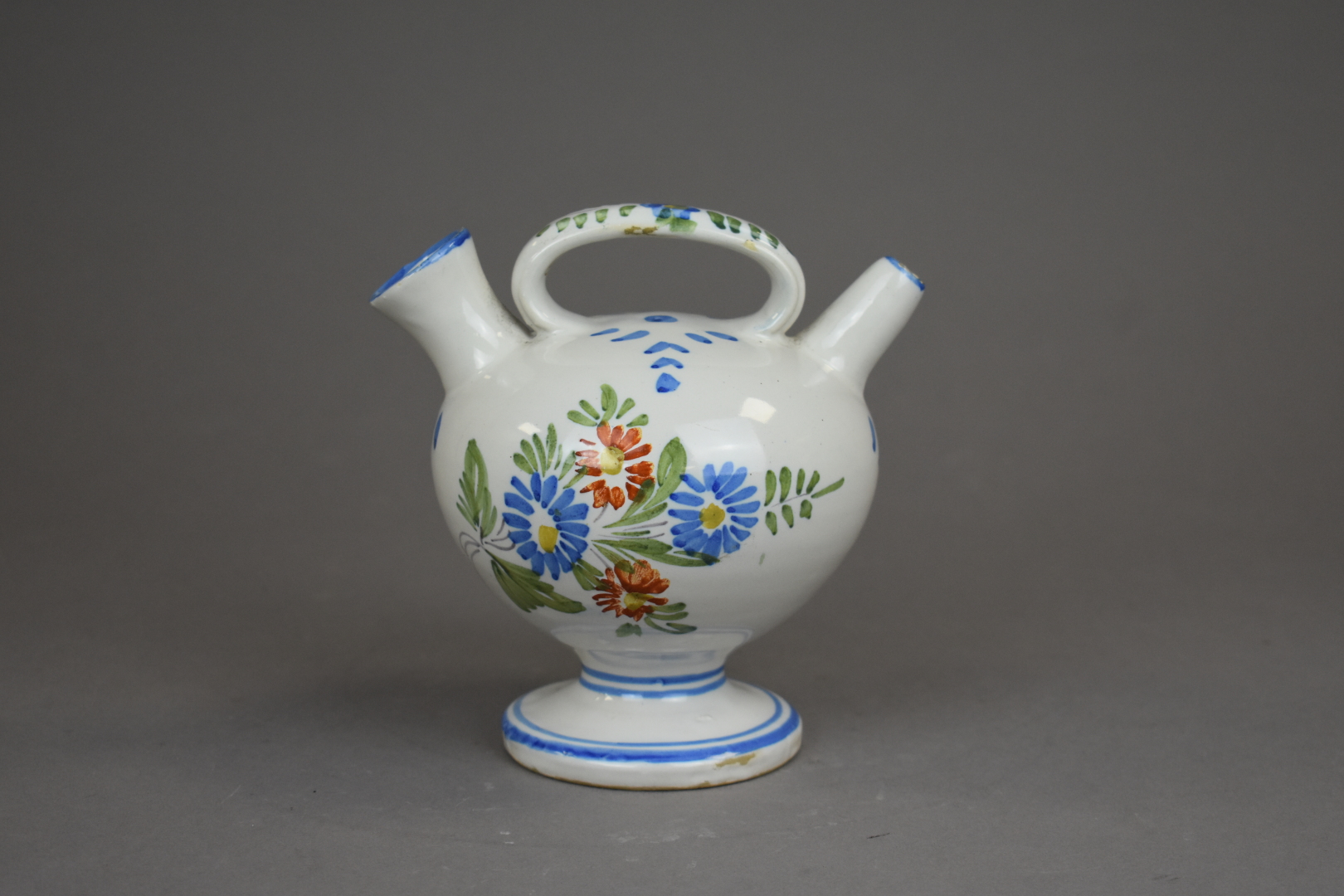Petite verseuse en faïence régionale à décor de fleurs (petits éclats). Fin du XIXe ou début du XXe siècle. Haut. : 15 cm.