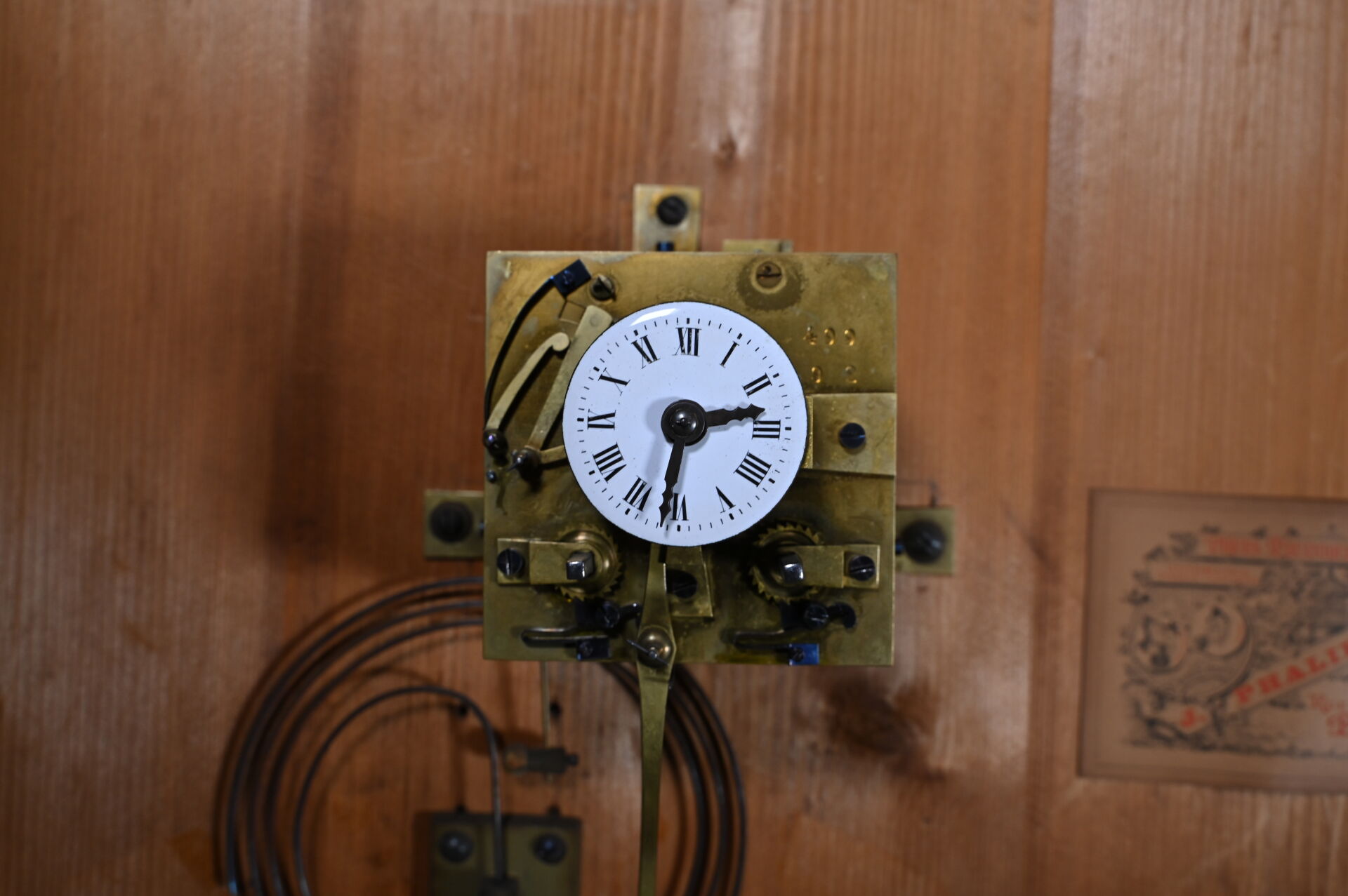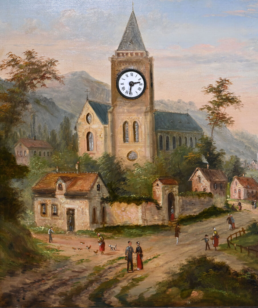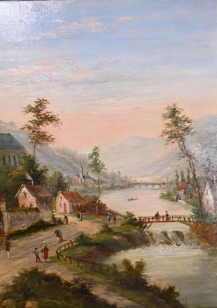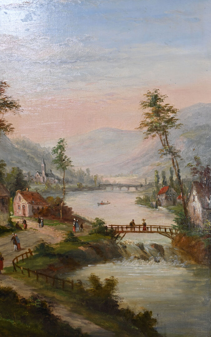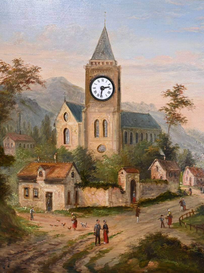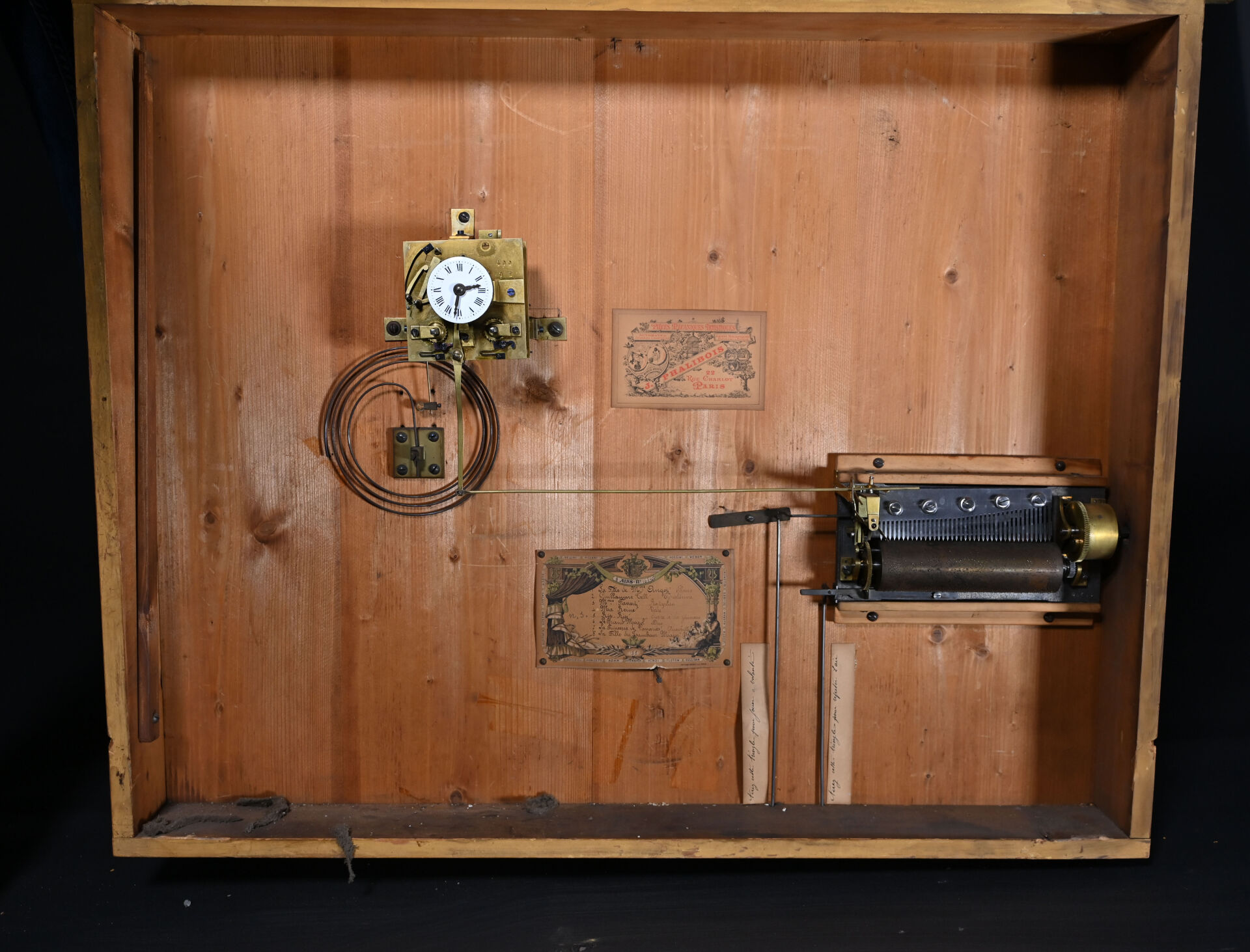 PHALIBOIS. Tableau carillon dit « tableau à horloge », l’huile sur toile représentant un village en bord de rivière (agrafes fixant la toile au cadre à refixer) . Mécanisme à balancier et musique à cylindre avec 8 airs, numéro 16740. Avec balancier et clé. Etiquettes à l’intérieur « PHALIBOIS 22 rue Charlot, Paris ». Haut. : 80 cm – Larg. : 96 cm – Prof. : 18 cm.