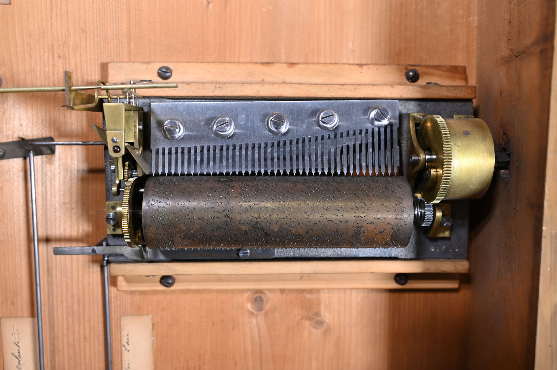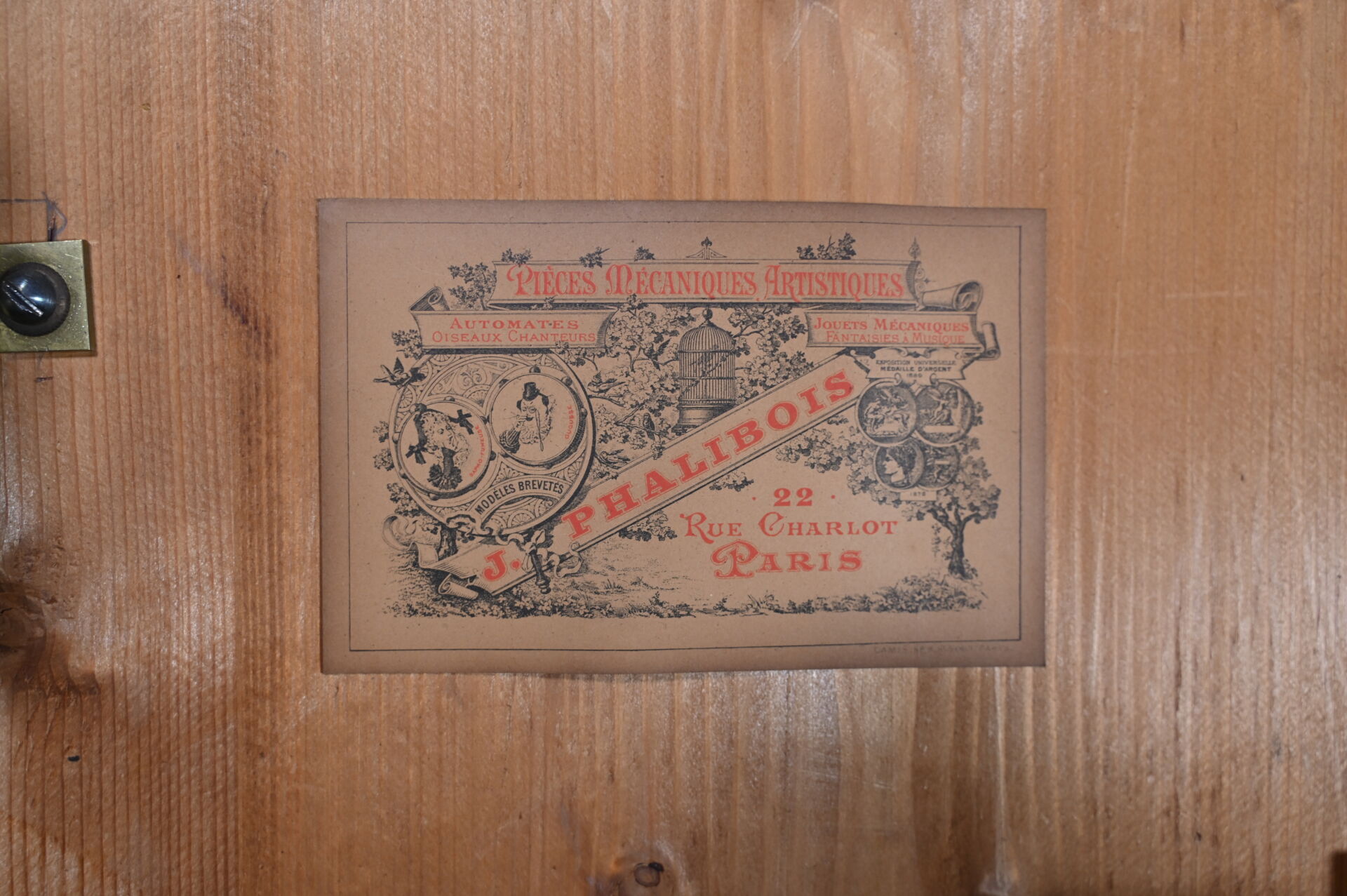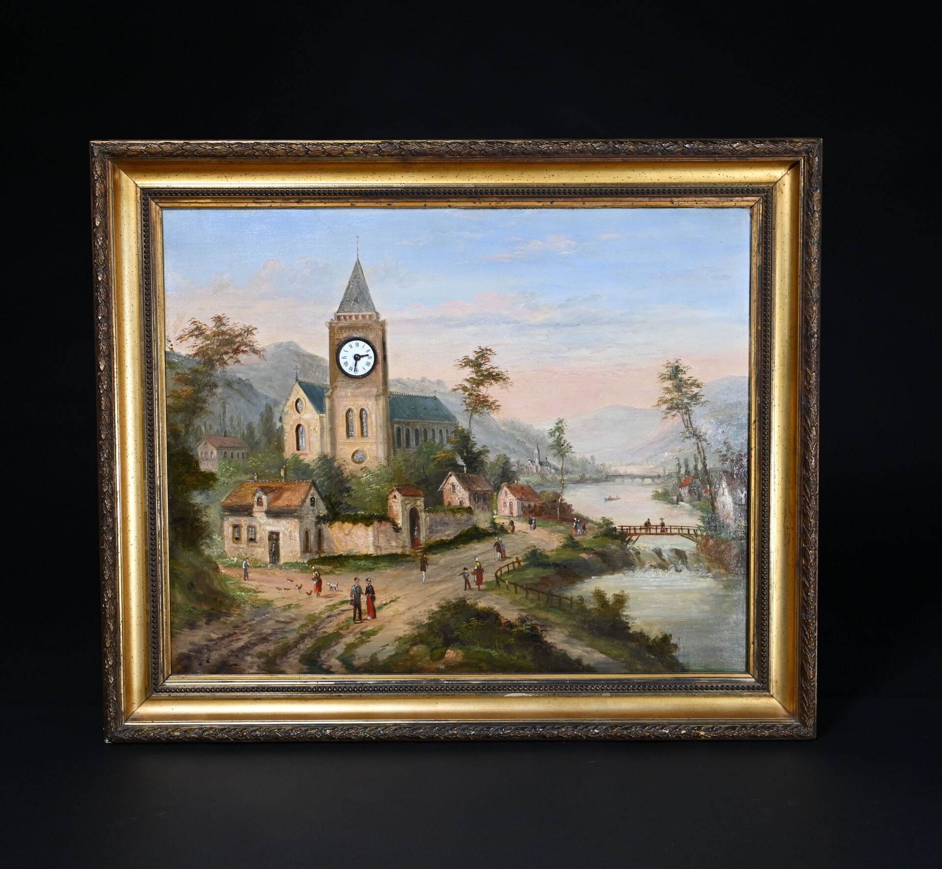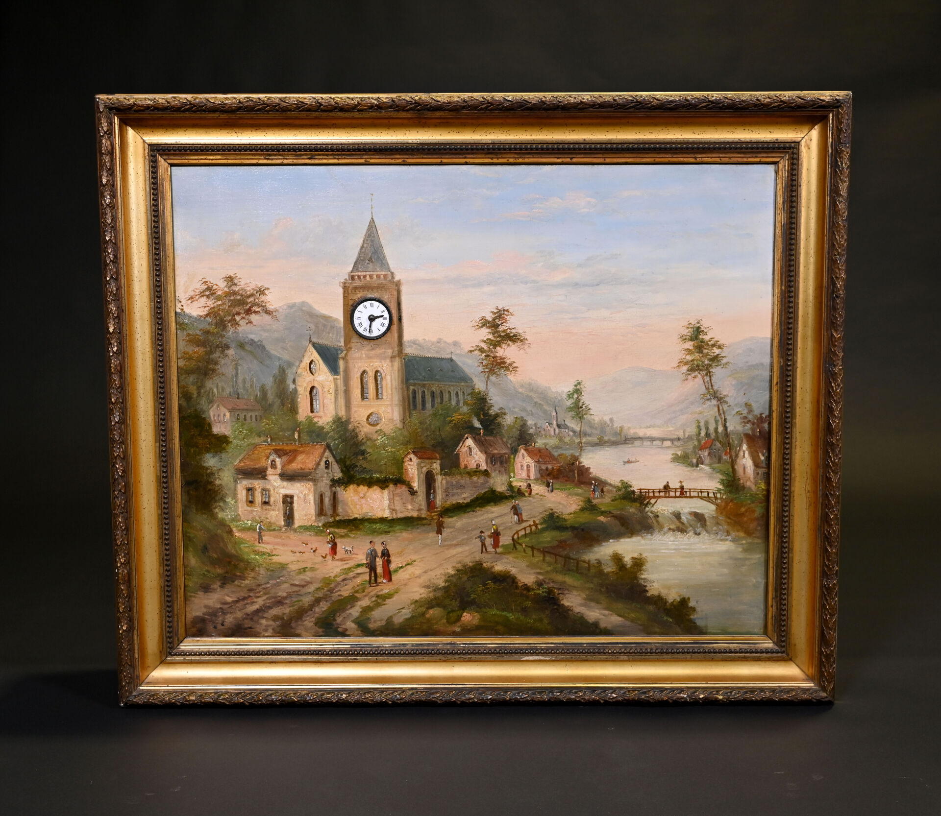 PHALIBOIS. Tableau carillon dit « tableau à horloge », l’huile sur toile représentant un village en bord de rivière (agrafes fixant la toile au cadre à refixer) . Mécanisme à balancier et musique à cylindre avec 8 airs, numéro 16740. Avec balancier et clé. Etiquettes à l’intérieur « PHALIBOIS 22 rue Charlot, Paris ». Haut. : 80 cm – Larg. : 96 cm – Prof. : 18 cm.