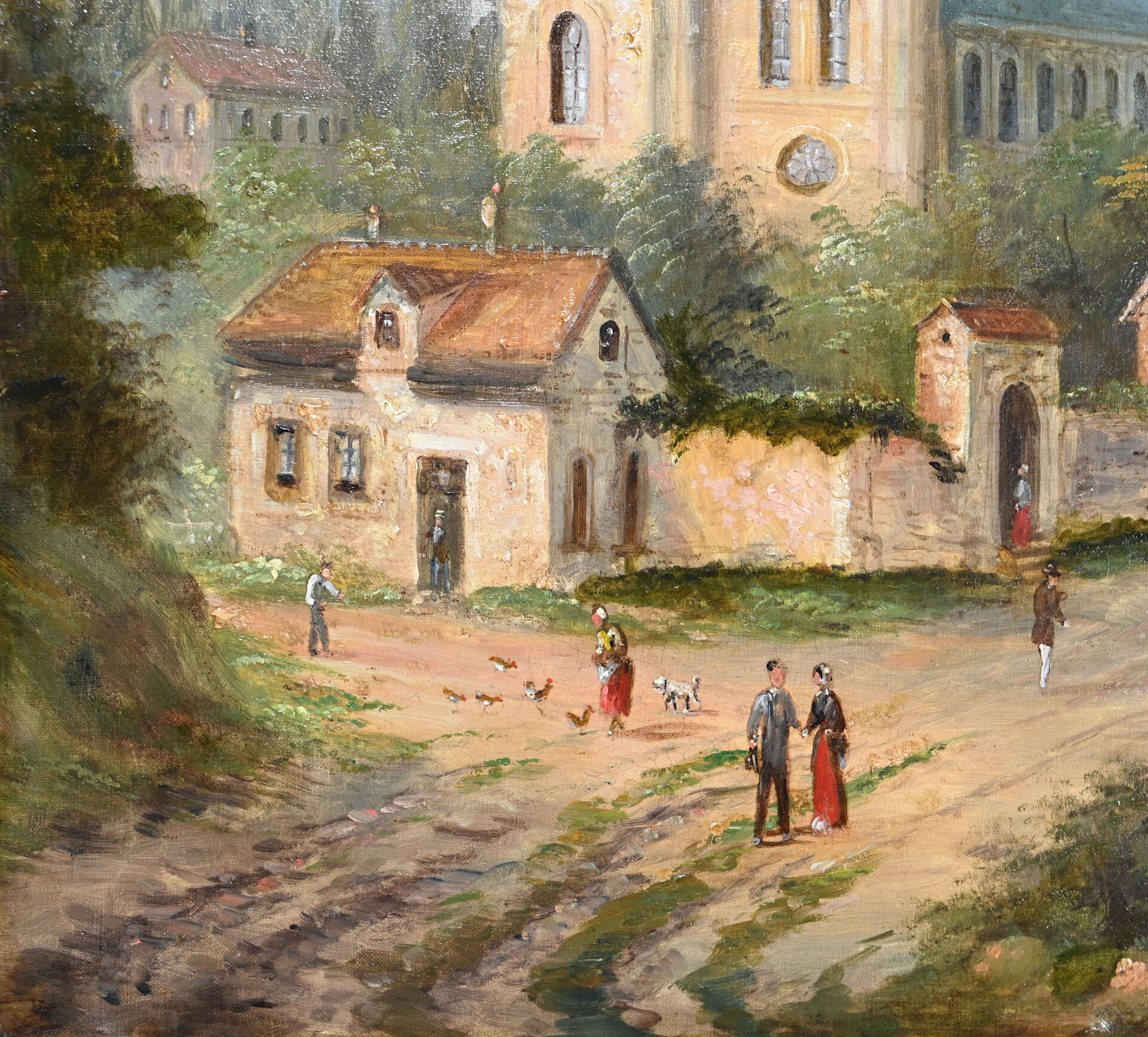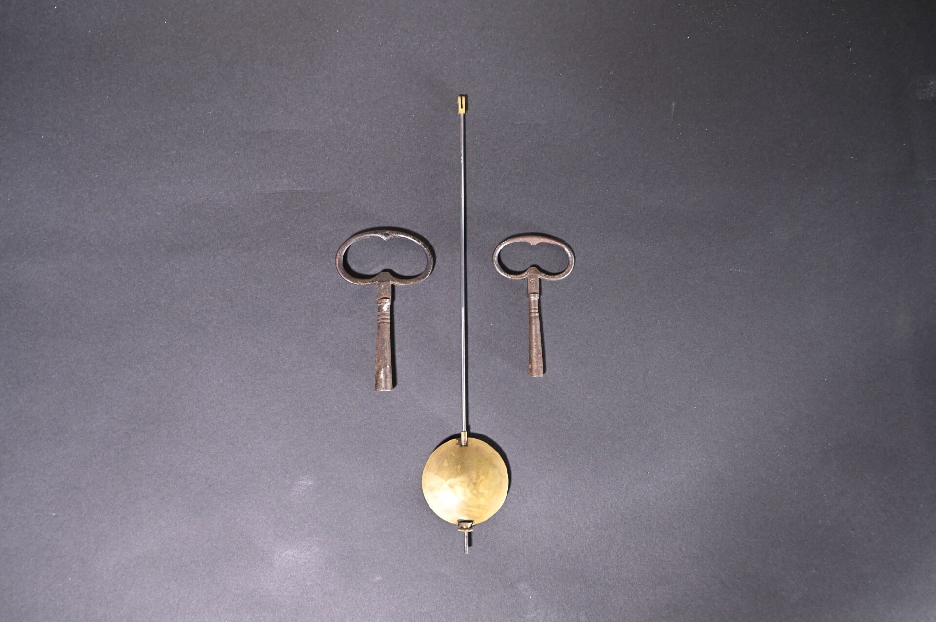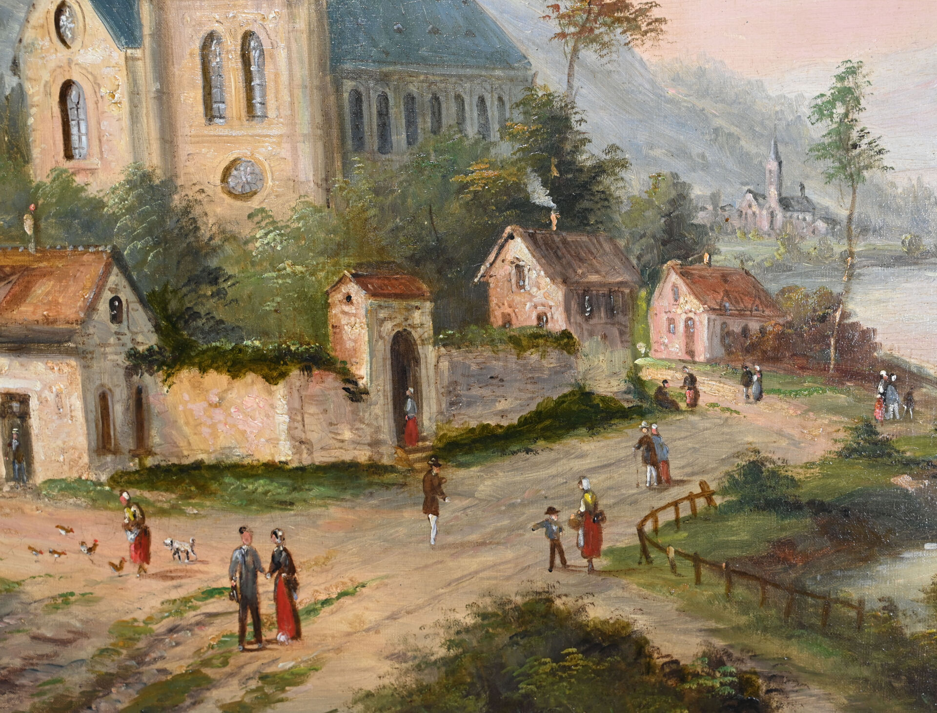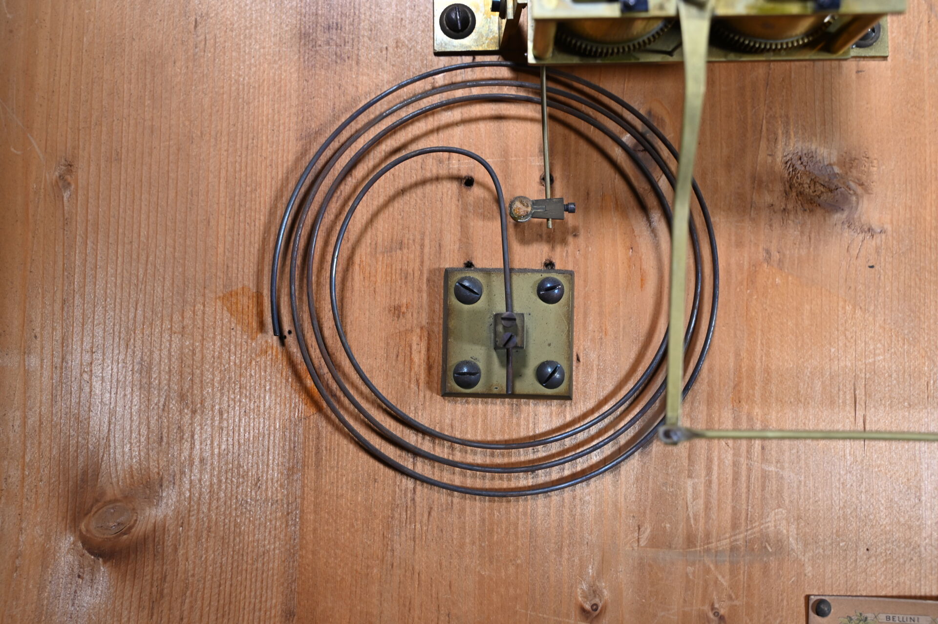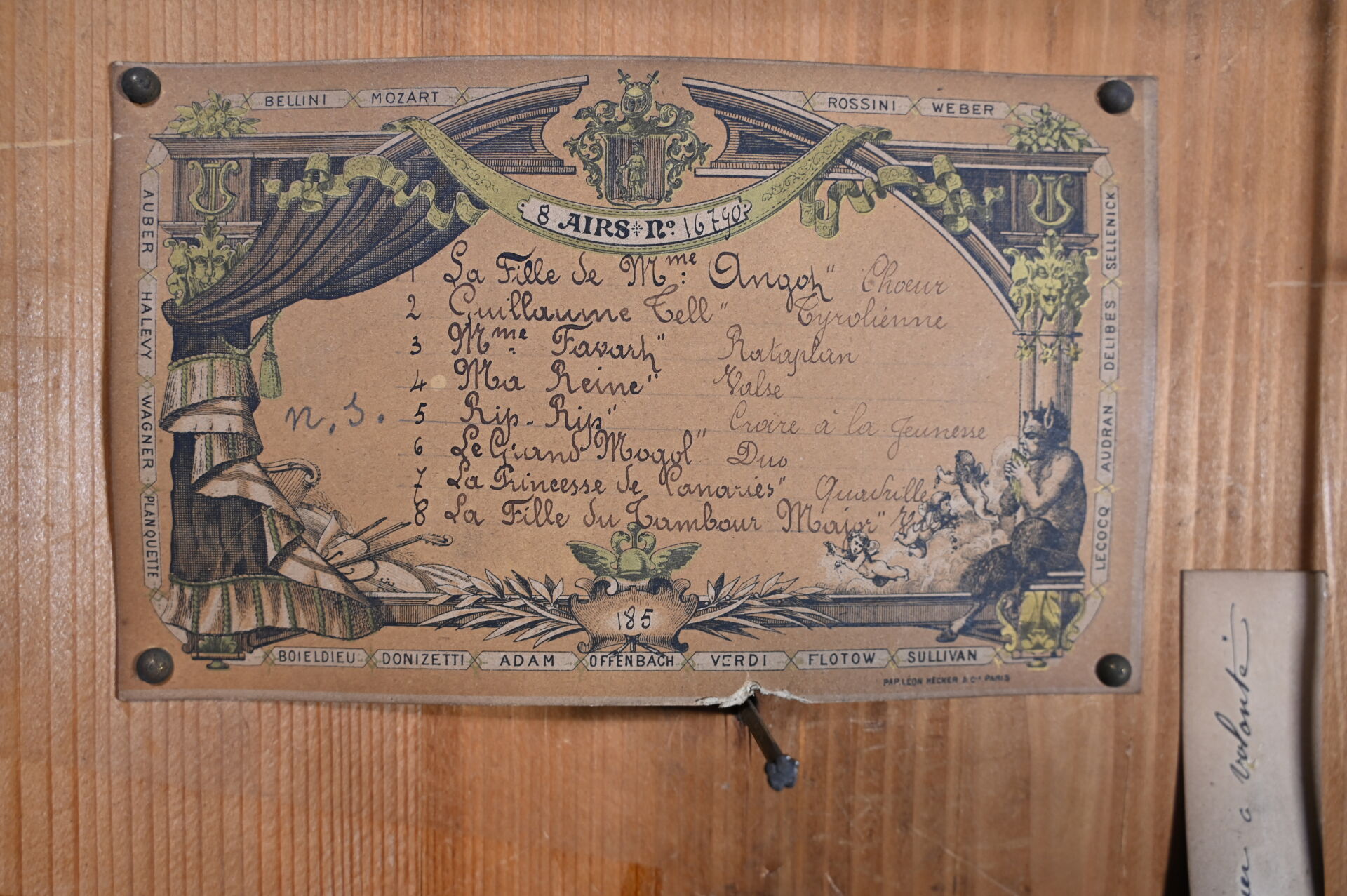 PHALIBOIS. Tableau carillon dit « tableau à horloge », l’huile sur toile représentant un village en bord de rivière (agrafes fixant la toile au cadre à refixer) . Mécanisme à balancier et musique à cylindre avec 8 airs, numéro 16740. Avec balancier et clé. Etiquettes à l’intérieur « PHALIBOIS 22 rue Charlot, Paris ». Haut. : 80 cm – Larg. : 96 cm – Prof. : 18 cm.