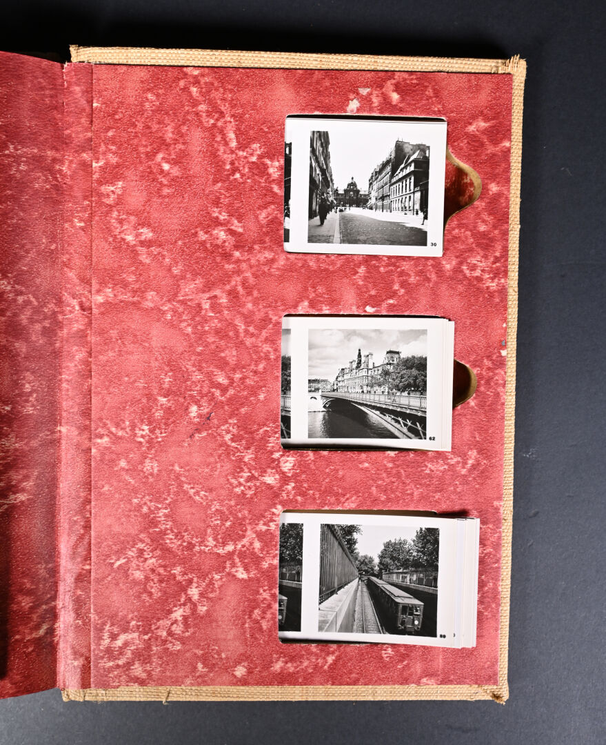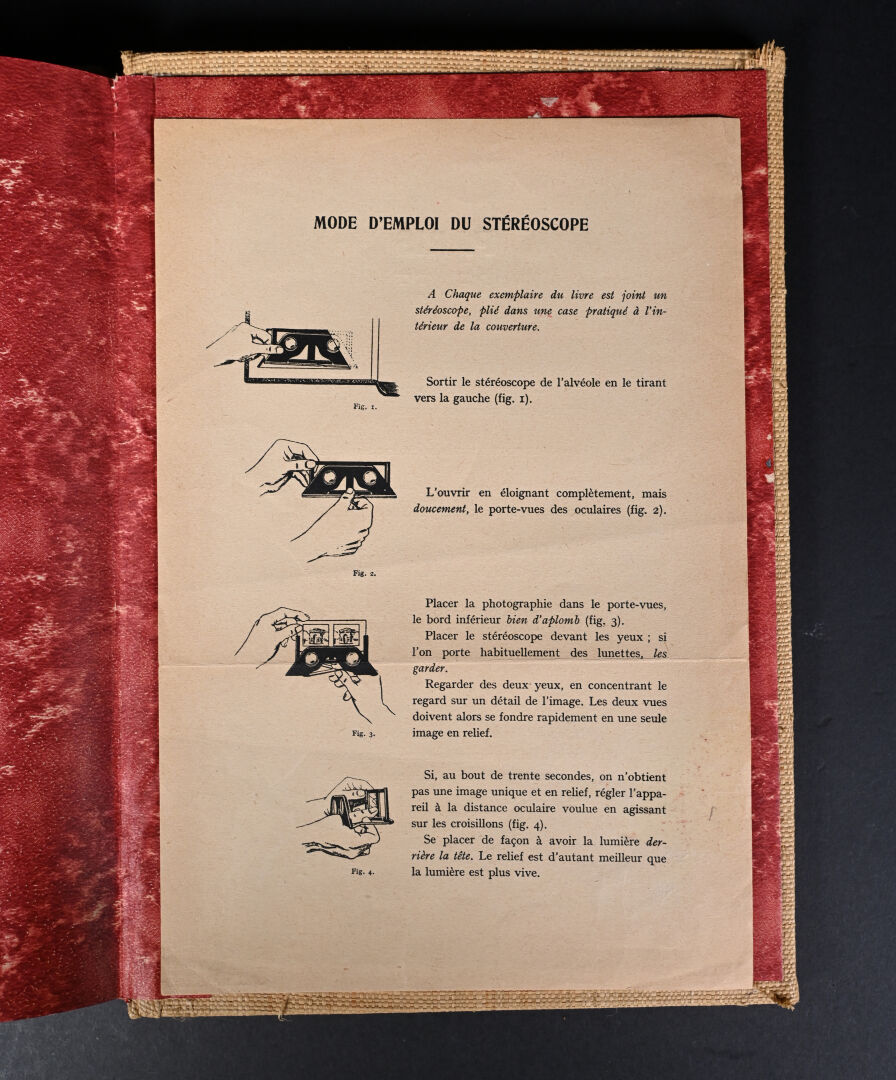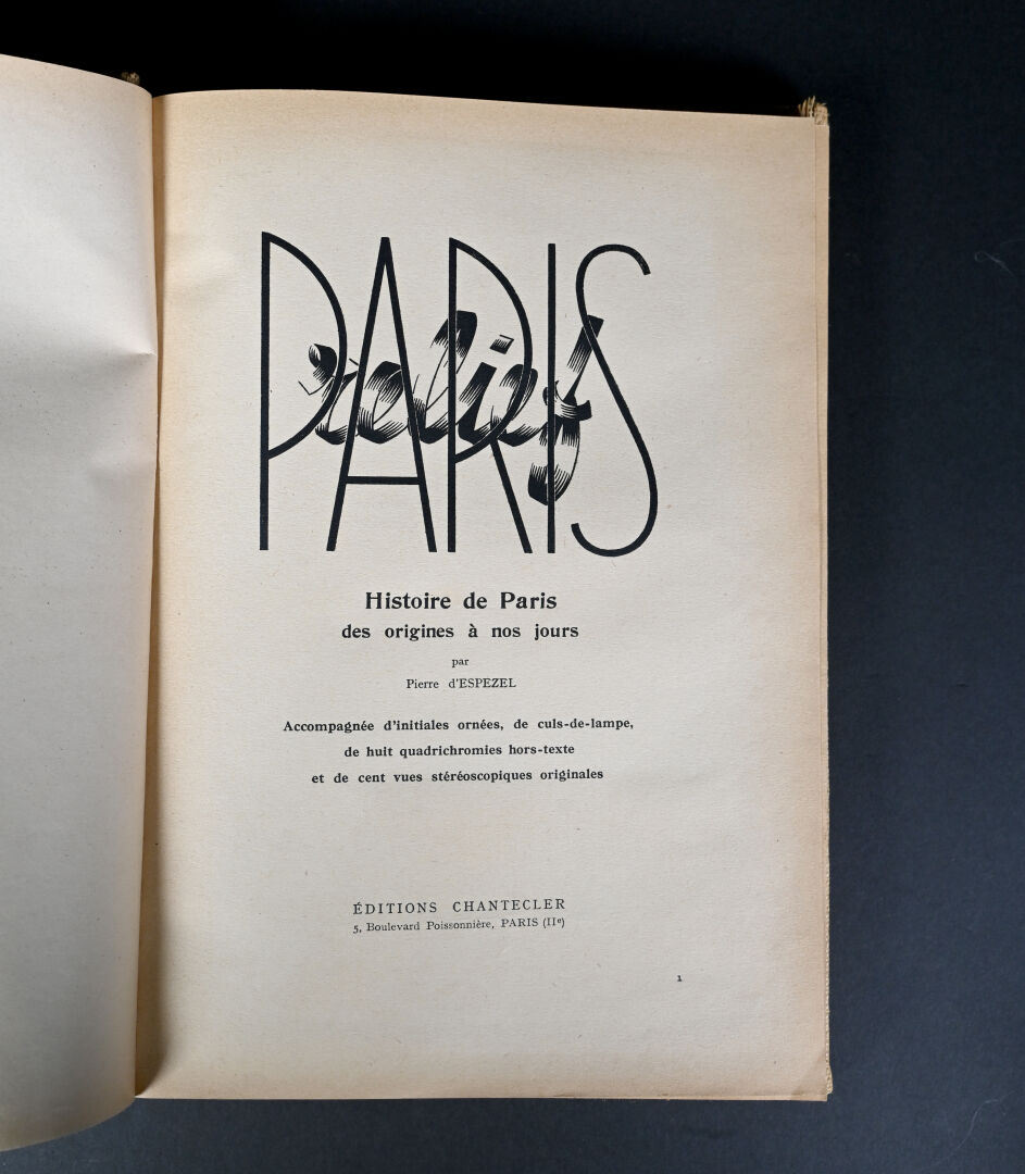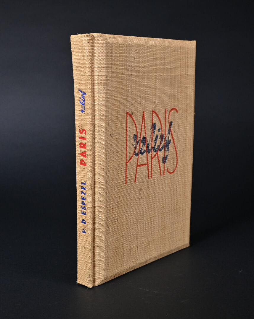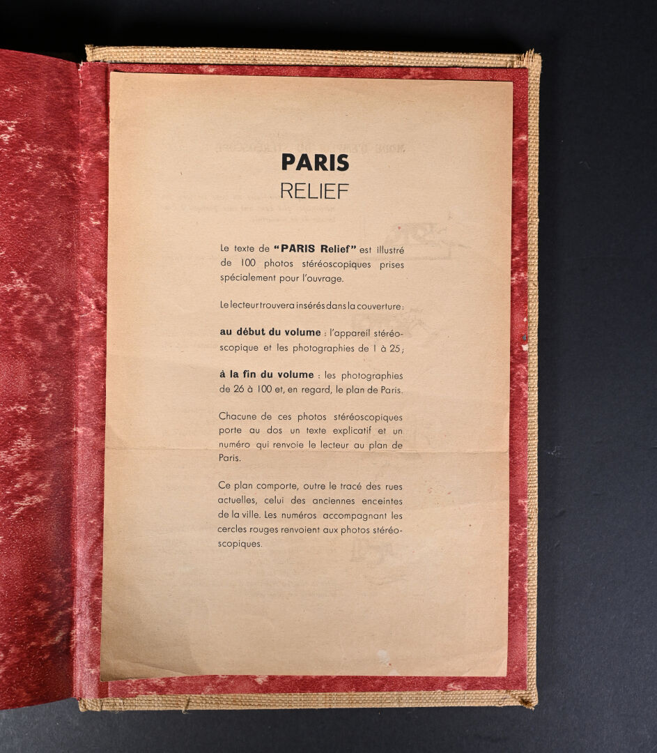 [PHOTOGRAPHIE]. ESPEZEL (Jean d’). PARIS RELIEF. Histoire de Paris des origines à nos jours. Paris, Éditions Chanteclerc, [1945]. In-4 de toile de jute grège de l’éditeur, plats biseautés, titre au dos en long et sur le 1er plat. ÉDITION ORIGINALE du 1er album de la collection « Relief ». Il contient 8 planches h.-t. couleurs, 100 VUES STÉRÉOSCOPIQUES originales et un STÉRÉOSCOPE. Tirage limité à 500 EXEMPLAIRES numérotés. Bien complet du feuillet « Mode d’emploi du stéréoscope » ; manque le PLAN dépliant couleurs de Paris.