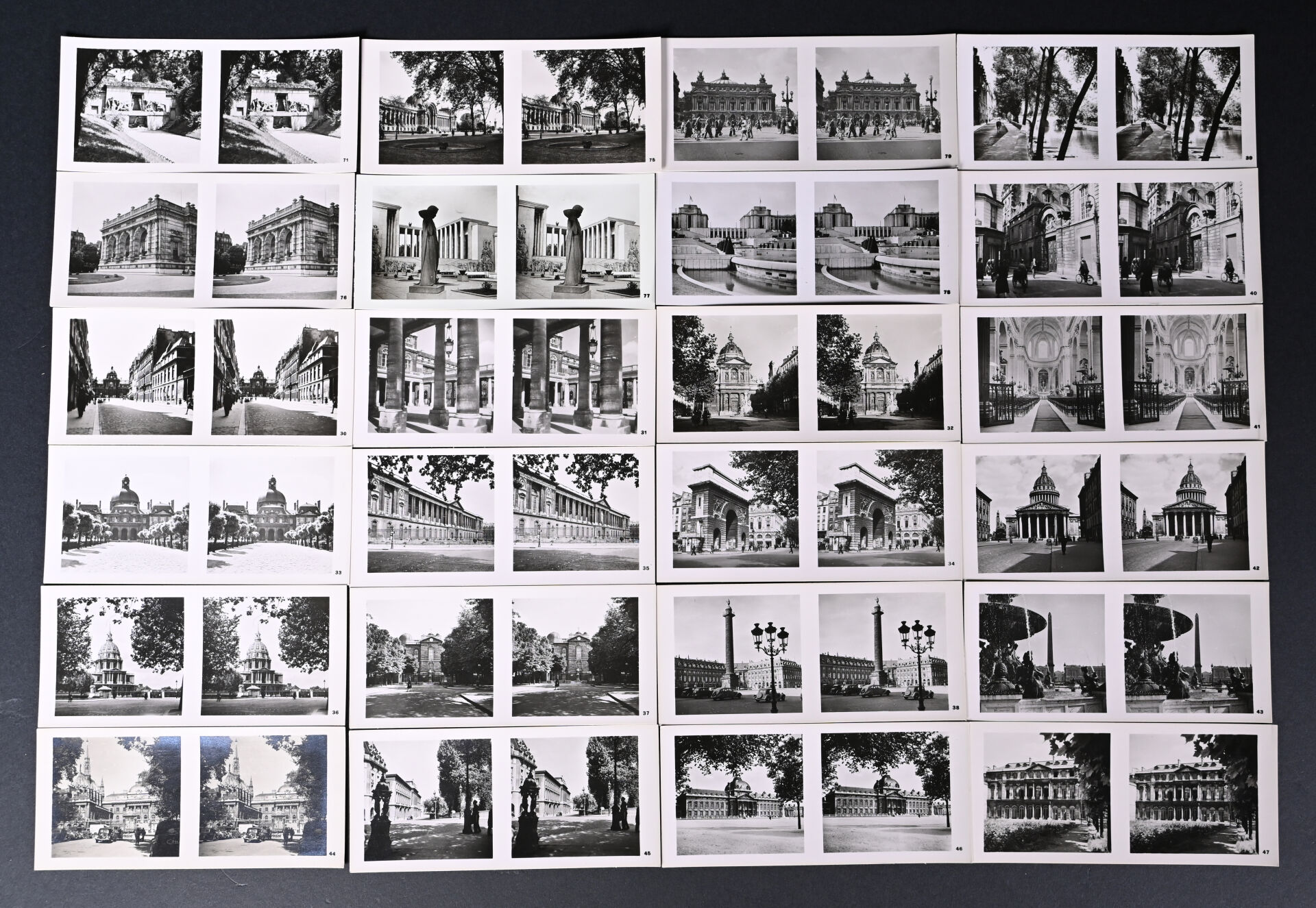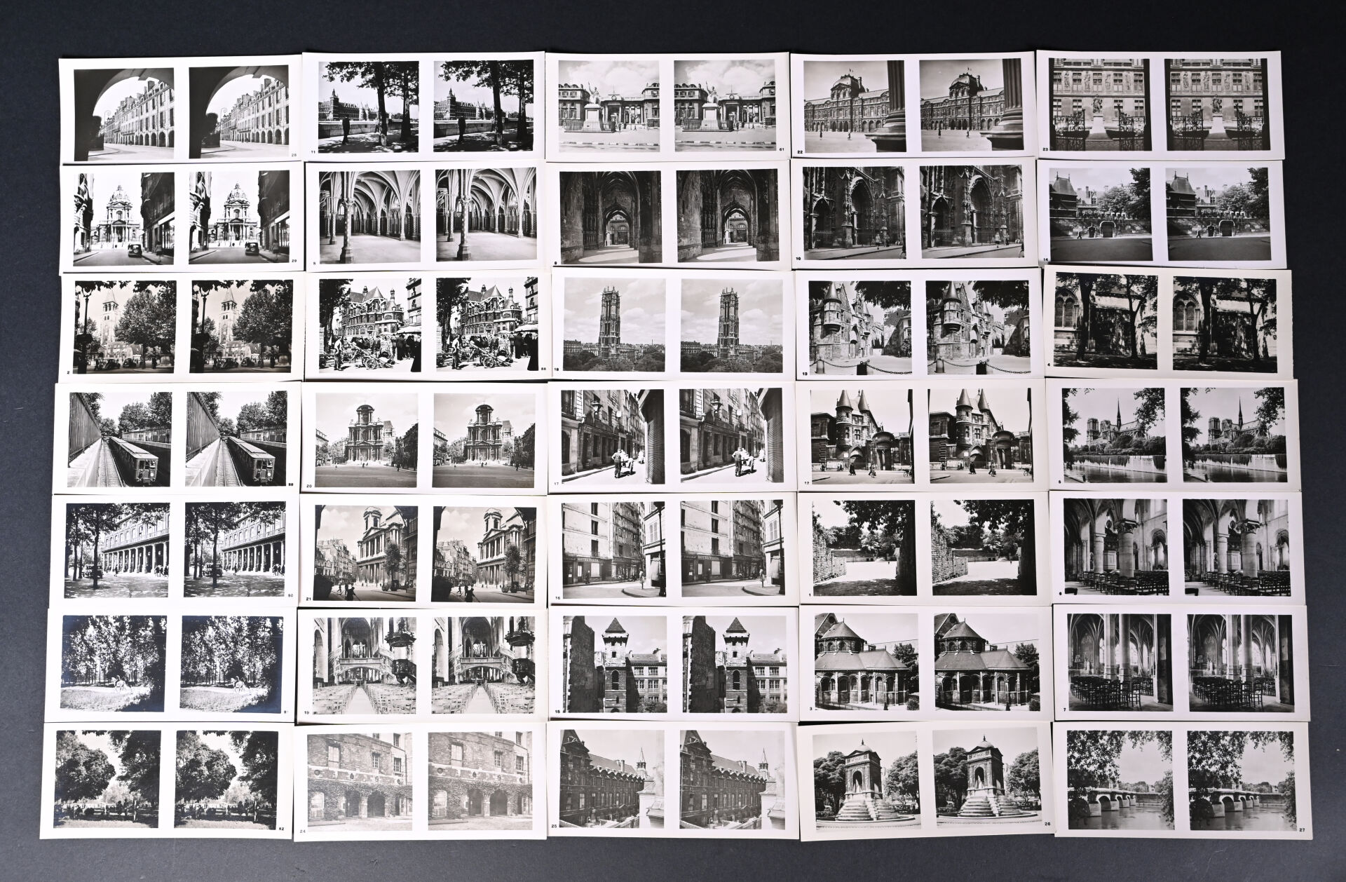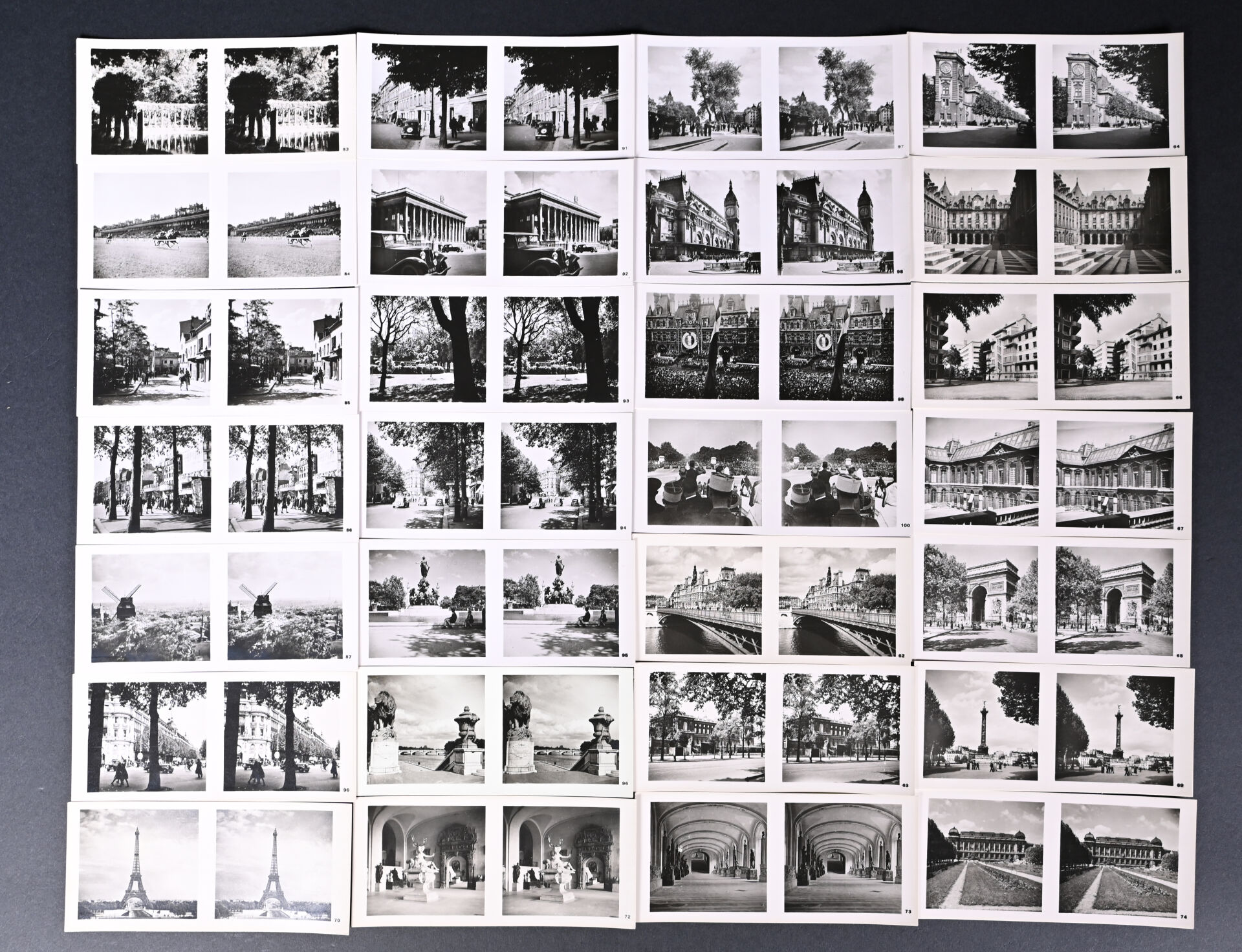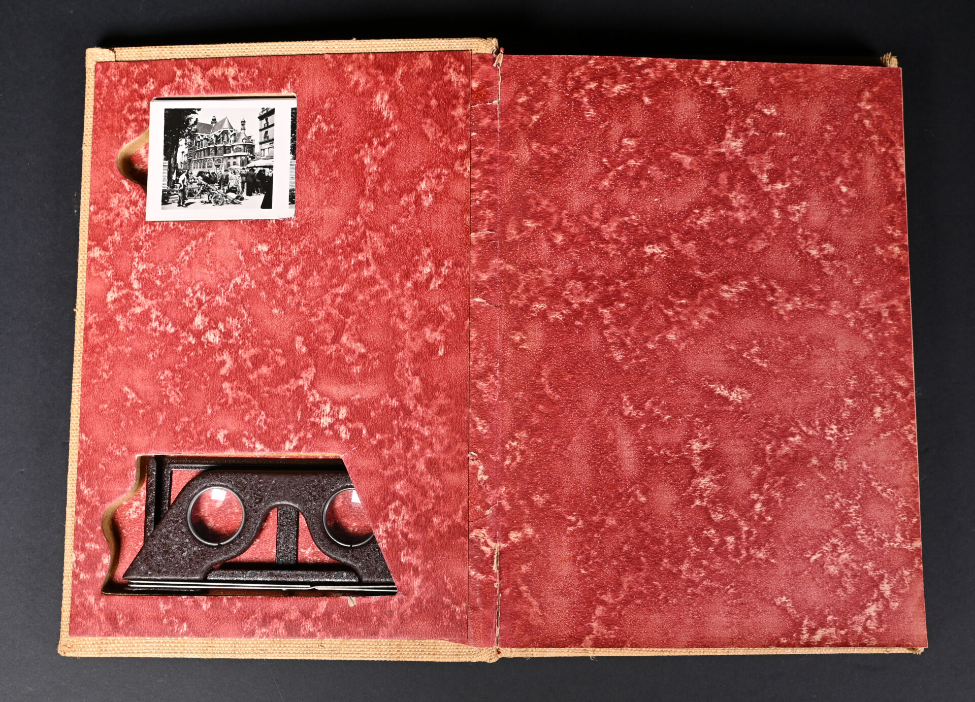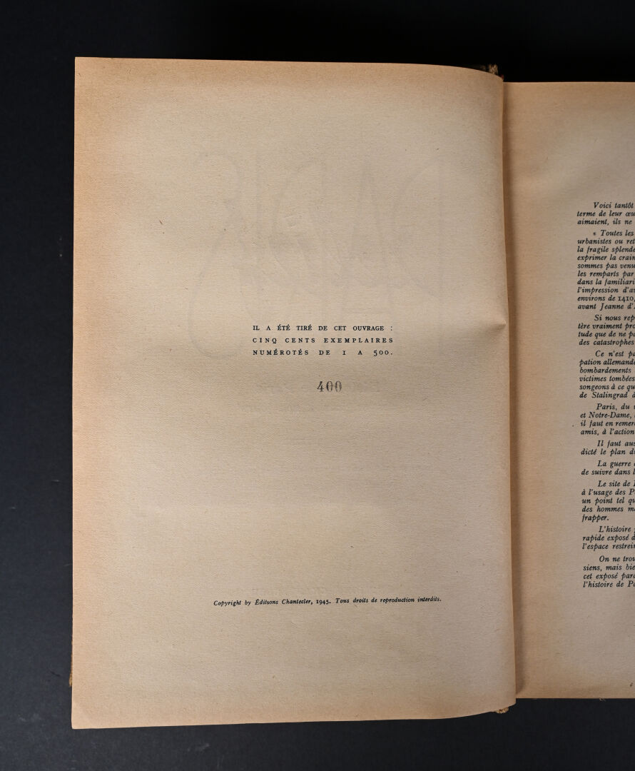 [PHOTOGRAPHIE]. ESPEZEL (Jean d’). PARIS RELIEF. Histoire de Paris des origines à nos jours. Paris, Éditions Chanteclerc, [1945]. In-4 de toile de jute grège de l’éditeur, plats biseautés, titre au dos en long et sur le 1er plat. ÉDITION ORIGINALE du 1er album de la collection « Relief ». Il contient 8 planches h.-t. couleurs, 100 VUES STÉRÉOSCOPIQUES originales et un STÉRÉOSCOPE. Tirage limité à 500 EXEMPLAIRES numérotés. Bien complet du feuillet « Mode d’emploi du stéréoscope » ; manque le PLAN dépliant couleurs de Paris.