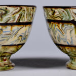 PICHON à UZES. Deux bols à olives et leurs coupes en forme de feuilles en terre mêlée. Marqués en creux au tampon au dessous. Haut. d’un bol. : 7 cm.