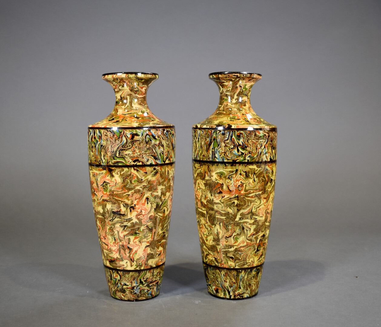 PICHON à Uzès. Paire de vases fuselés à cols resserrés en terre mêlée dans les tons ocre et bruns. Un marqué sous la base. Haut. : 35,5 cm.