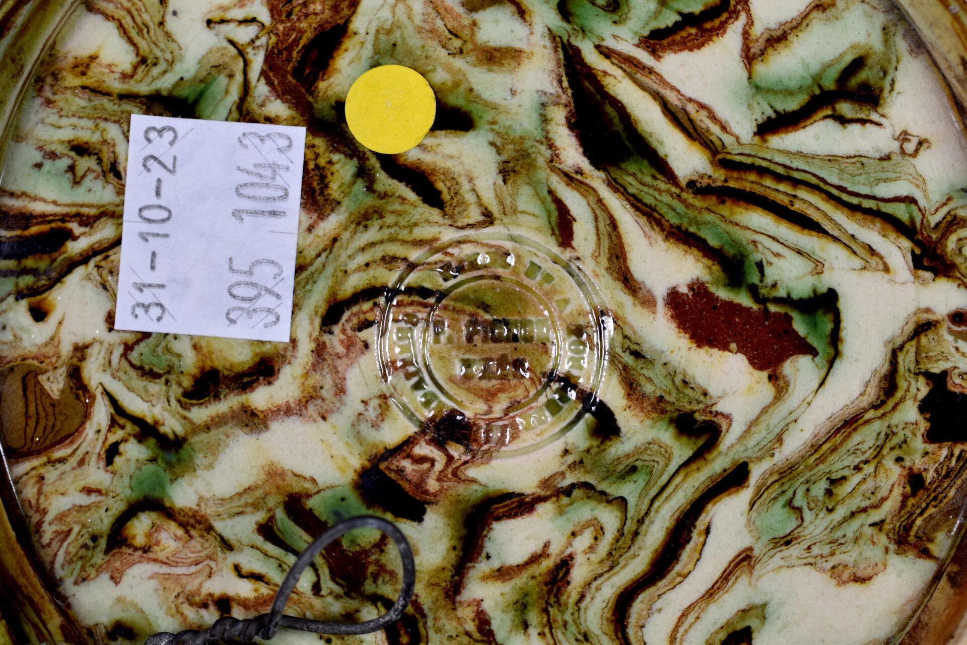 PICHON à UZES. Suite de 3 assiettes en terre-mêlée (une avec un fêle). Marquées en creux au tampon au dessous. Diam. : 21 cm.