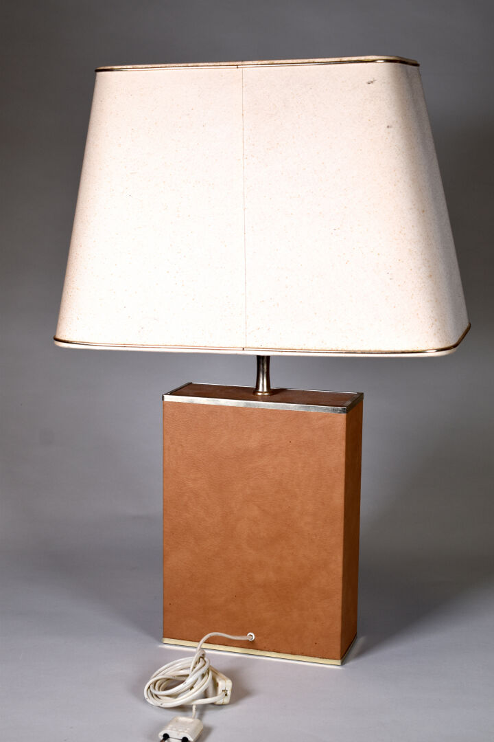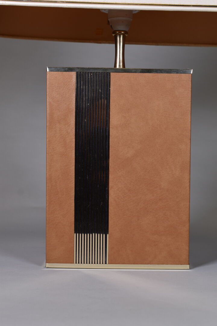 Pied de lampe de section rectangulaire gainé de skaï fauve et barrettes de plastique doré et laiton. Vers 1970. Haut. avec abat-jour : 66 cm.
