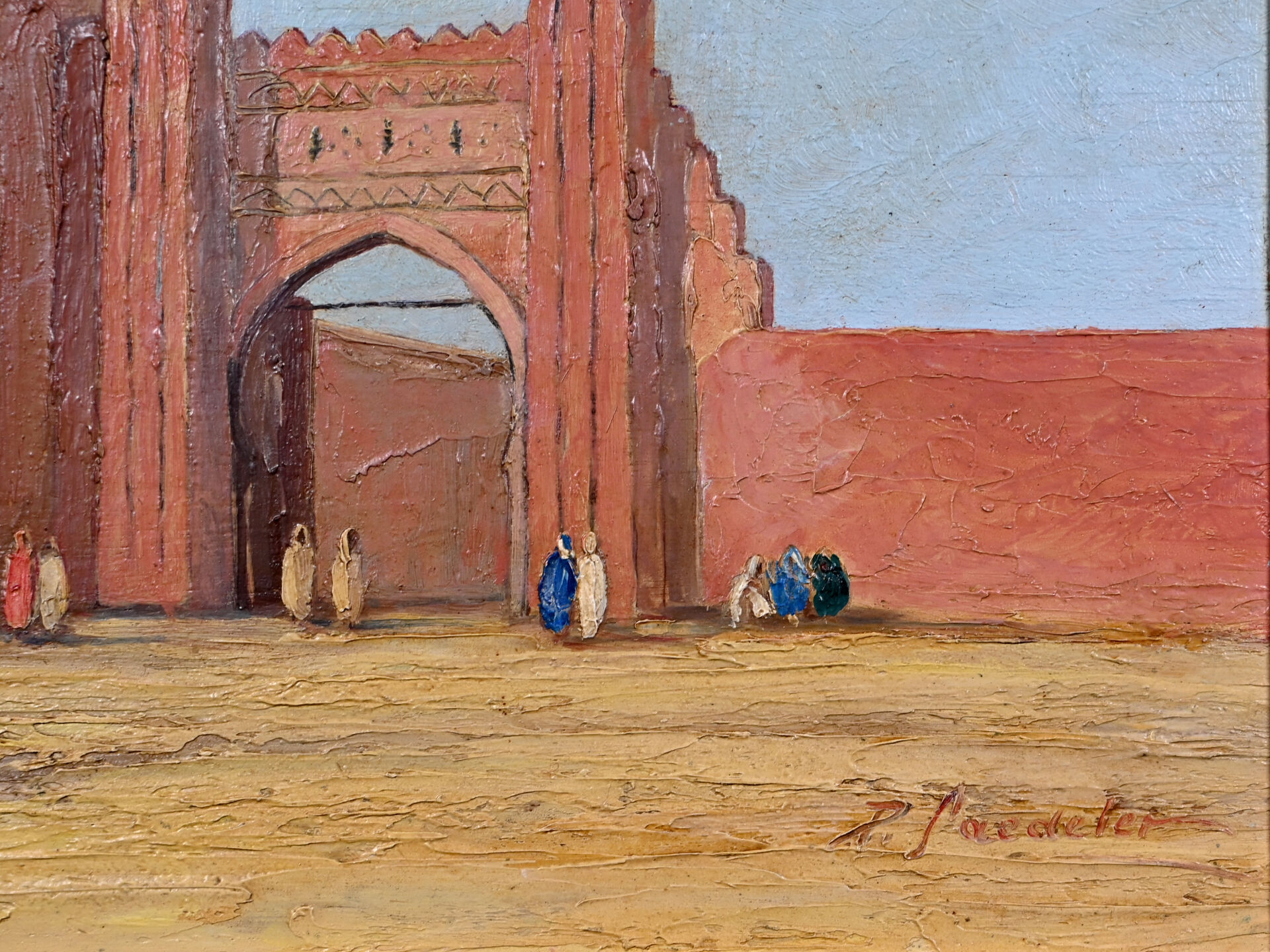 Pierre DE SAEDELER (XXe sièce). Porte de village, Afrique du Nord. Huile sur panneau signée en bas à droite. 27 x 36 cm.
