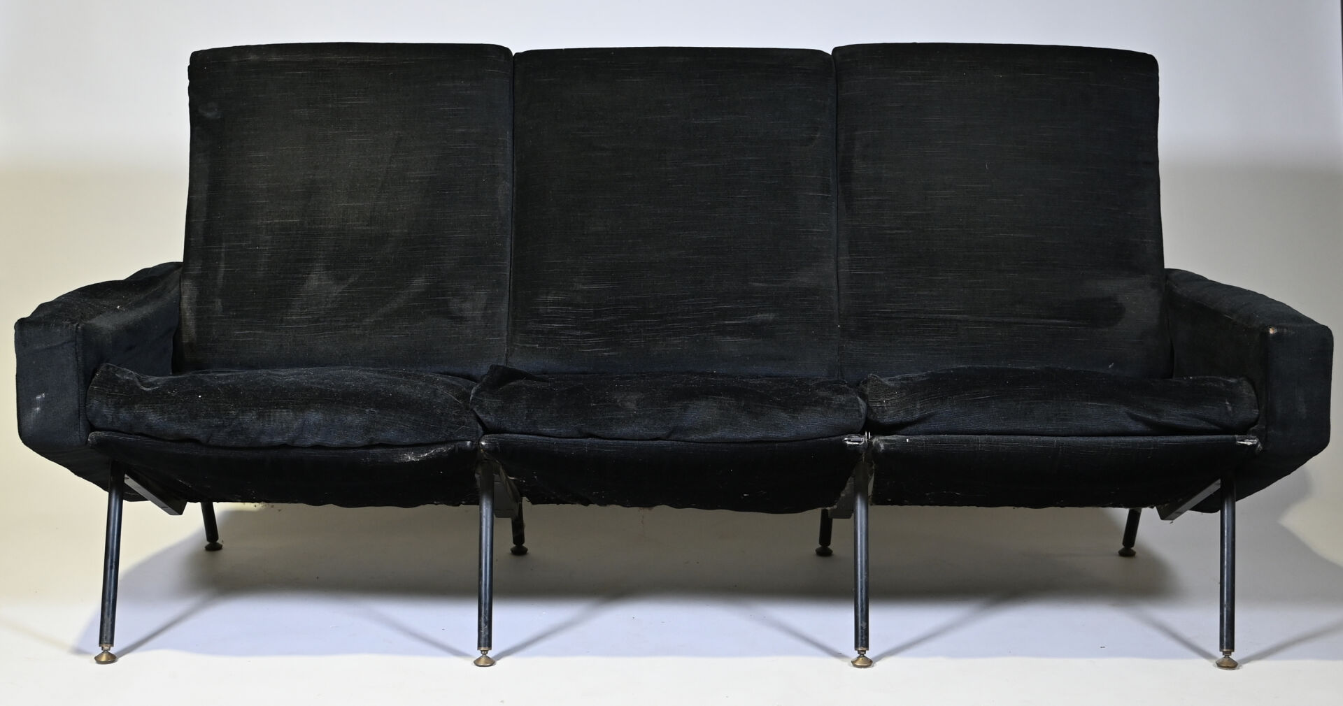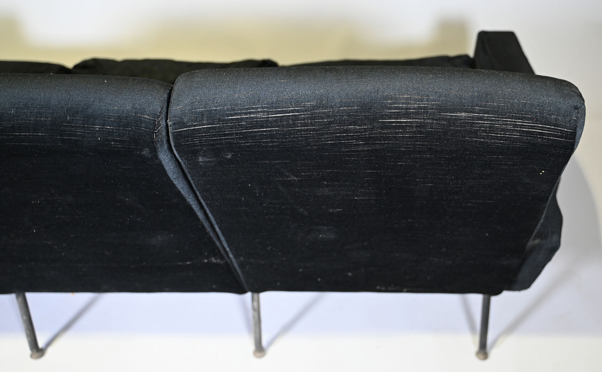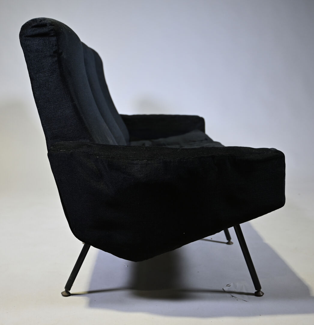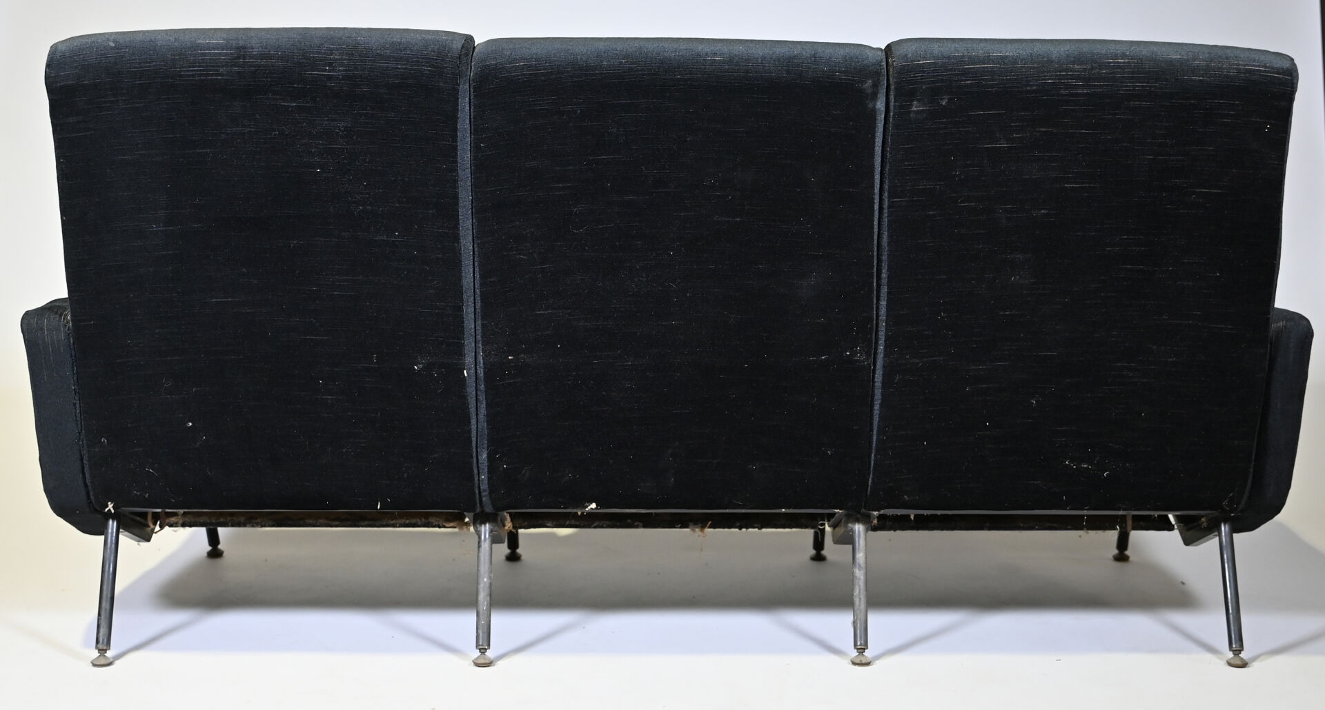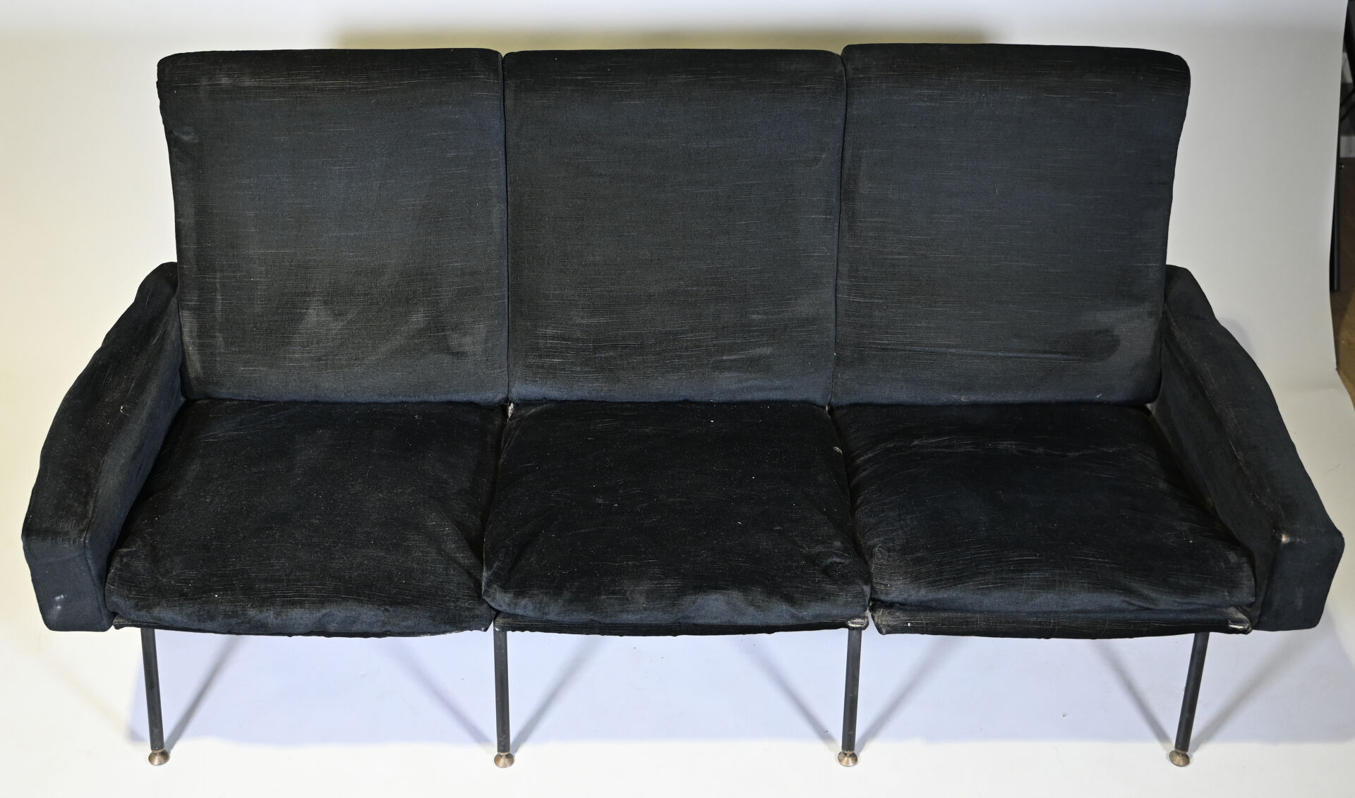 Pierre GUARICHE (1926-1995). Canapé troïka 3 places garni de velours noir (usures) Piètement métallique. Haut. : 85 cm Larg. : 180 cm. Prof. : 78 cm.