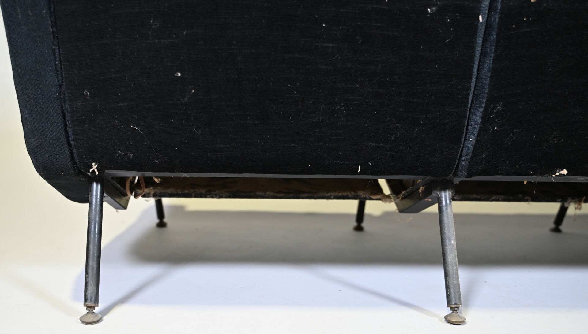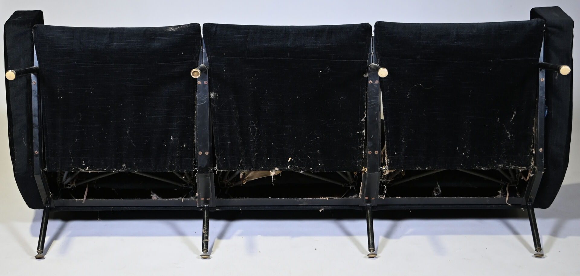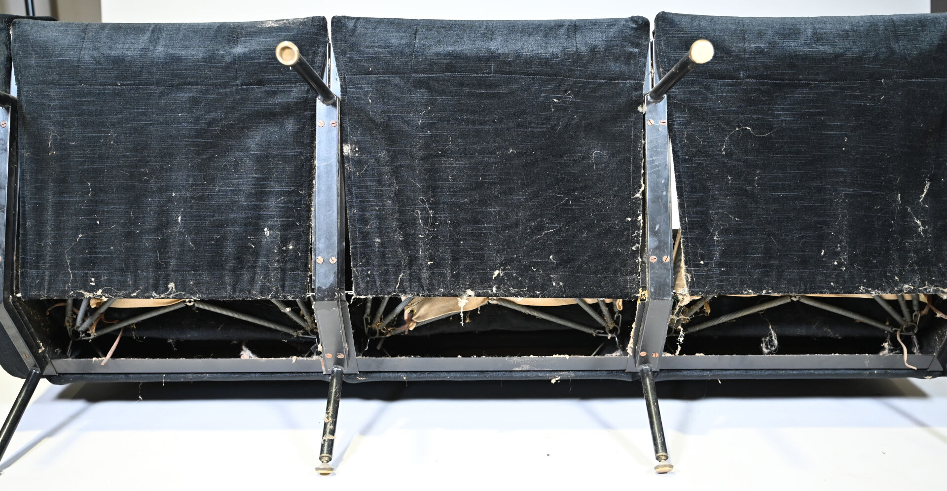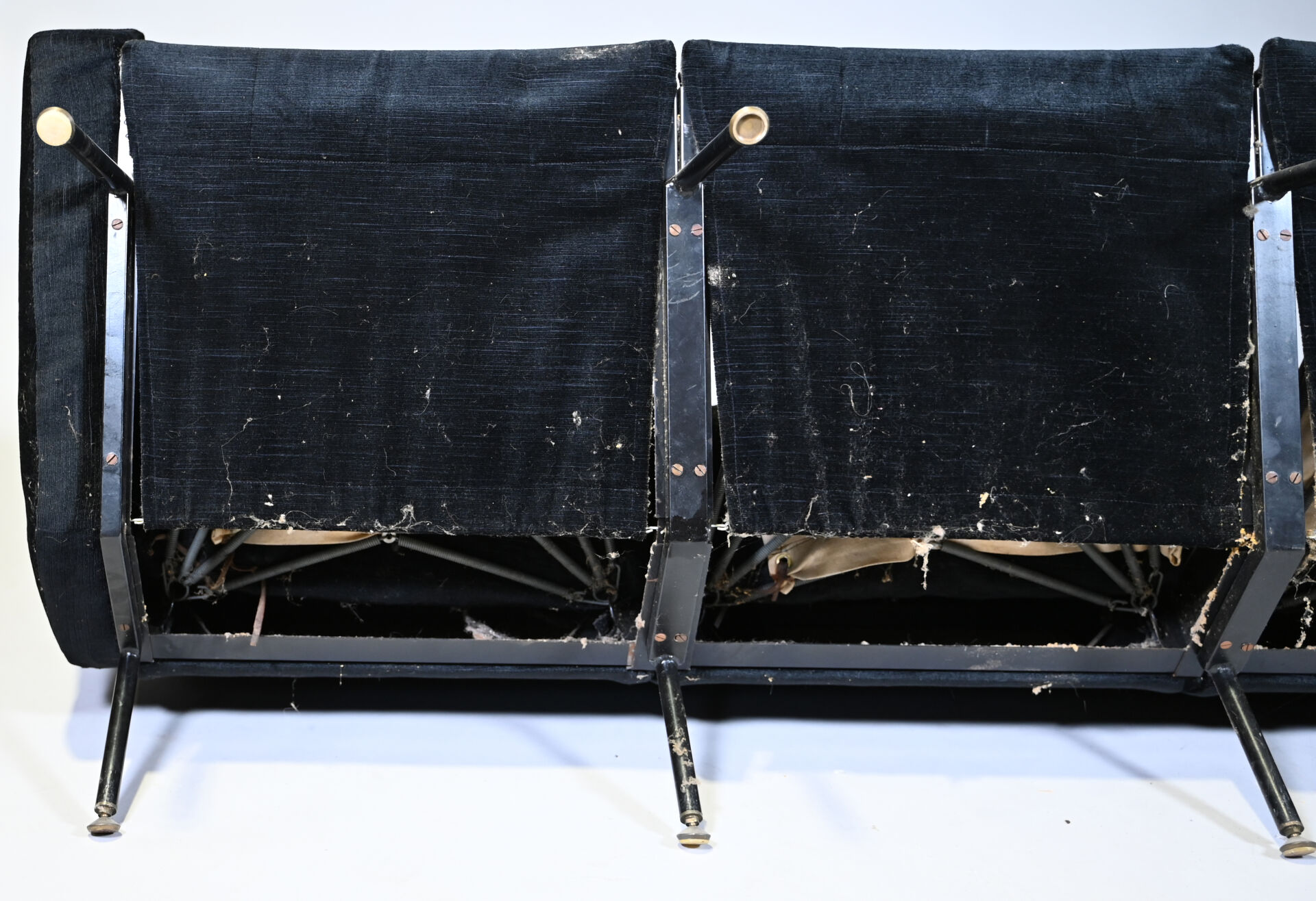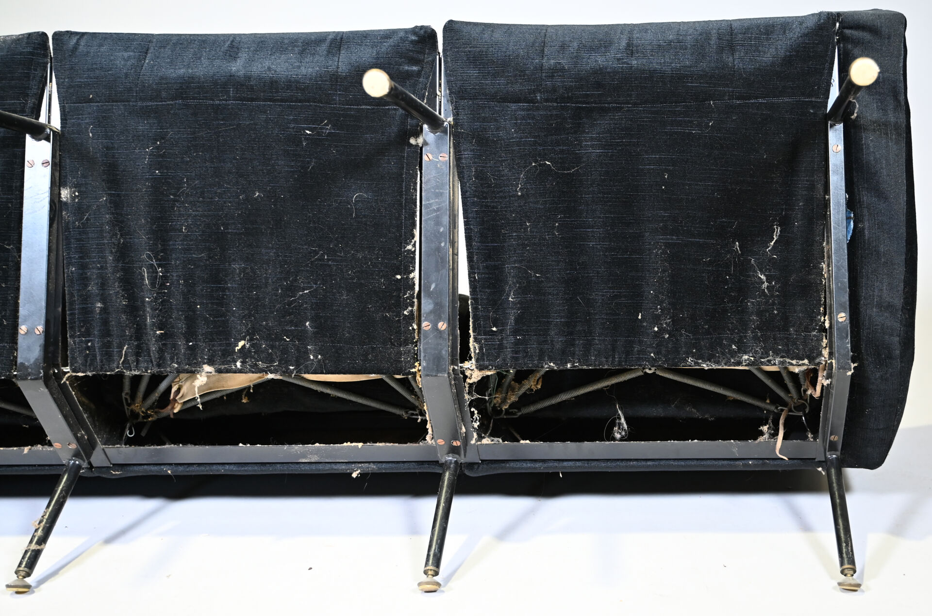 Pierre GUARICHE (1926-1995). Canapé troïka 3 places garni de velours noir (usures) Piètement métallique. Haut. : 85 cm Larg. : 180 cm. Prof. : 78 cm.