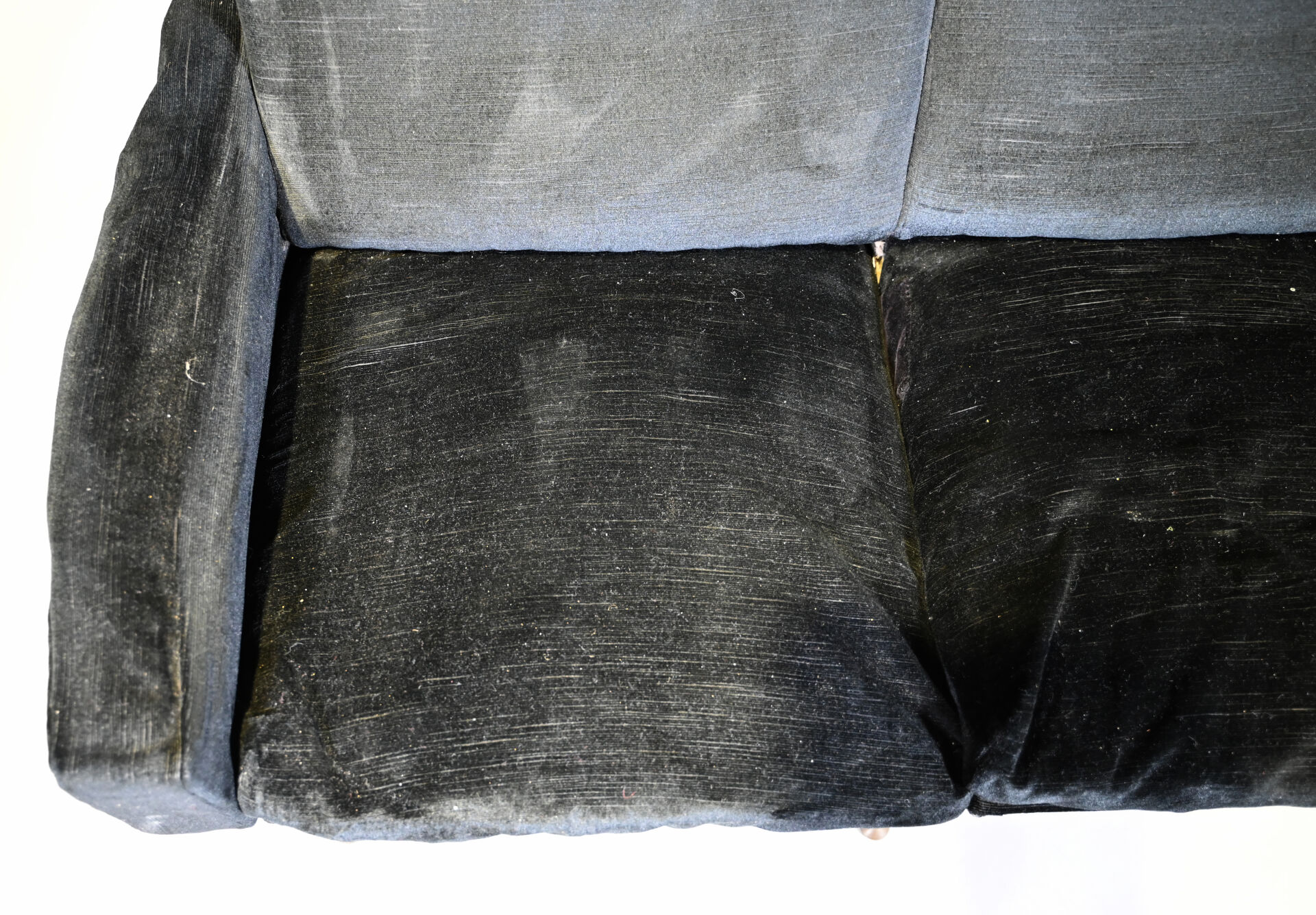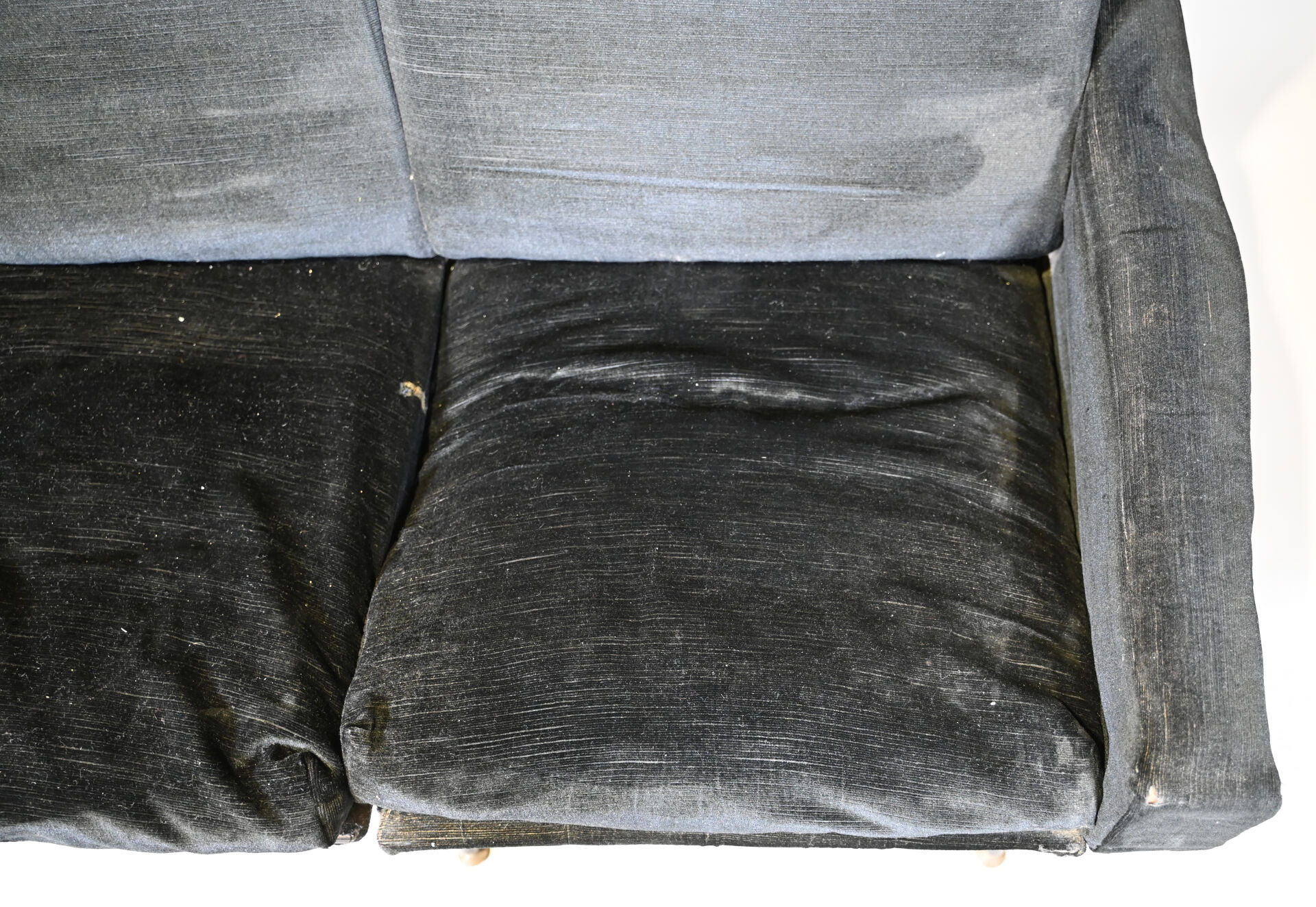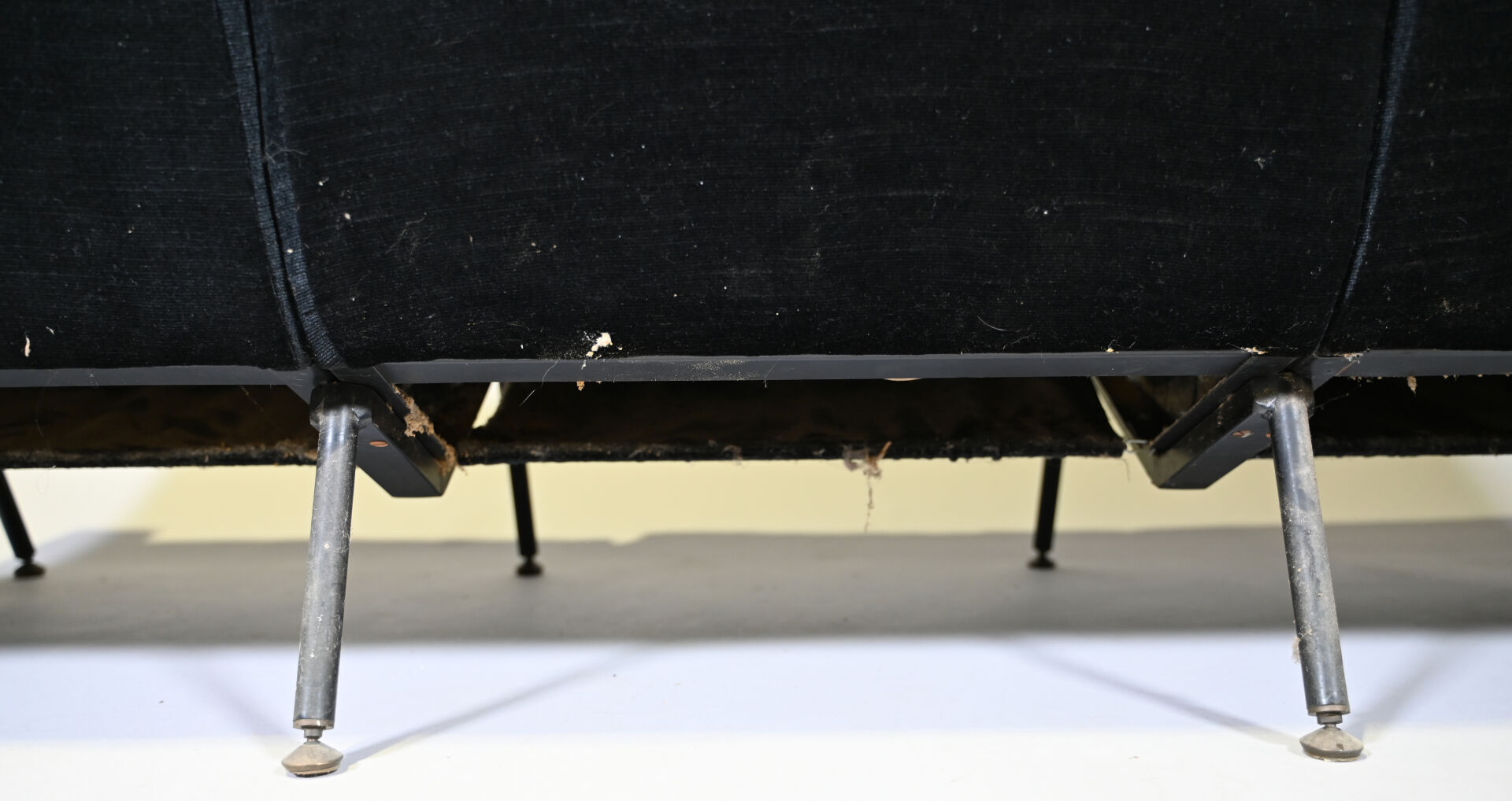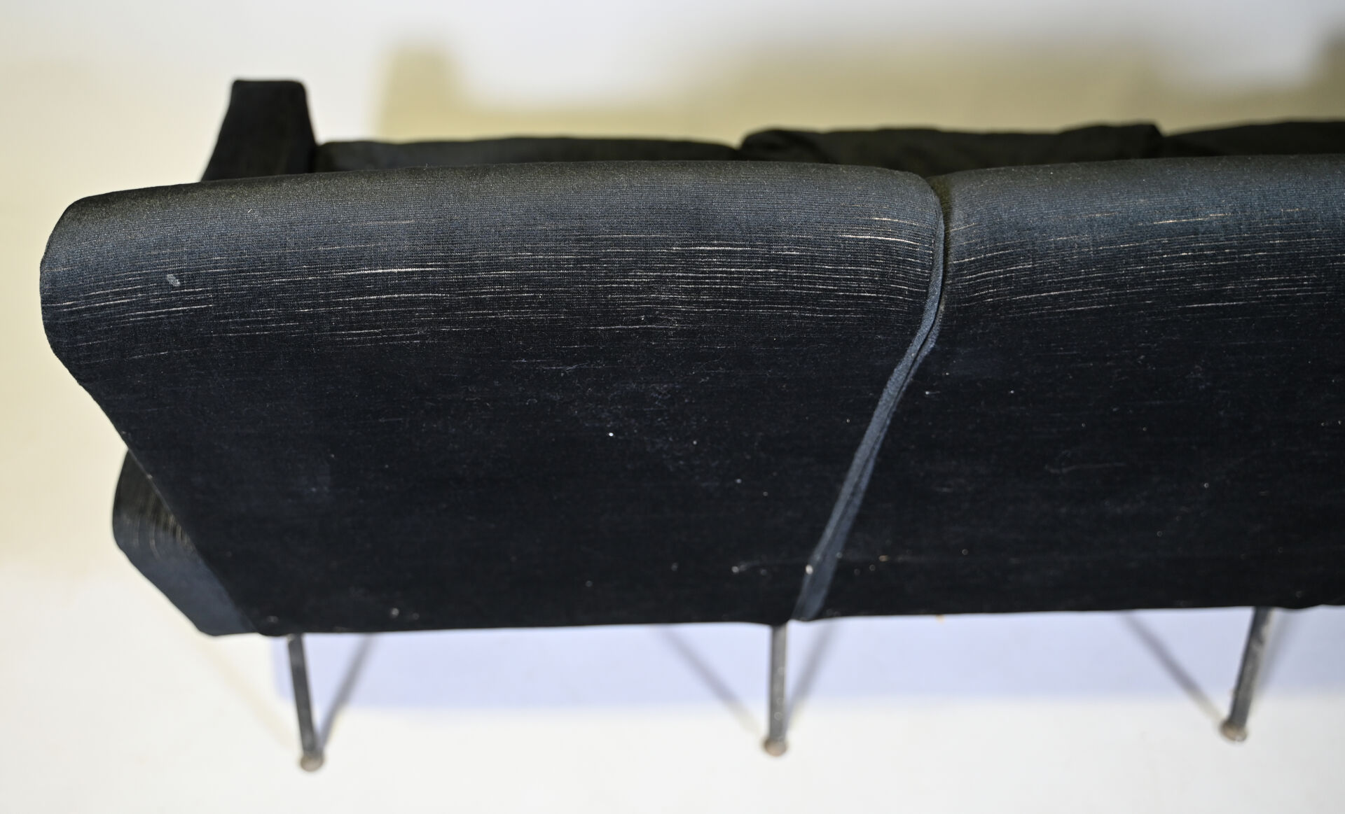 Pierre GUARICHE (1926-1995). Canapé troïka 3 places garni de velours noir (usures) Piètement métallique. Haut. : 85 cm Larg. : 180 cm. Prof. : 78 cm.