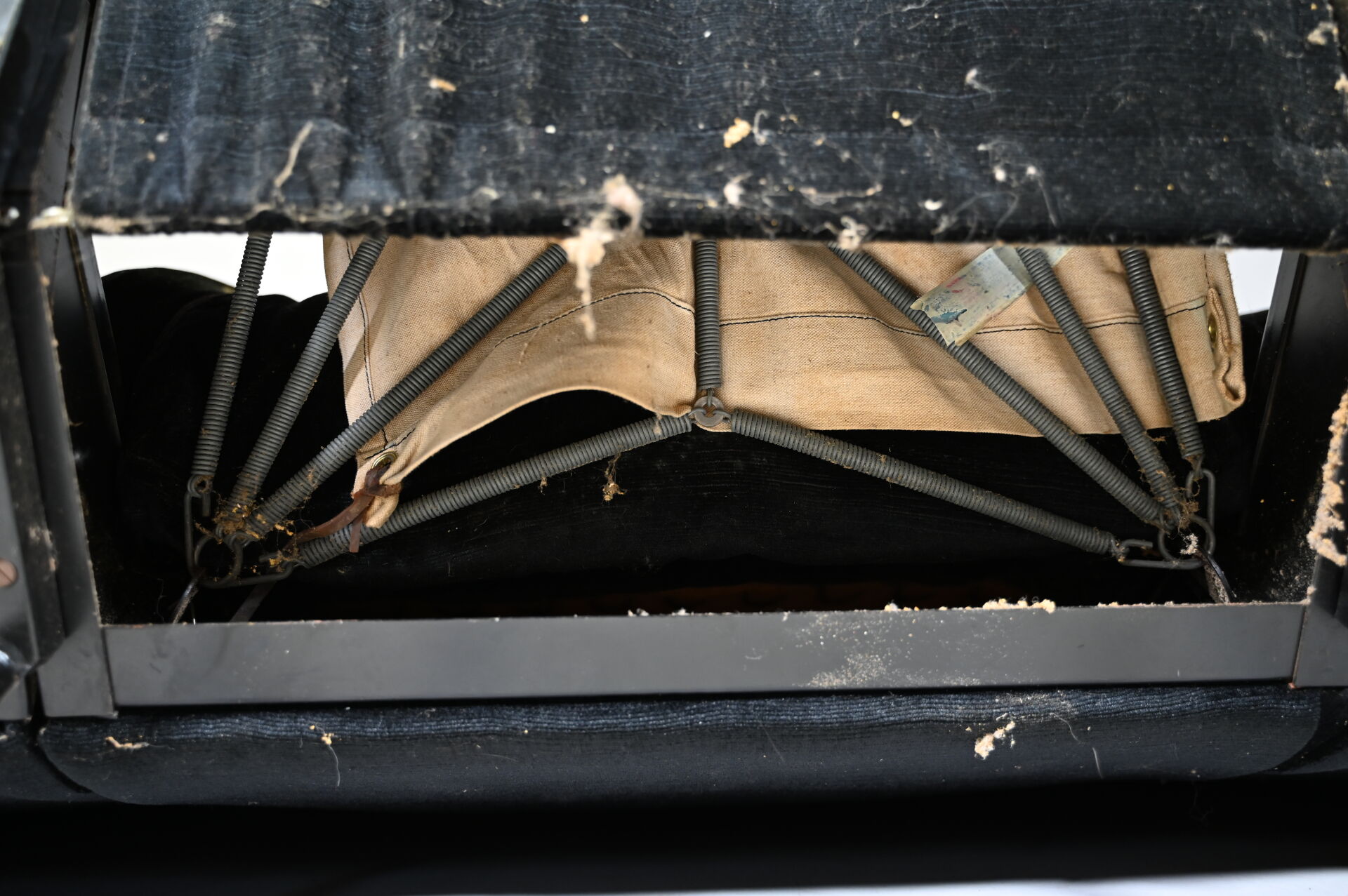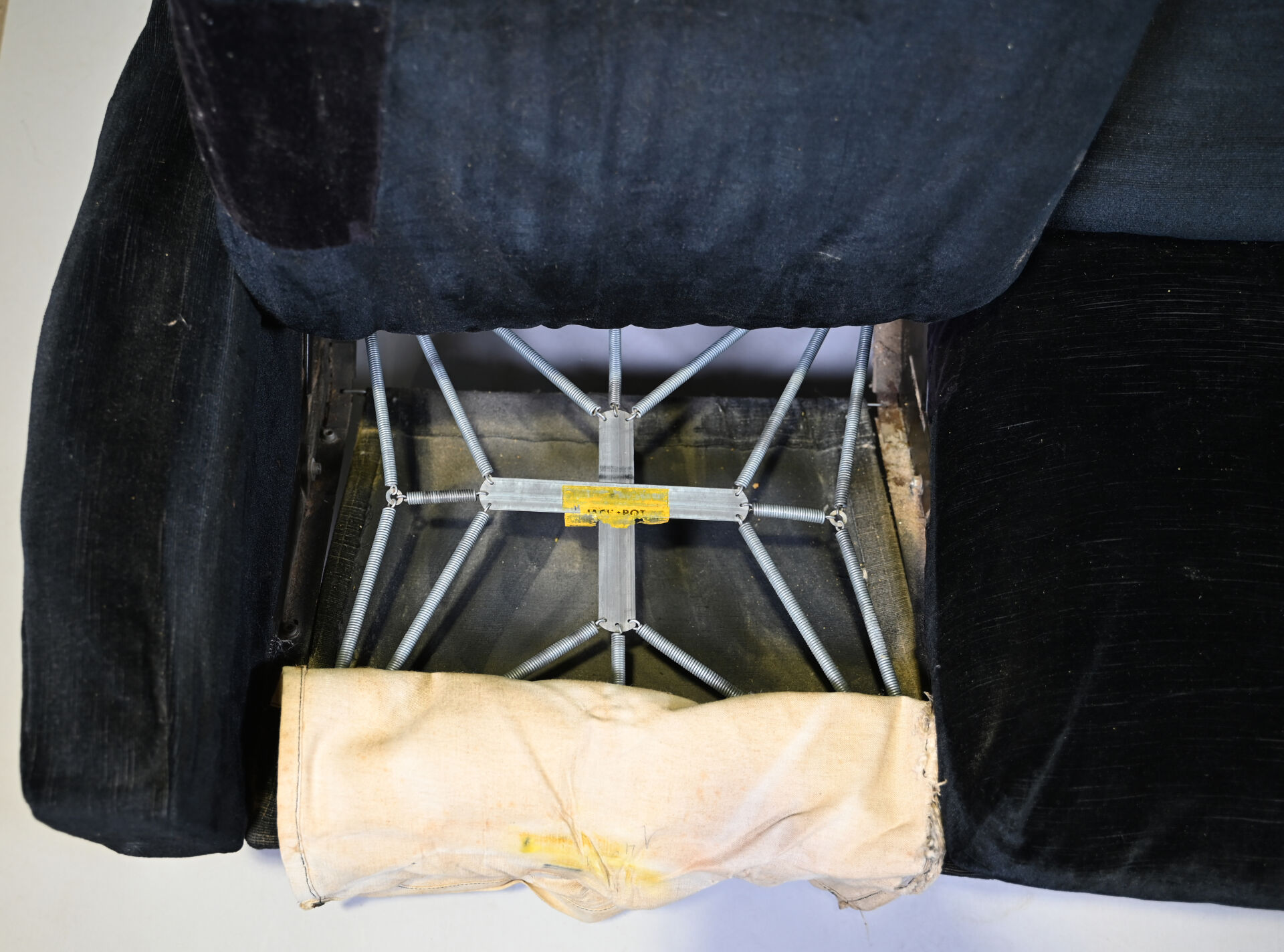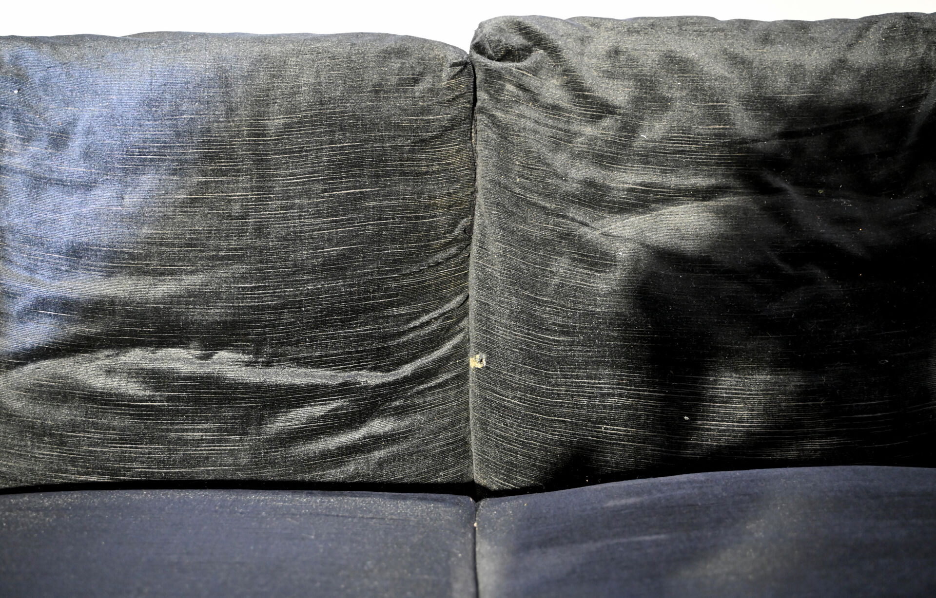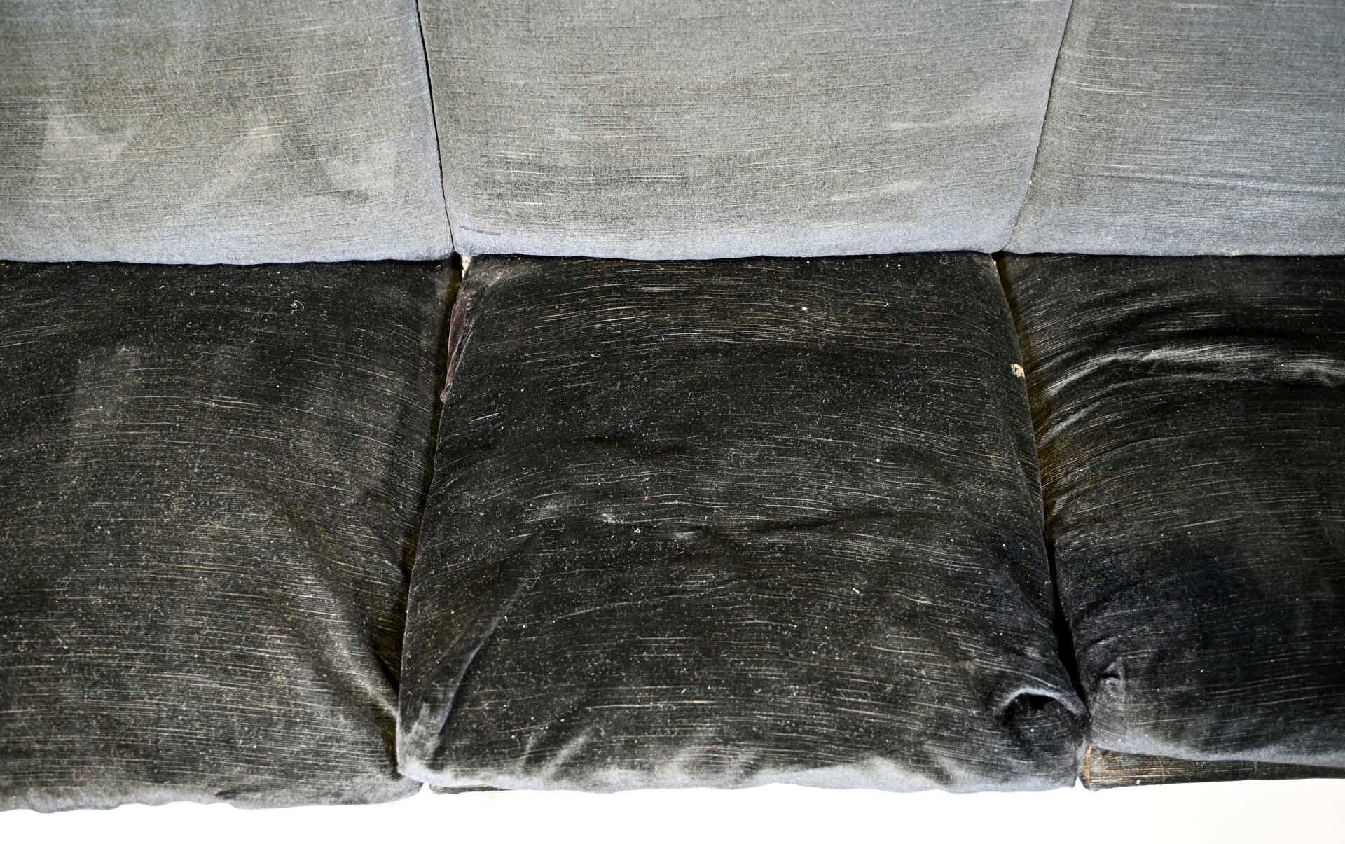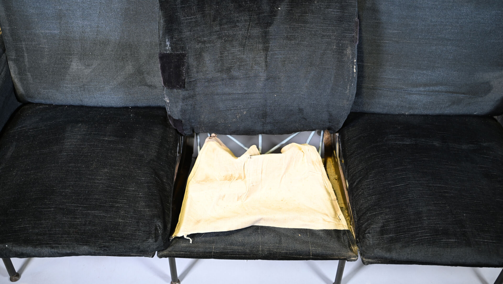 Pierre GUARICHE (1926-1995). Canapé troïka 3 places garni de velours noir (usures) Piètement métallique. Haut. : 85 cm Larg. : 180 cm. Prof. : 78 cm.