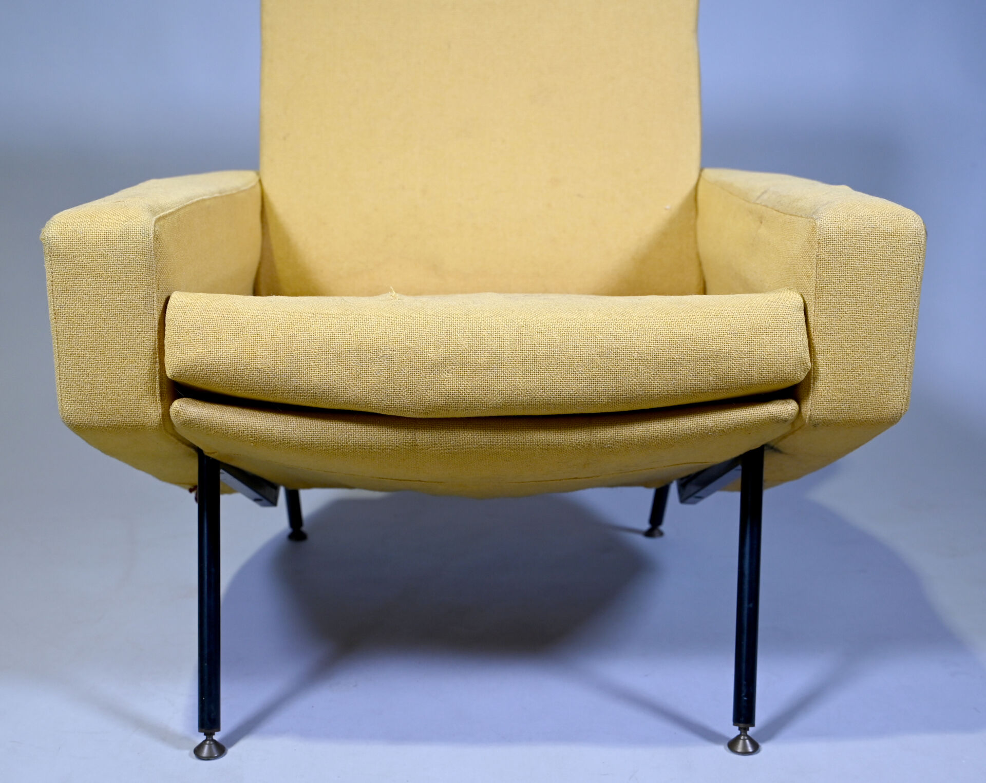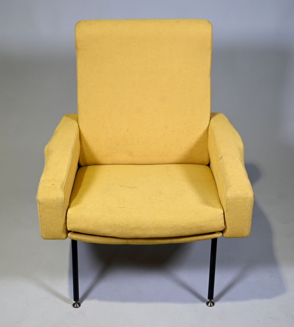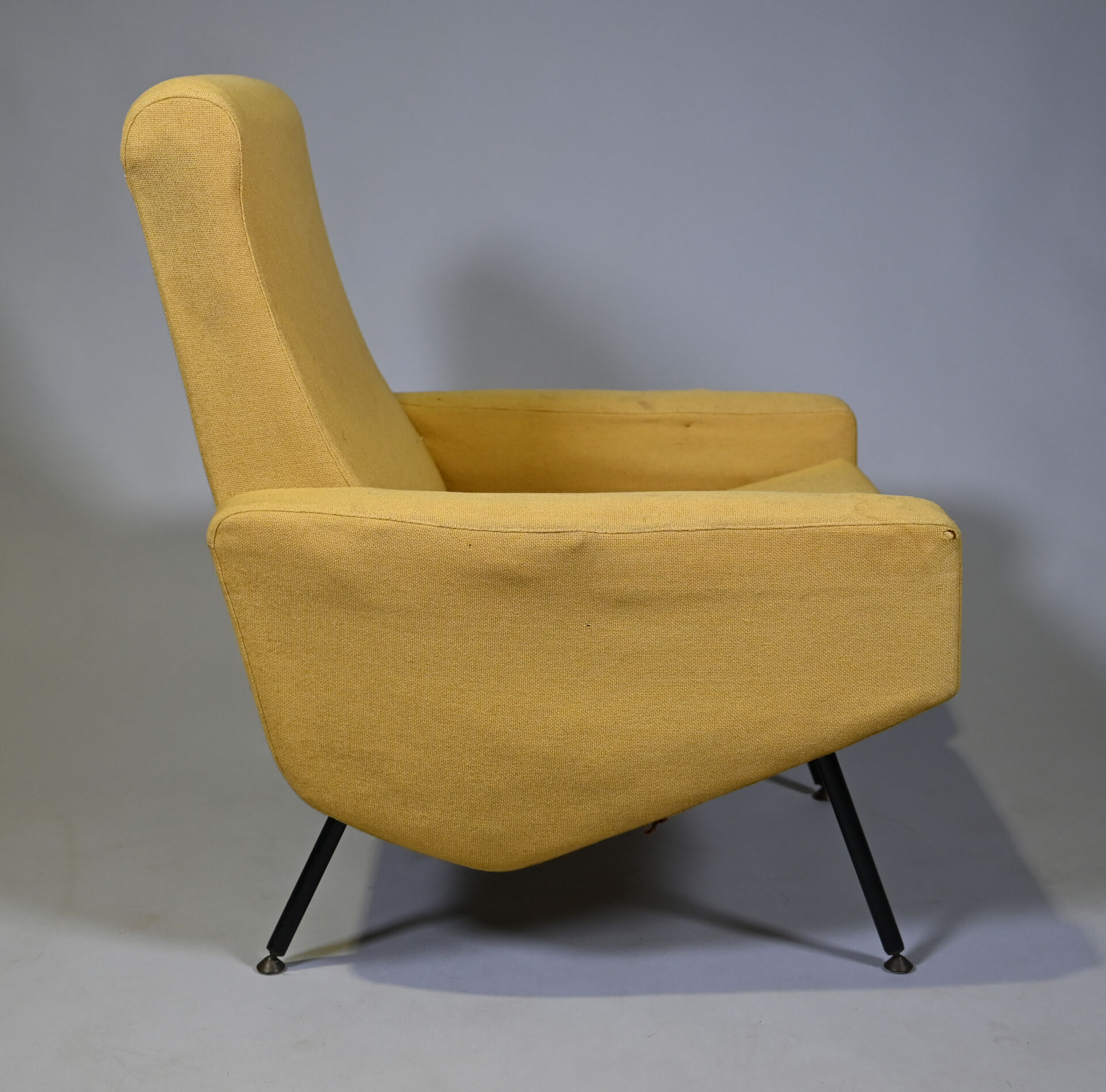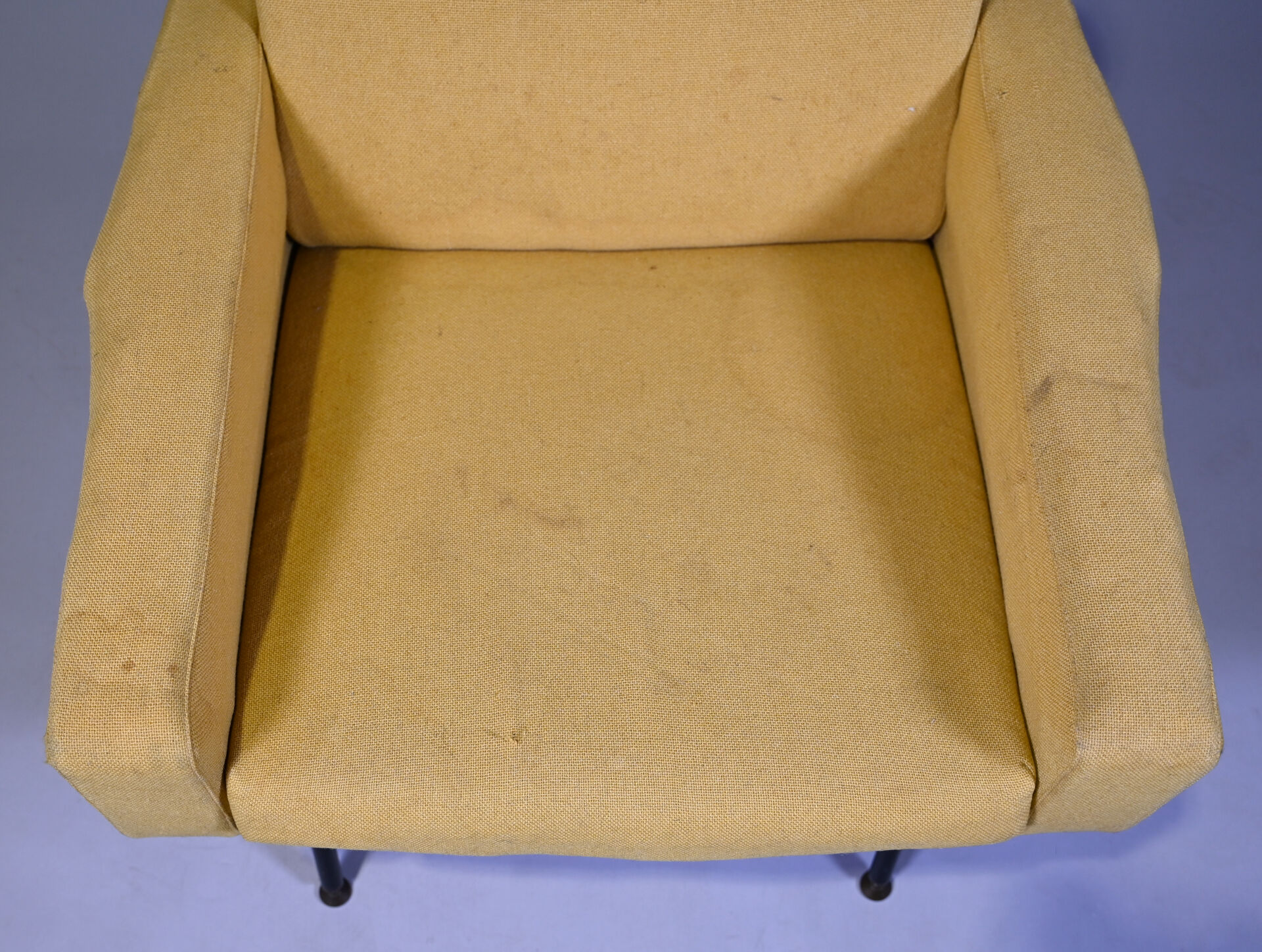 Pierre GUARICHE (1926-1995). Fauteuil modèle Troïka garni de tissu jaune, piètement en métal laqué noir (usures). Haut. : 85,5 cm.