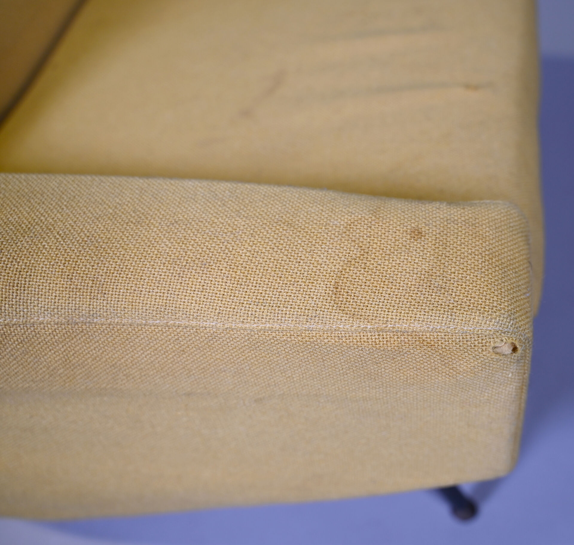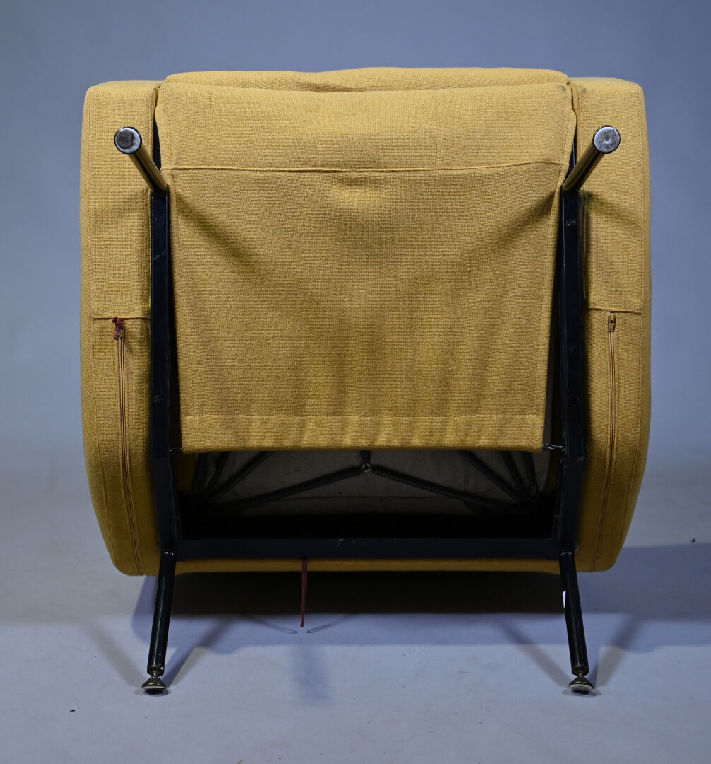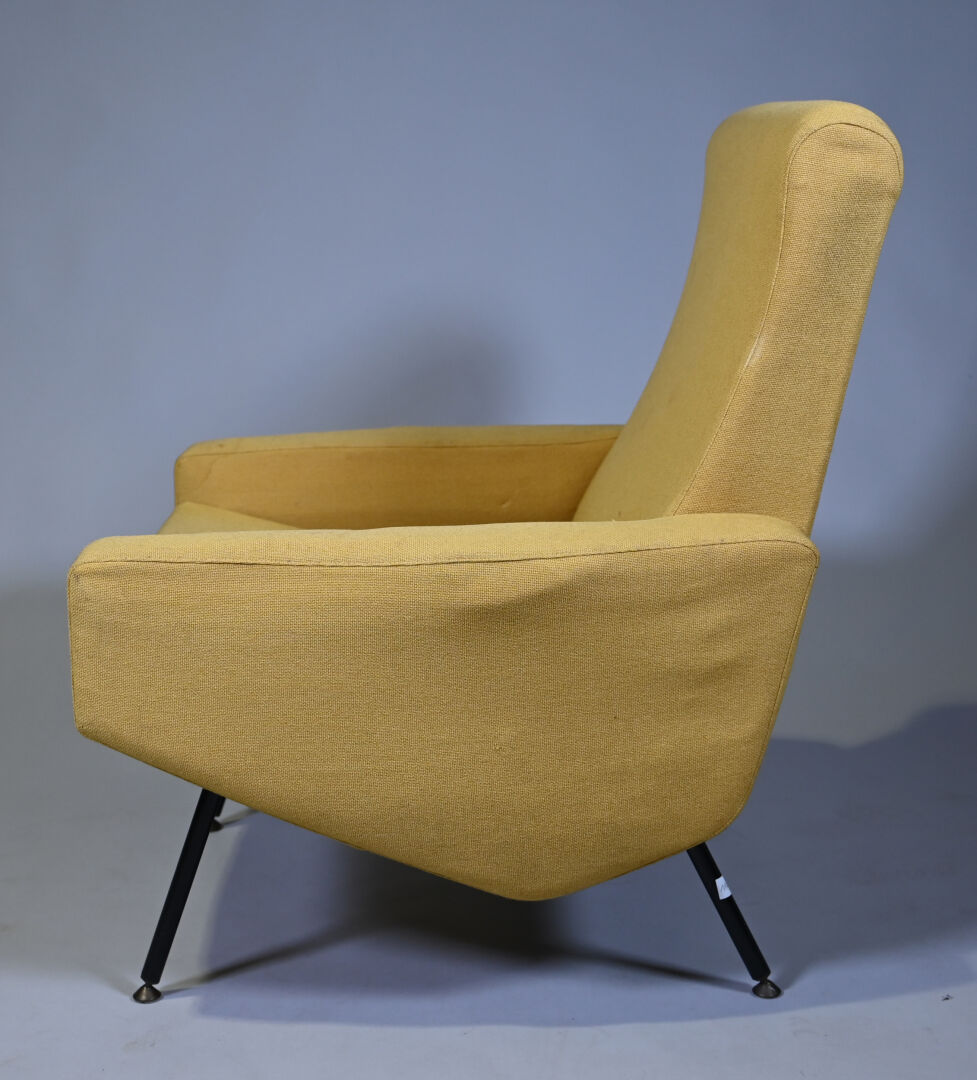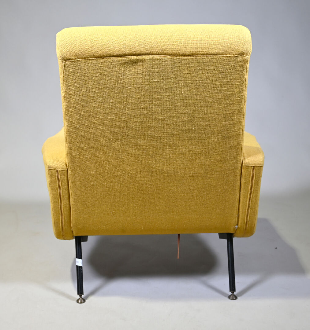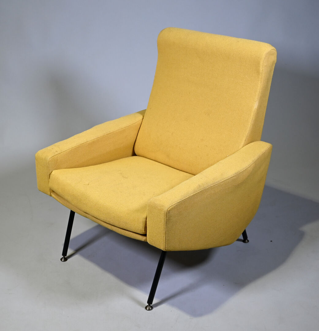 Pierre GUARICHE (1926-1995). Fauteuil modèle Troïka garni de tissu jaune, piètement en métal laqué noir (usures). Haut. : 85,5 cm.