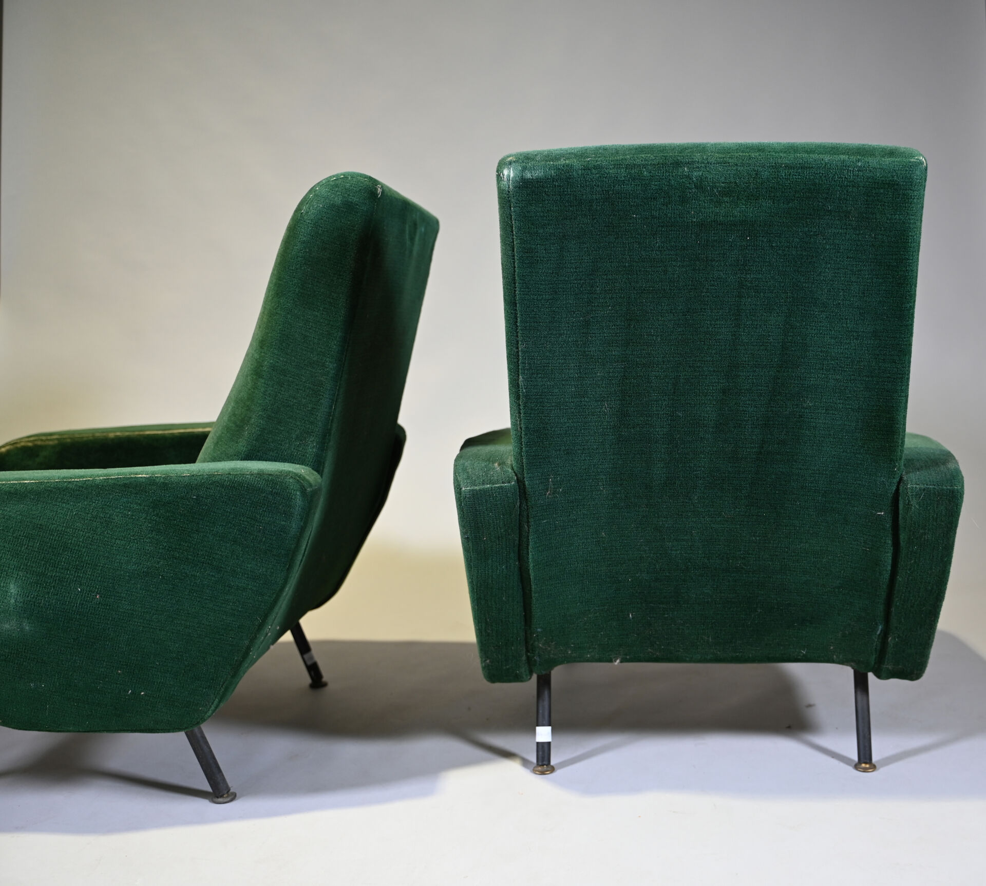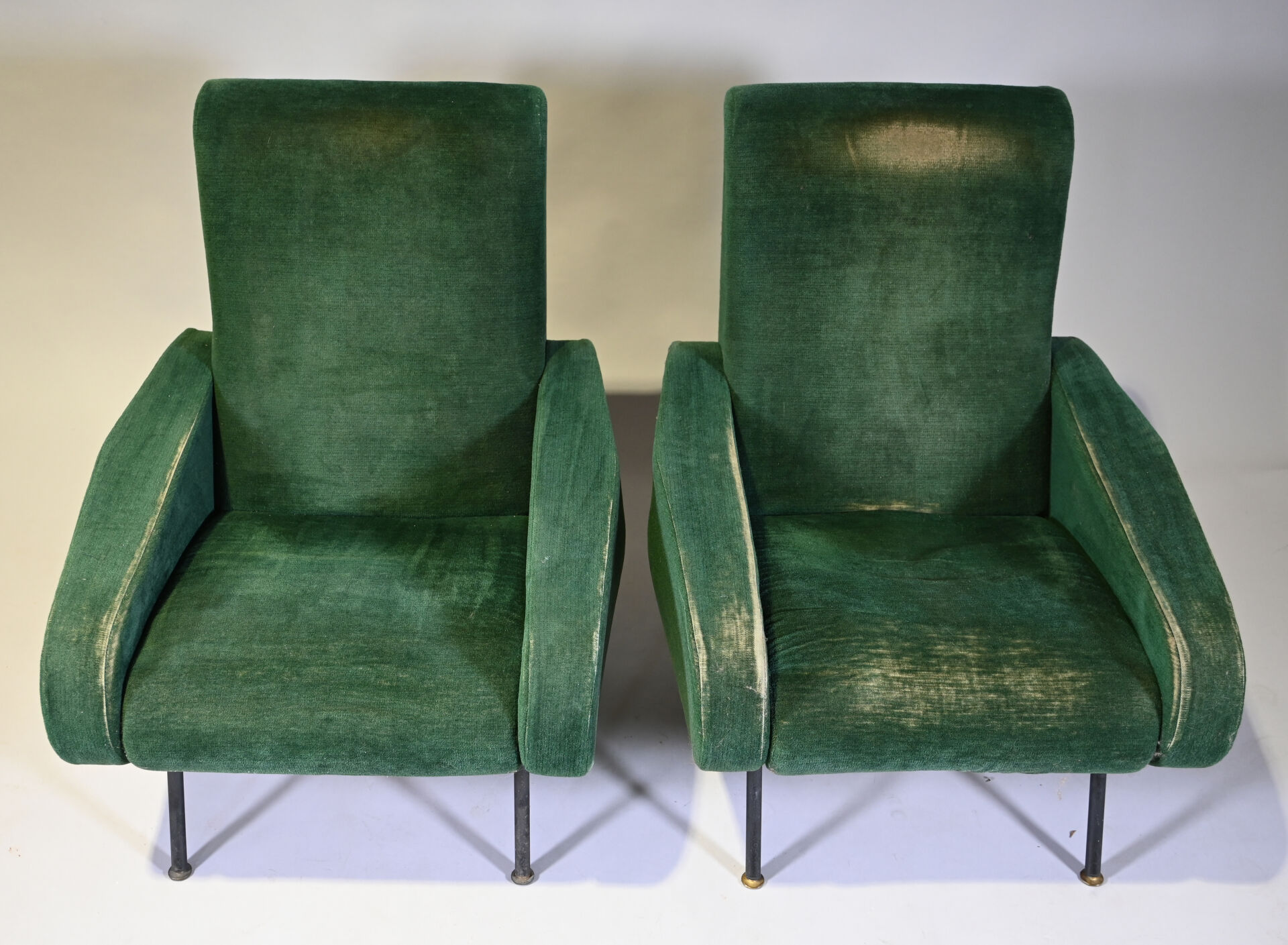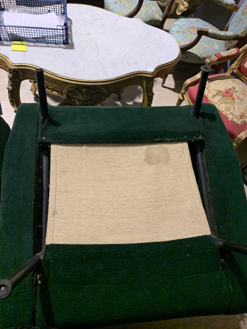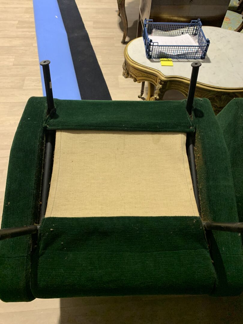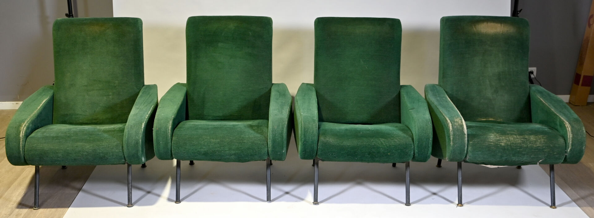 Pierre GUARICHE (1926-1995). Suite de 4 fauteuils modèle Troïka garnis de velours vert, piètement en métal laqué noir (usures d’usage, patins manquants, un ressort cassé). Haut. : 89 cm.