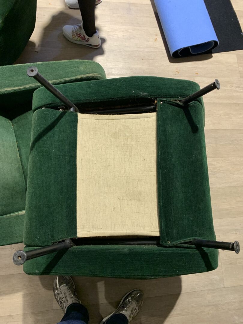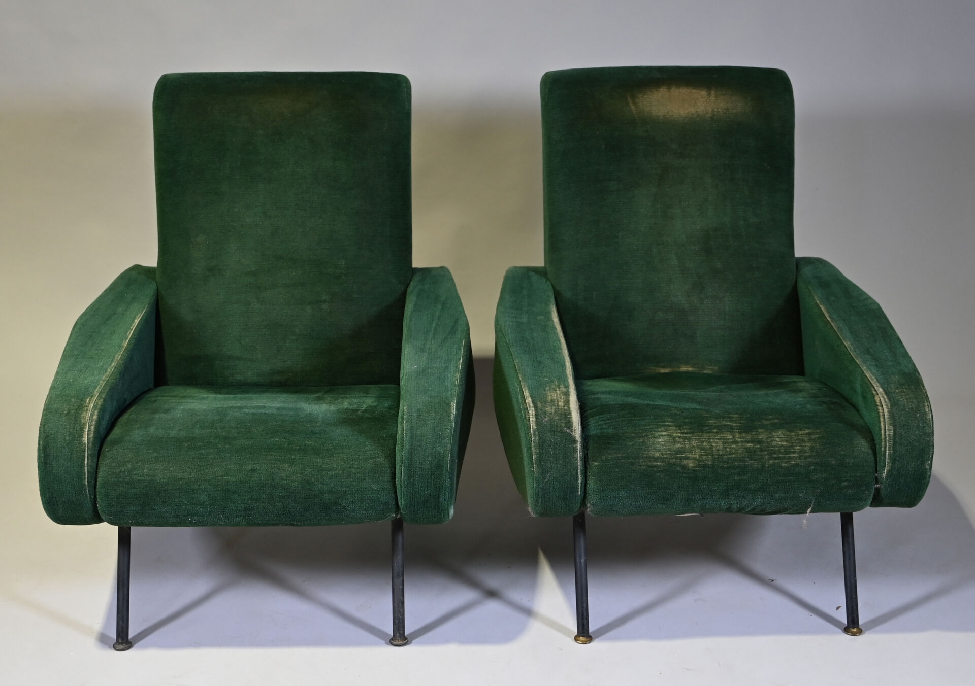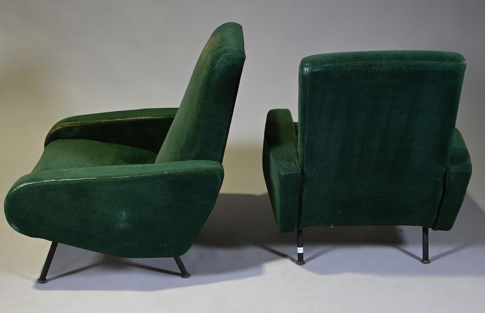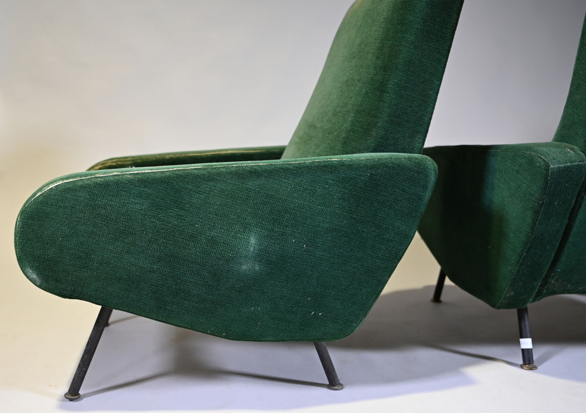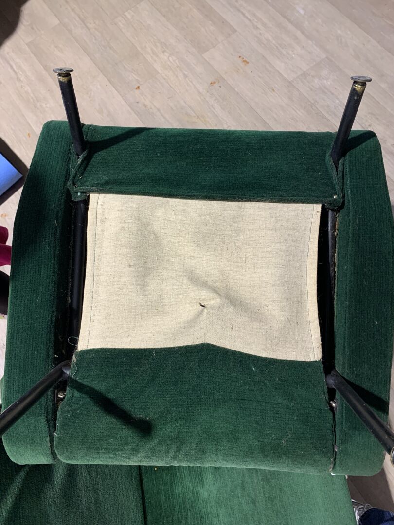Pierre GUARICHE (1926-1995). Suite de 4 fauteuils modèle Troïka garnis de velours vert, piètement en métal laqué noir (usures d’usage, patins manquants, un ressort cassé). Haut. : 89 cm.