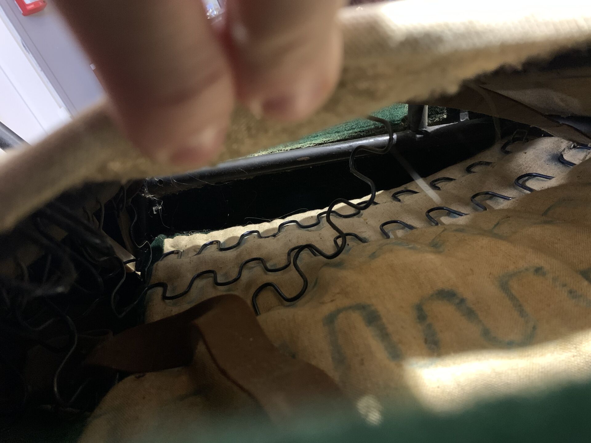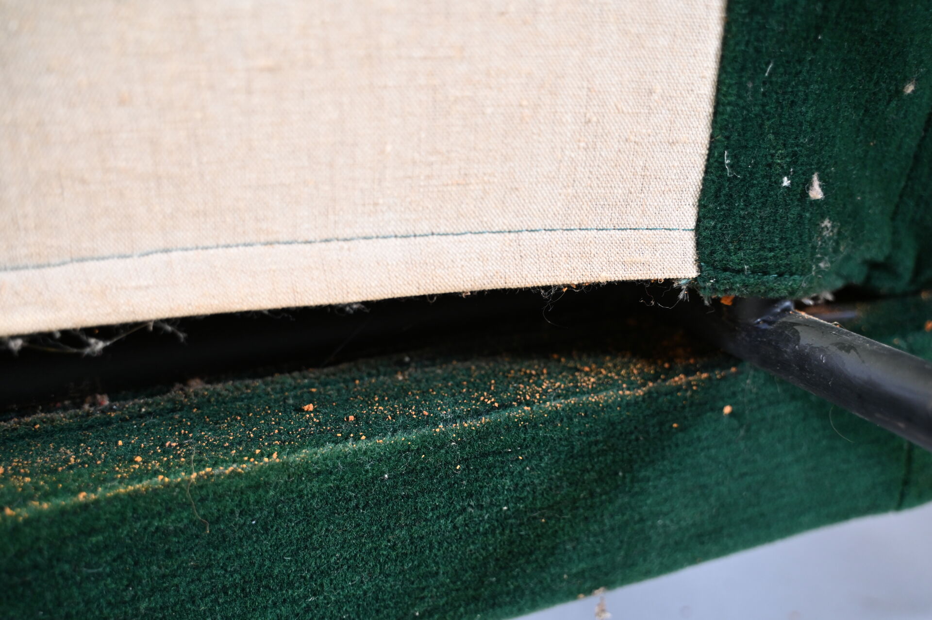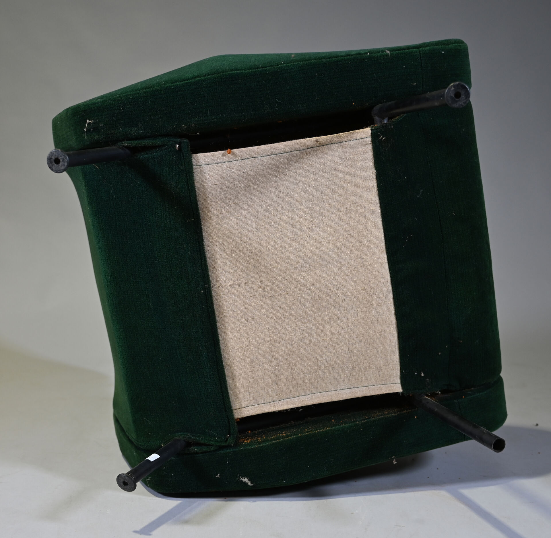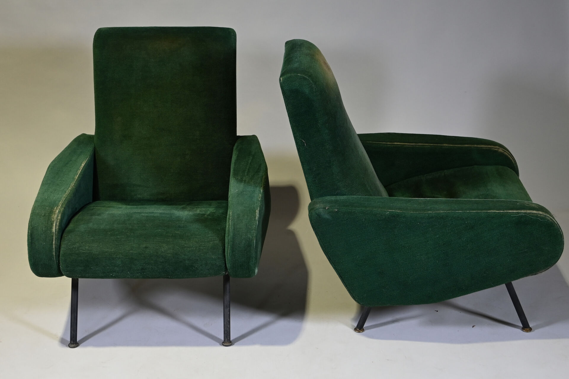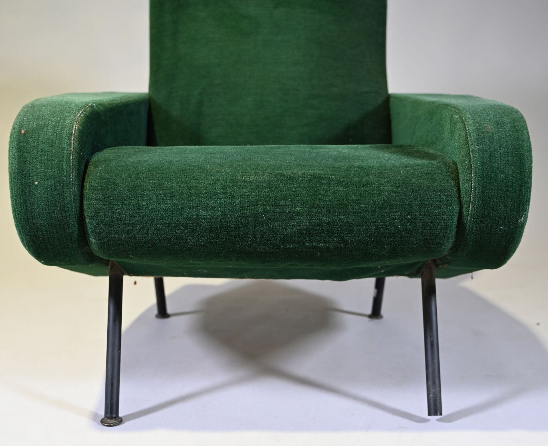 Pierre GUARICHE (1926-1995). Suite de 4 fauteuils modèle Troïka garnis de velours vert, piètement en métal laqué noir (usures d’usage, patins manquants, un ressort cassé). Haut. : 89 cm.