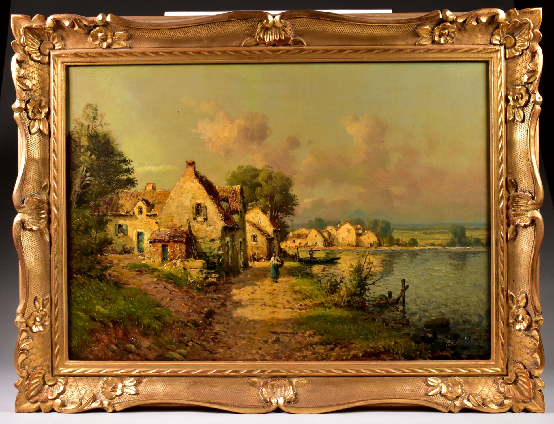 Pierre Jacques PELLETIER (1869-1931). Village au bord de l’eau. Huile sur toile signée en bas à droite. 46 x 65 cm.