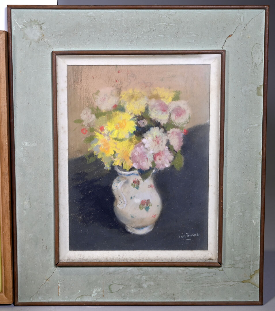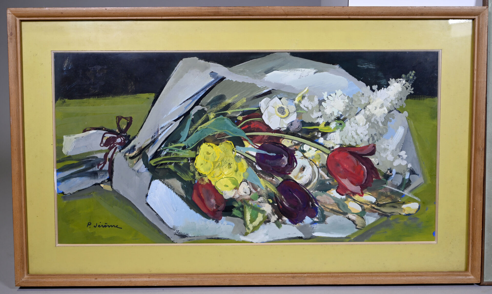 Pierre JEROME (1905-1982). Bouquet de fleurs aux tulipes. Gouache sur papier signée en bas à gauche. 37 x 74 cm (à vue). On joint un autre dessin du même artiste. 36 x 28 cm à vue.