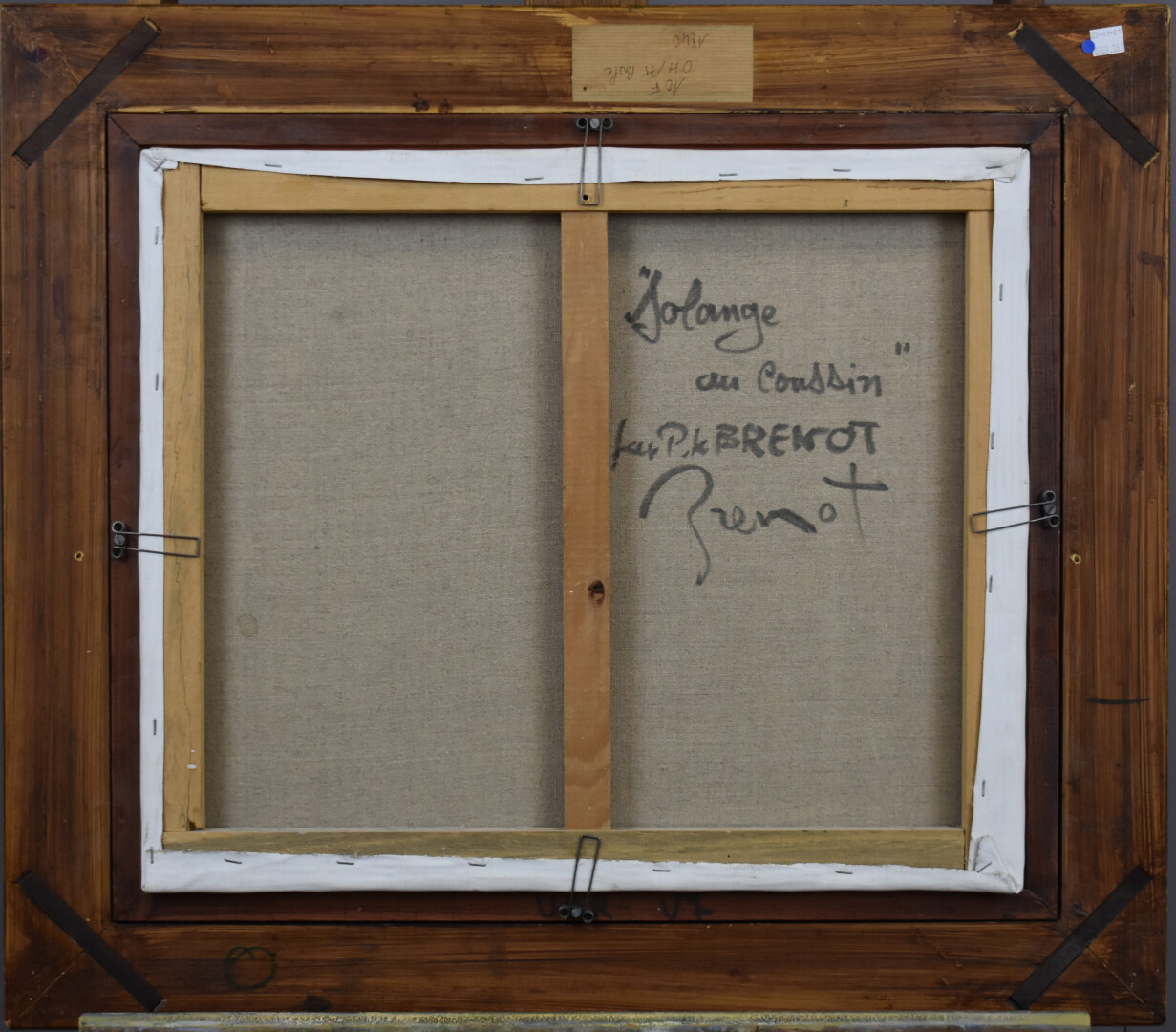 Pierre-Laurent BRENOT (1913-1998). « Solange au coussin ». Huile sur toile signée en bas à droite, titrée et contre signée au dos. 46 x 55 cm.