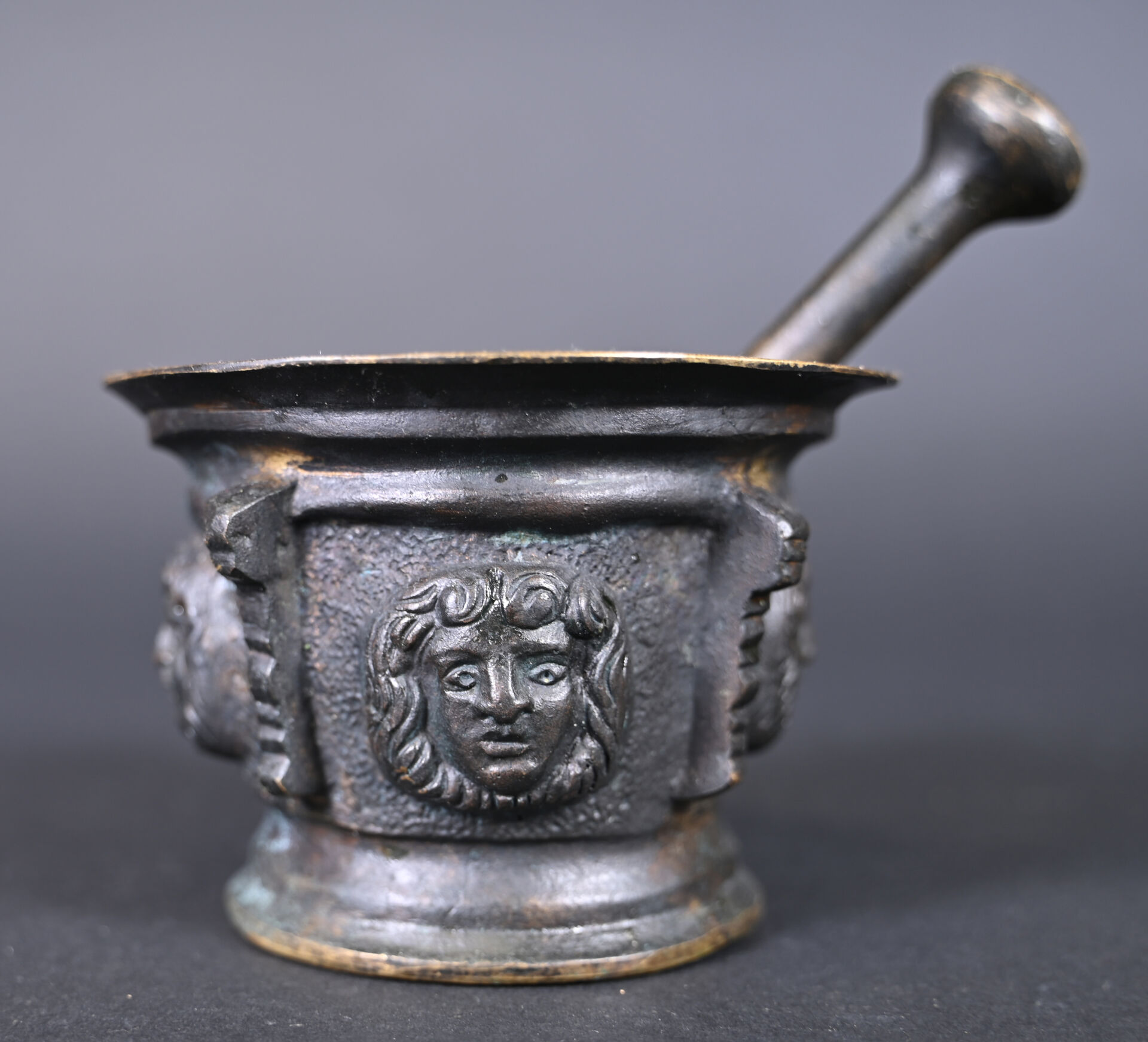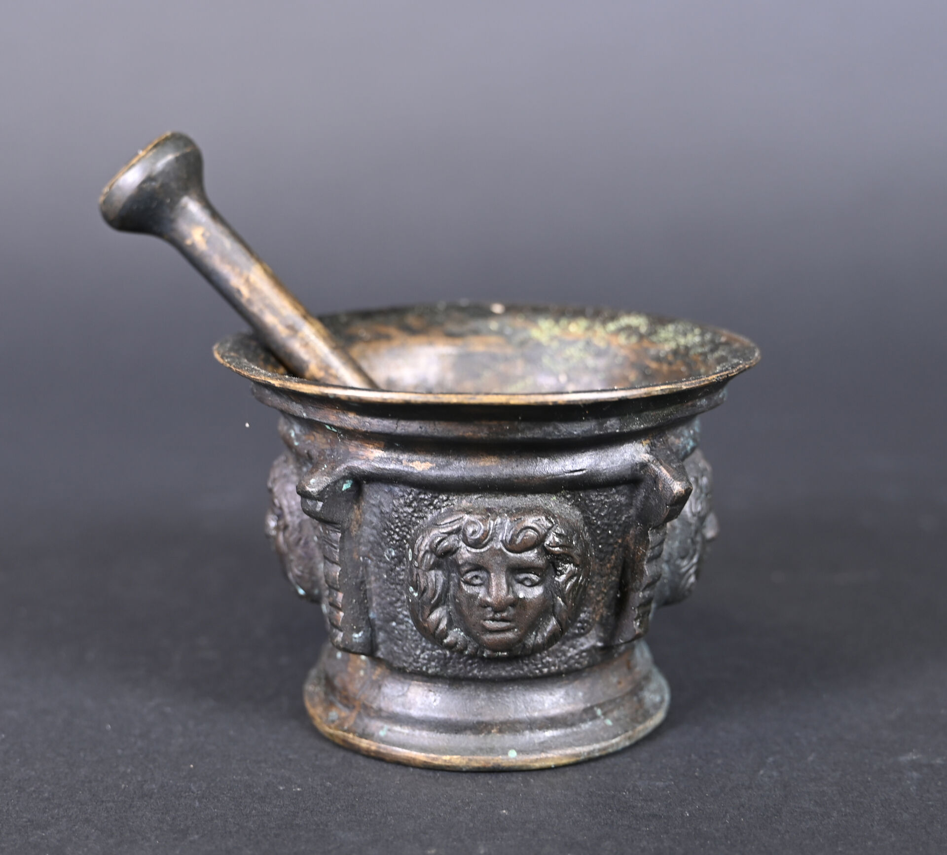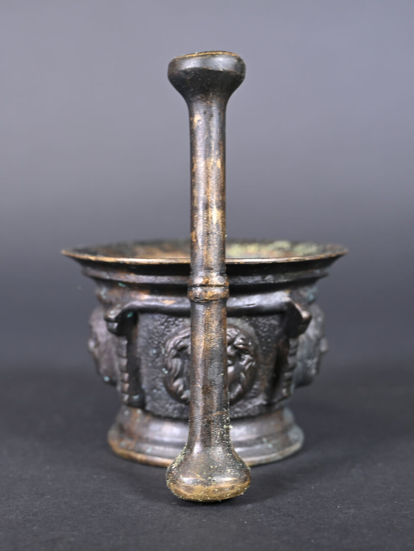 Pilon et mortier en bronze à décor de mascarons. XIXe siècle. Haut. : 8,5 cm.