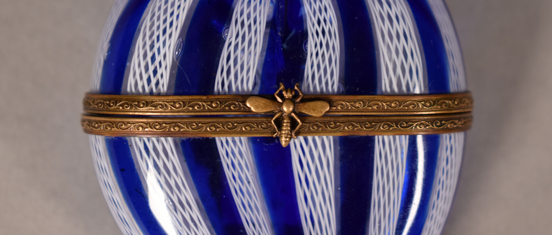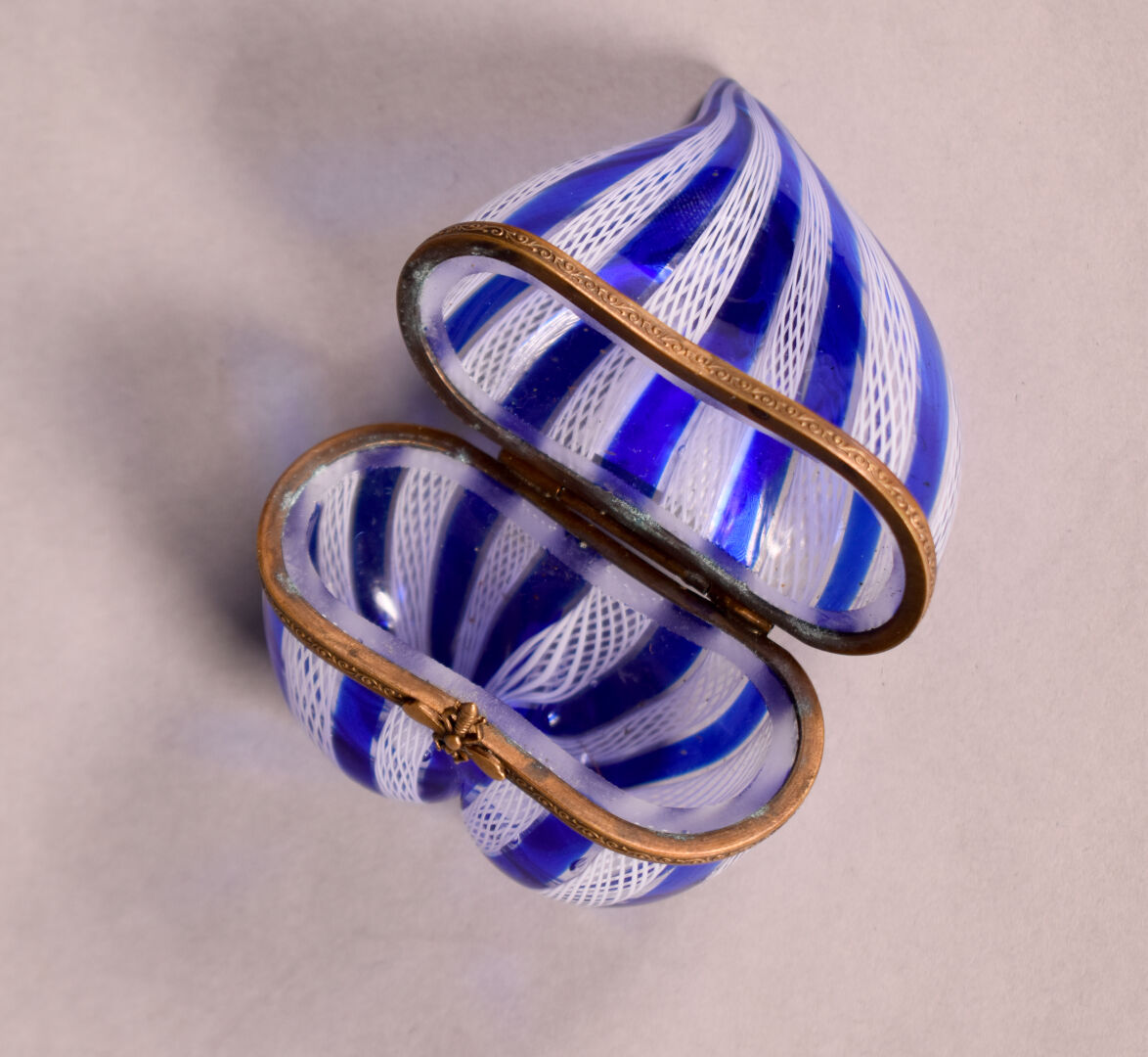 Pilulier en forme de coeur en verre filigrané et rubans bleu. Couvercle à charnières cerclé de métal. Murano, XXe siècle. 7,5 x 6,5 cm.