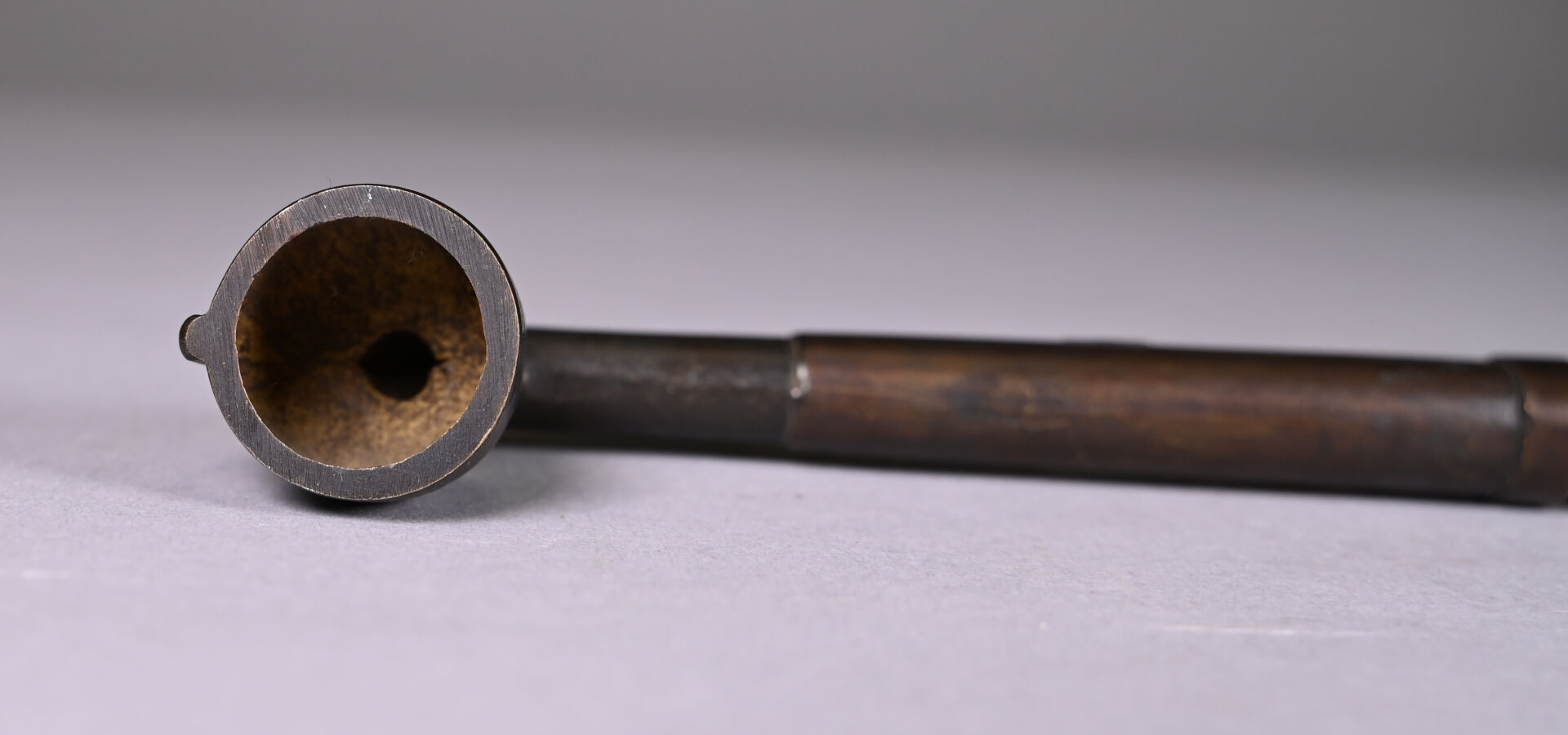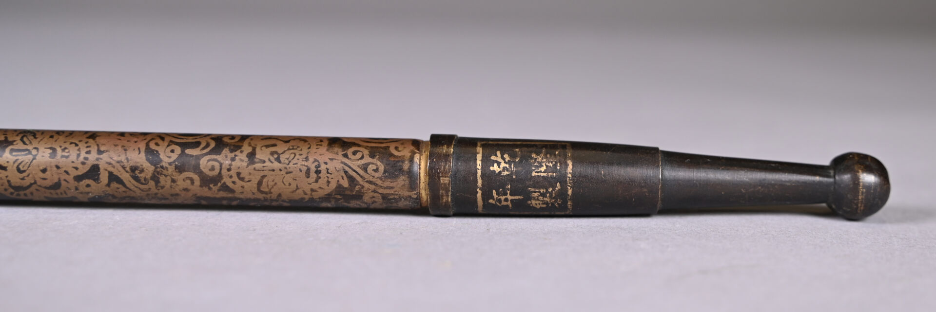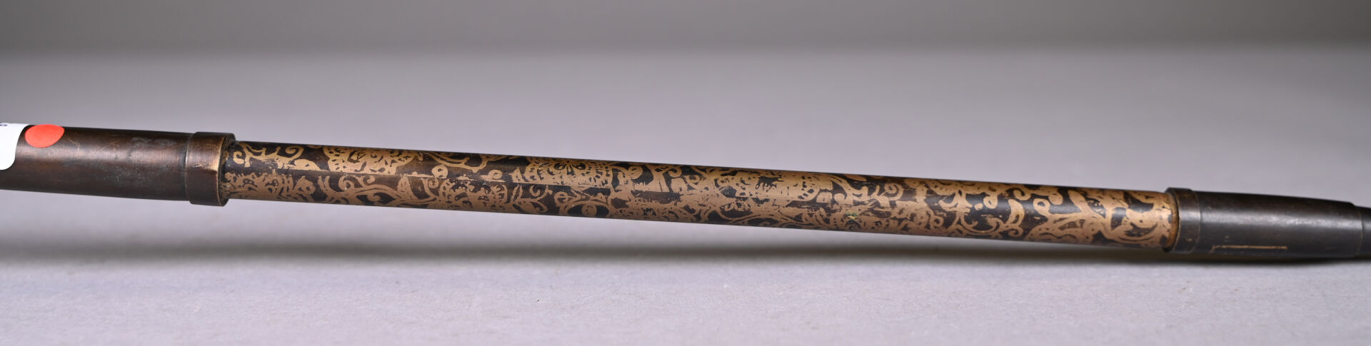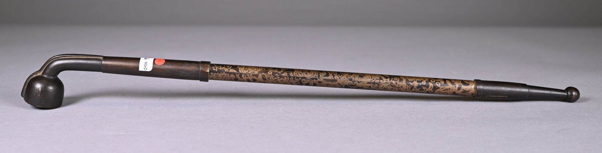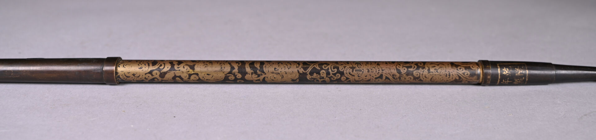 Pipe en cuivre, à décor rehaussé d’or de tiges feuillagées. Marque apocryphe Qianlong. Chine du Sud, XXe siècle. Long. : 46,5 cm.