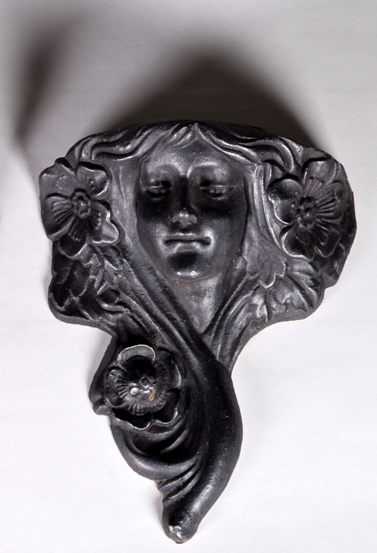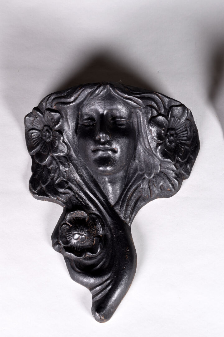 Pique-fleurs en console en fonte patiné noir représentant des femmes-fleurs. Dans le goût Art Nouveau. Haut. : 30 cm.