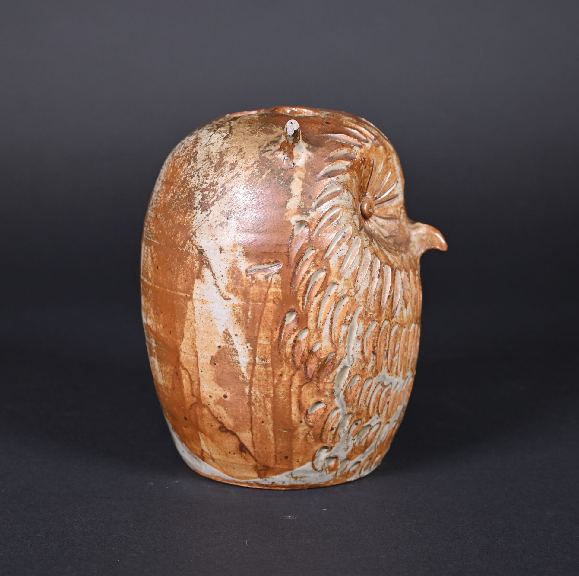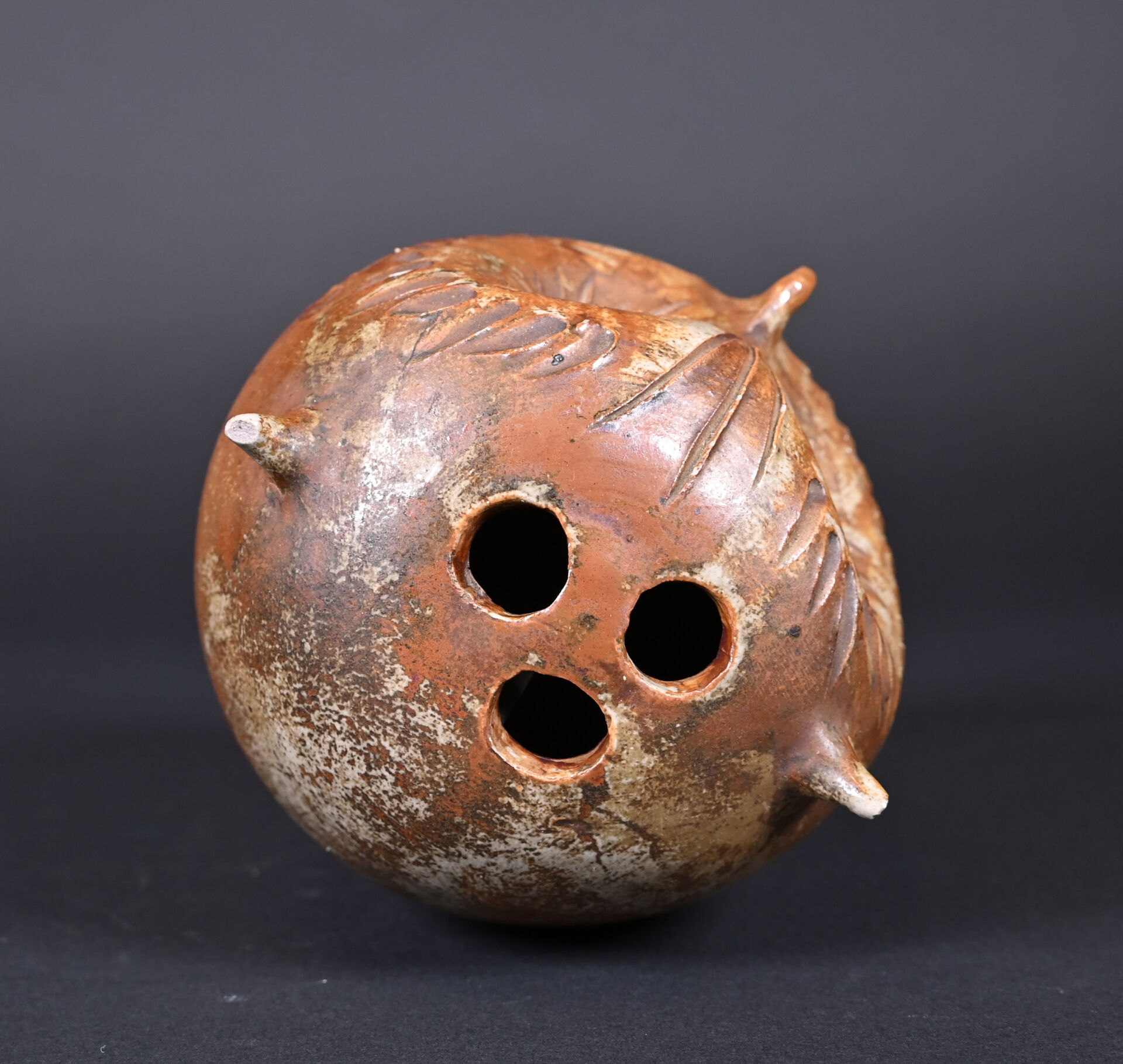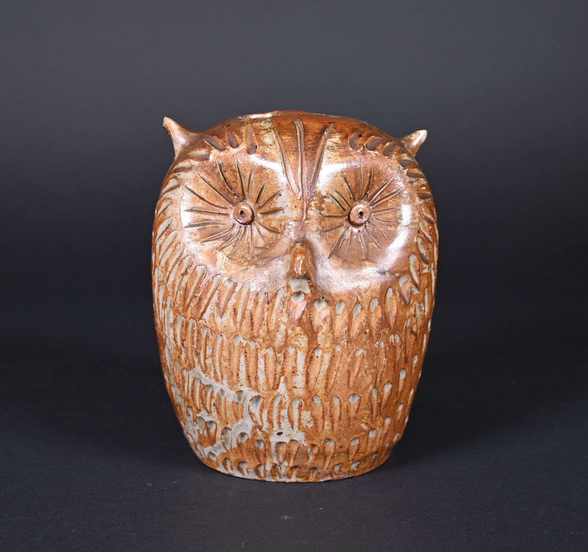 Pique-fleurs hibou en céramique partiellement émaillée brun (un petit éclat au dessous, et petite égrenures sur les oreilles). Milieu du XXe siècle. Haut. : 17 cm.