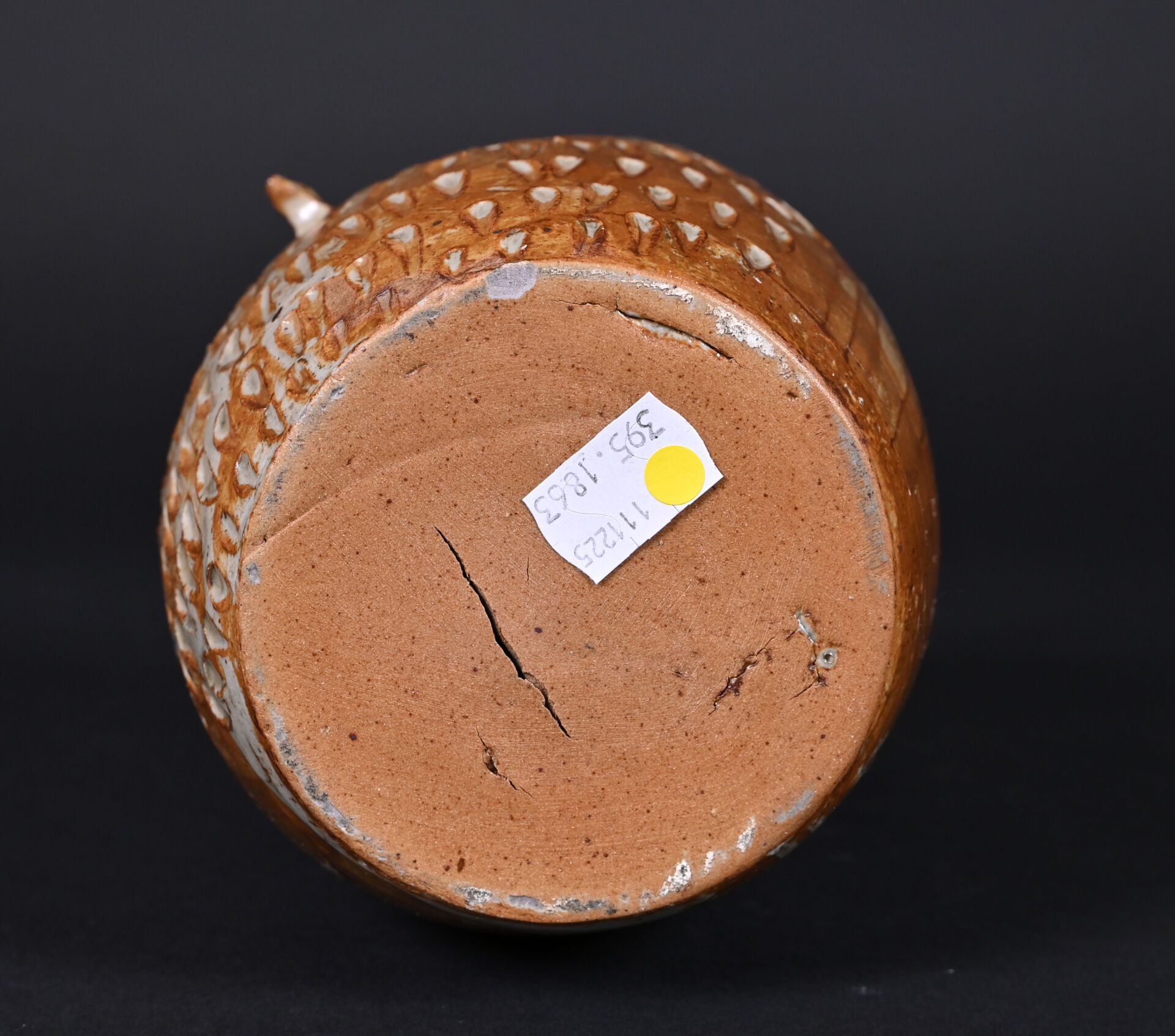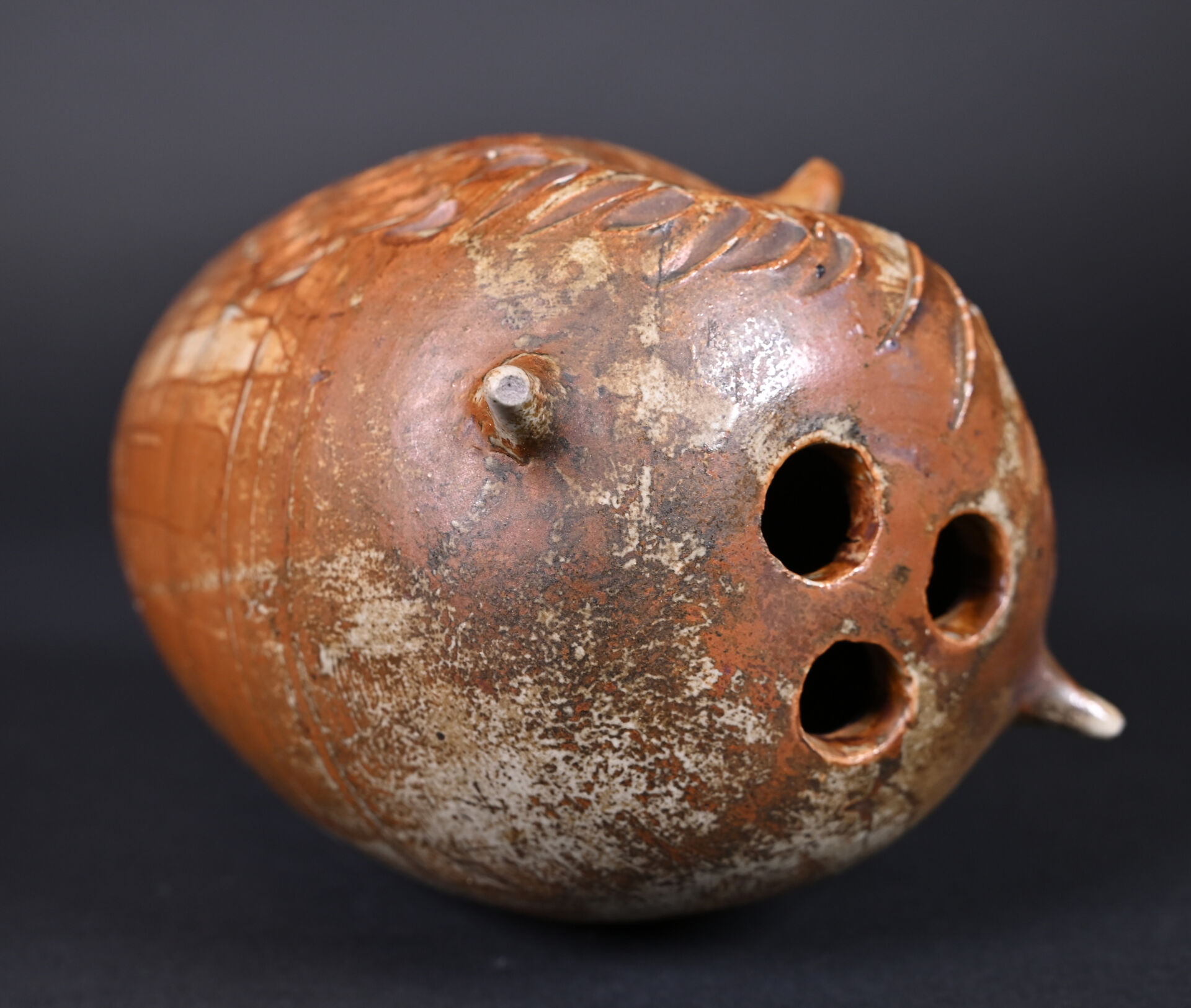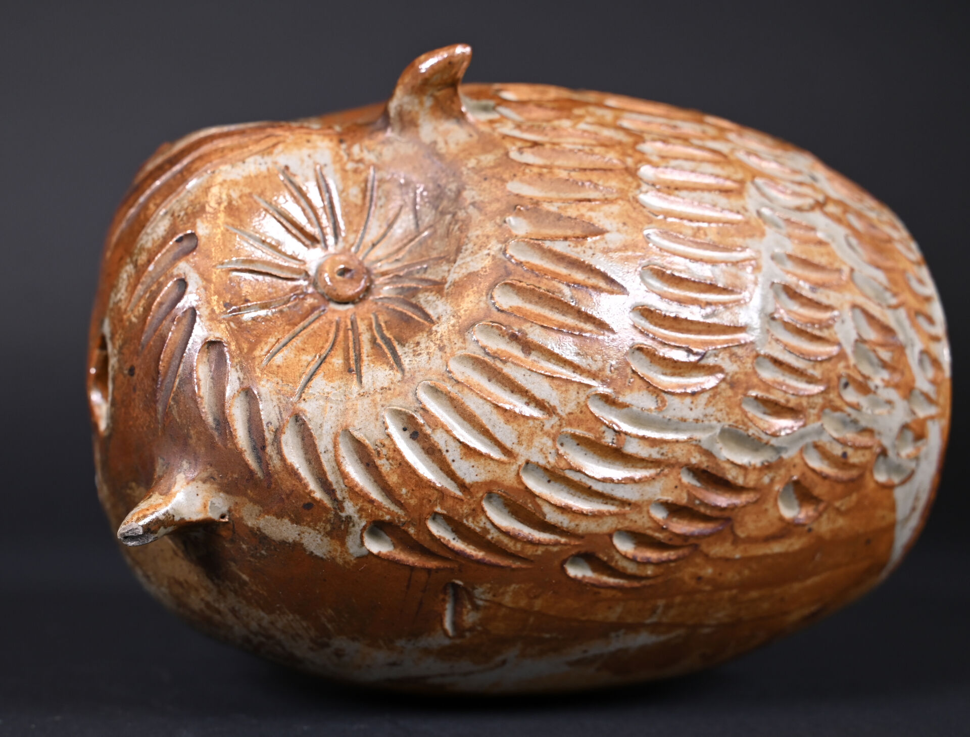 Pique-fleurs hibou en céramique partiellement émaillée brun (un petit éclat au dessous, et petite égrenures sur les oreilles). Milieu du XXe siècle. Haut. : 17 cm.