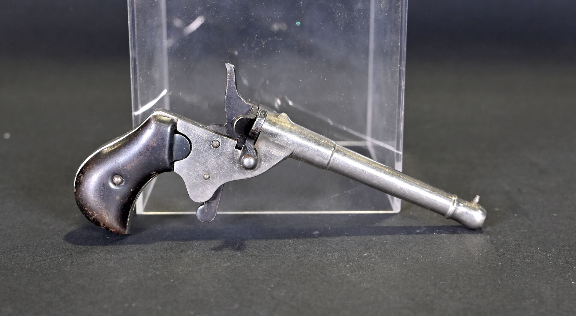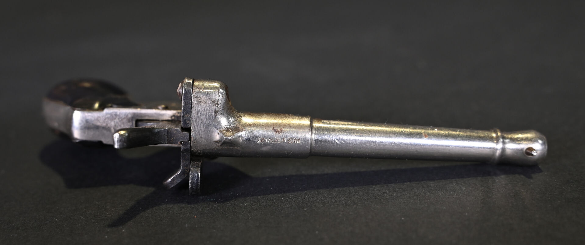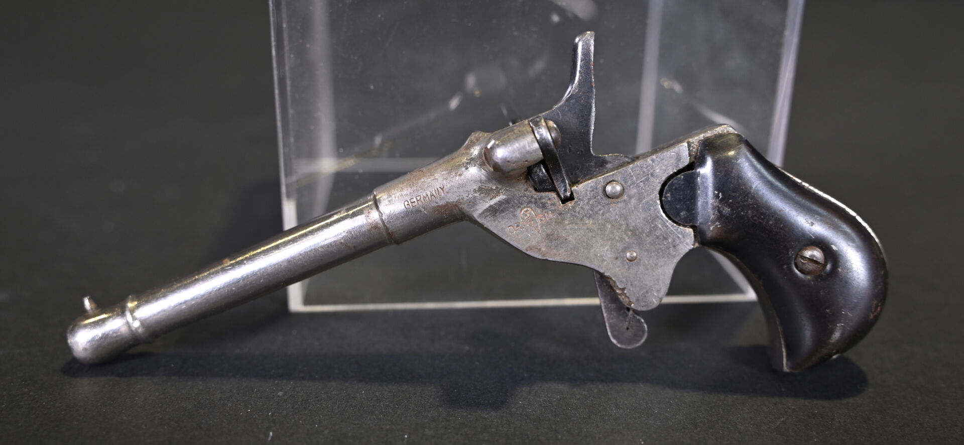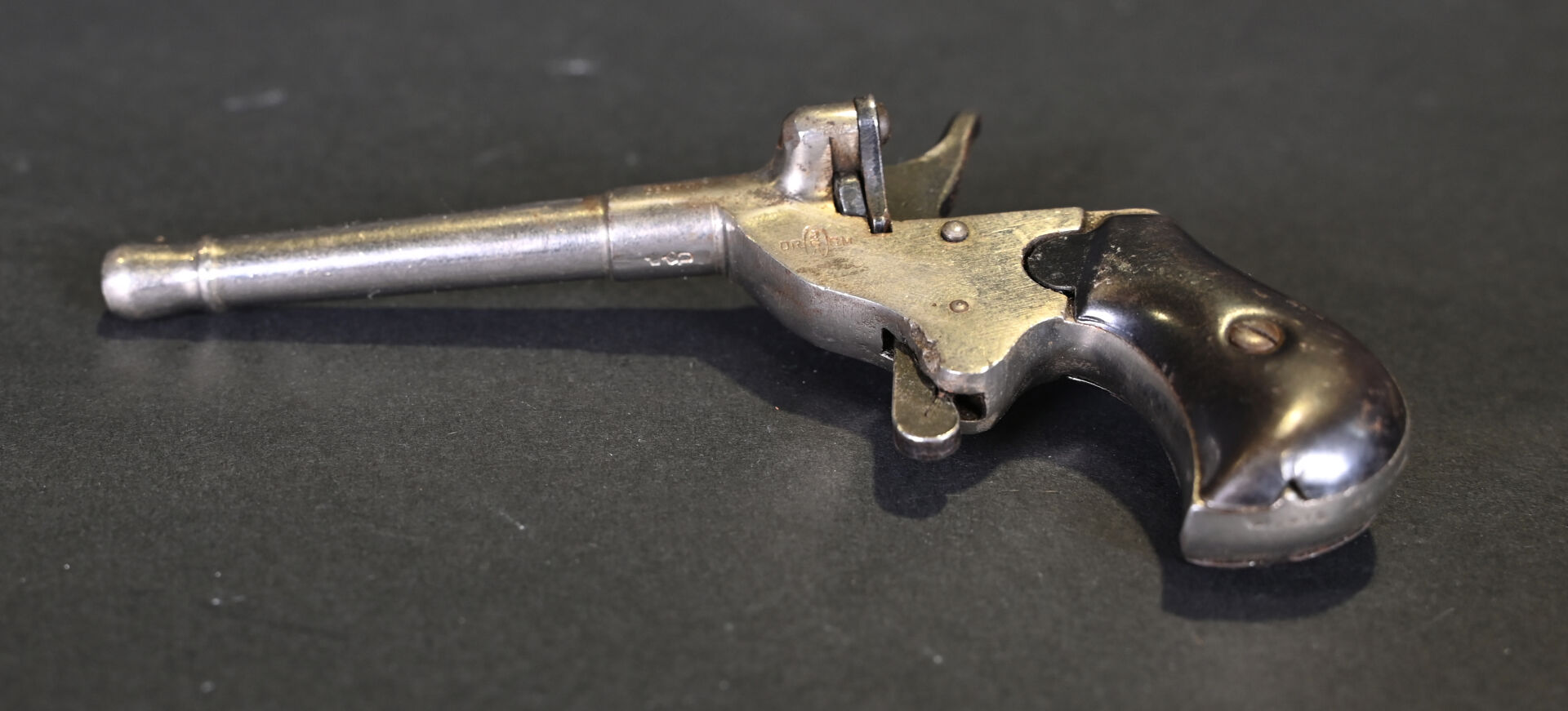 Pistolet de cycliste mono-coup, calibre 6mm Flaubert. Fabrication allemande. Culasse pivotante. Extracteur. Chien à coffre. Détente à la mexicaine. Canon rond renforcé à la bouche. Plaquettes corne. Mécanisme fonctionnel. Catégorie D. État 1.
