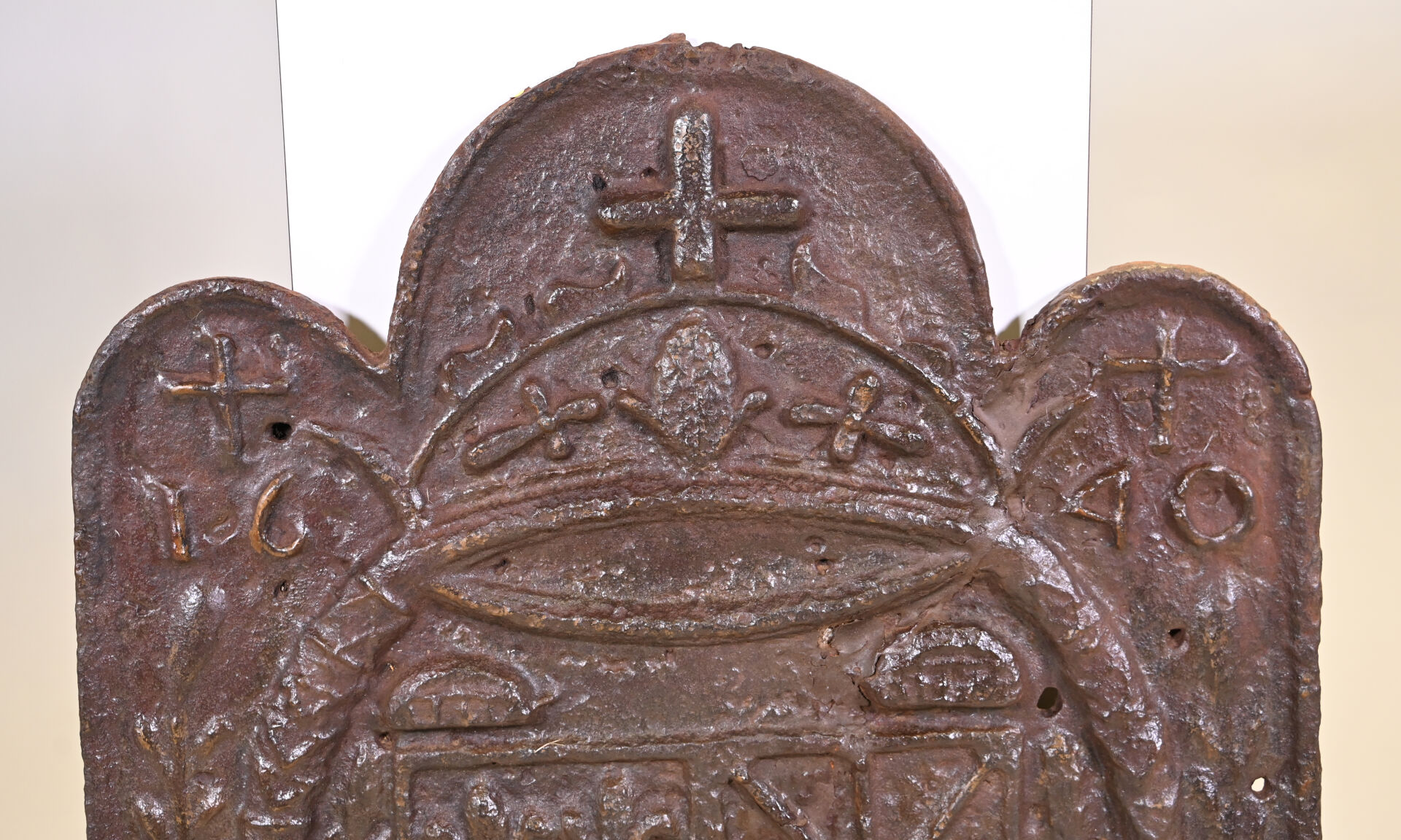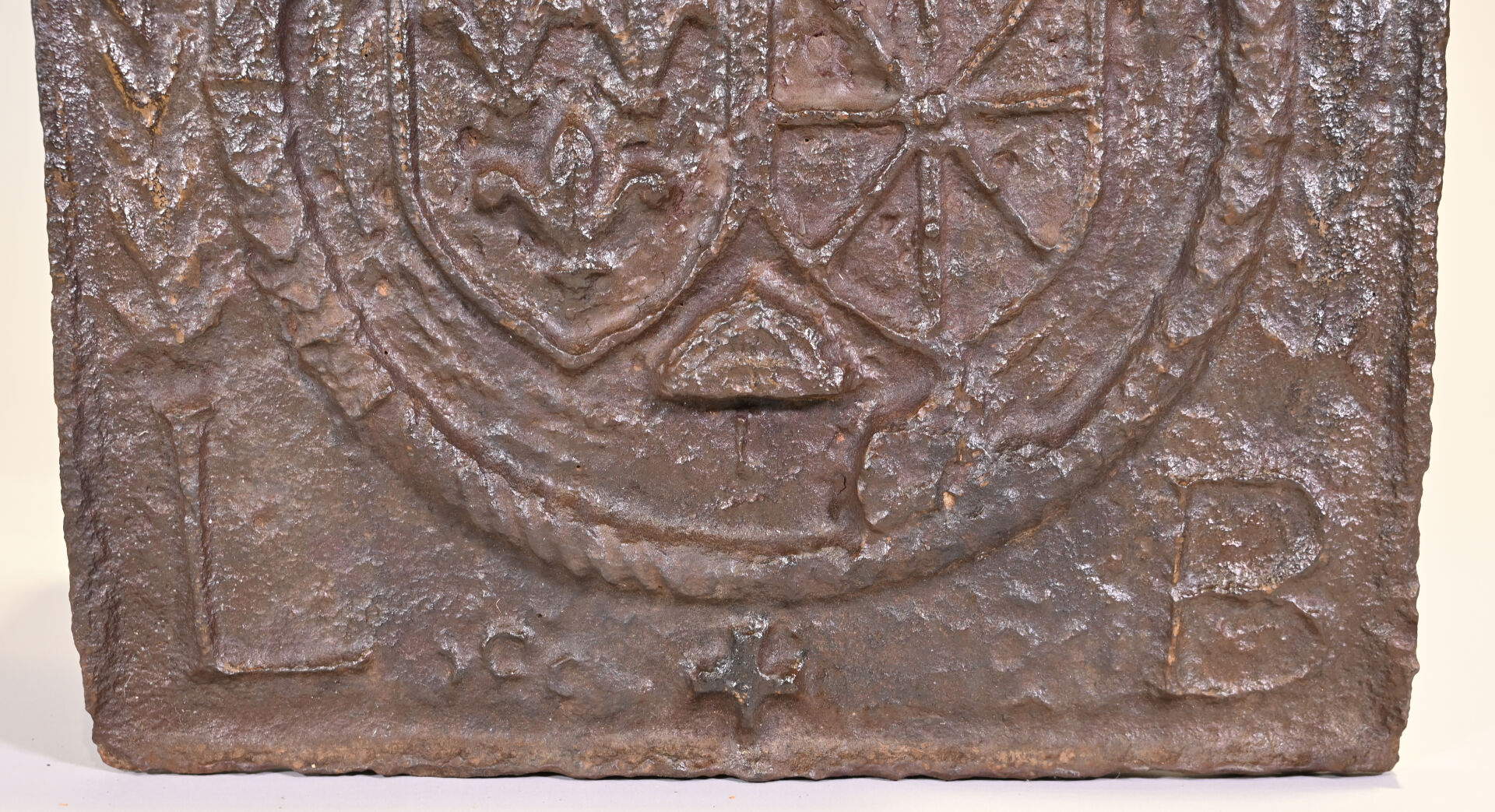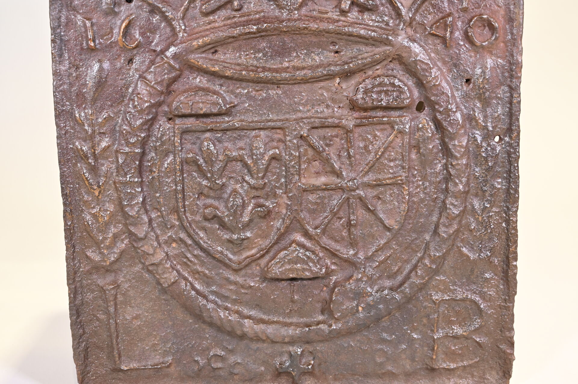 Plaque de cheminée en fonte à décor d’armoiries à la fleur de lys et datée 1640. 74 x 62 cm.