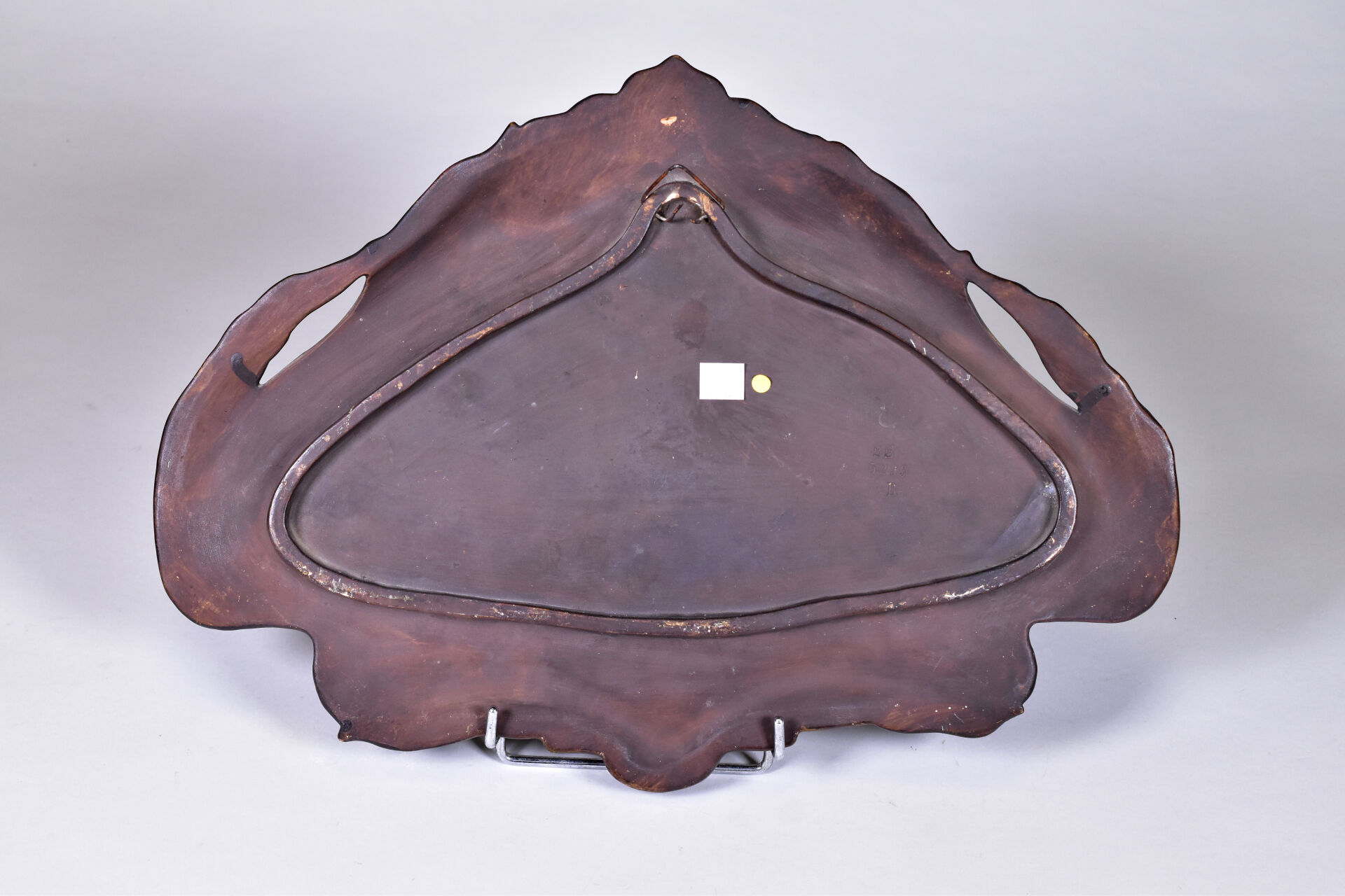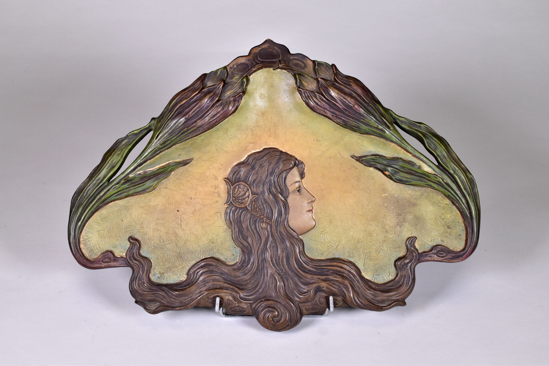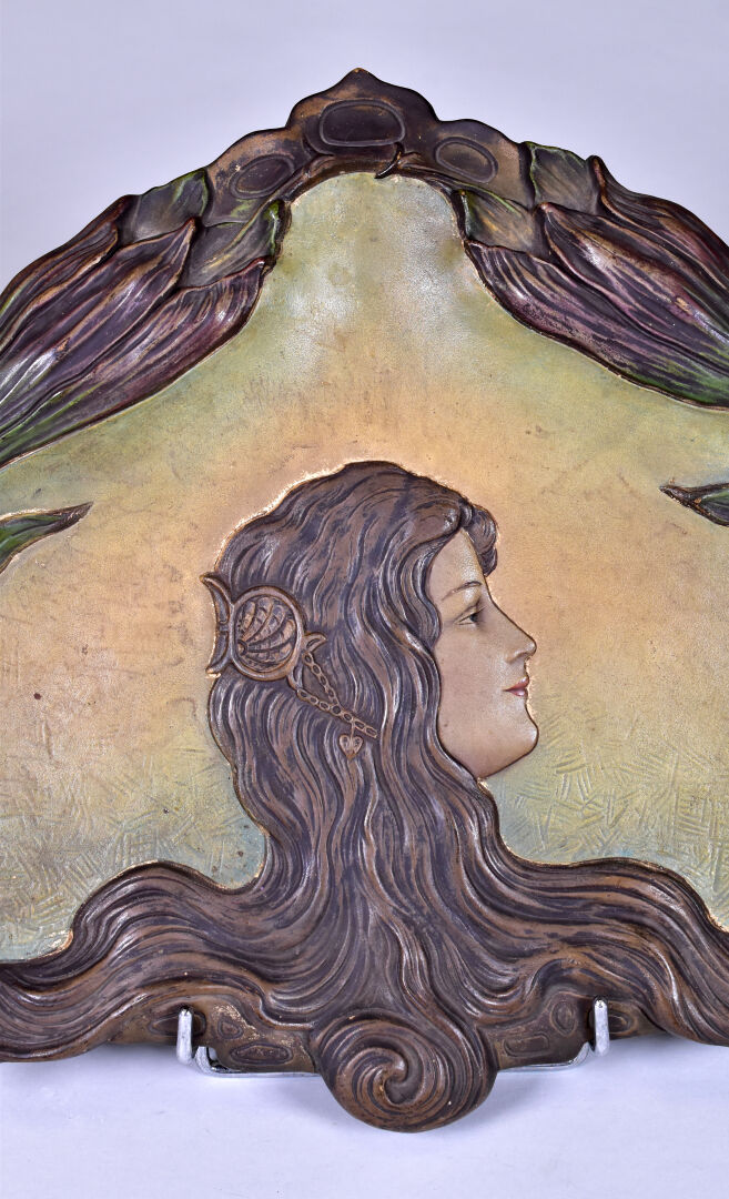 Plaque de terre cuite émaillée en polychomie à décor d’un profile de femme et végétaux (quelques égrenures). Epoque Art Nouveau. 34 x 46 cm.