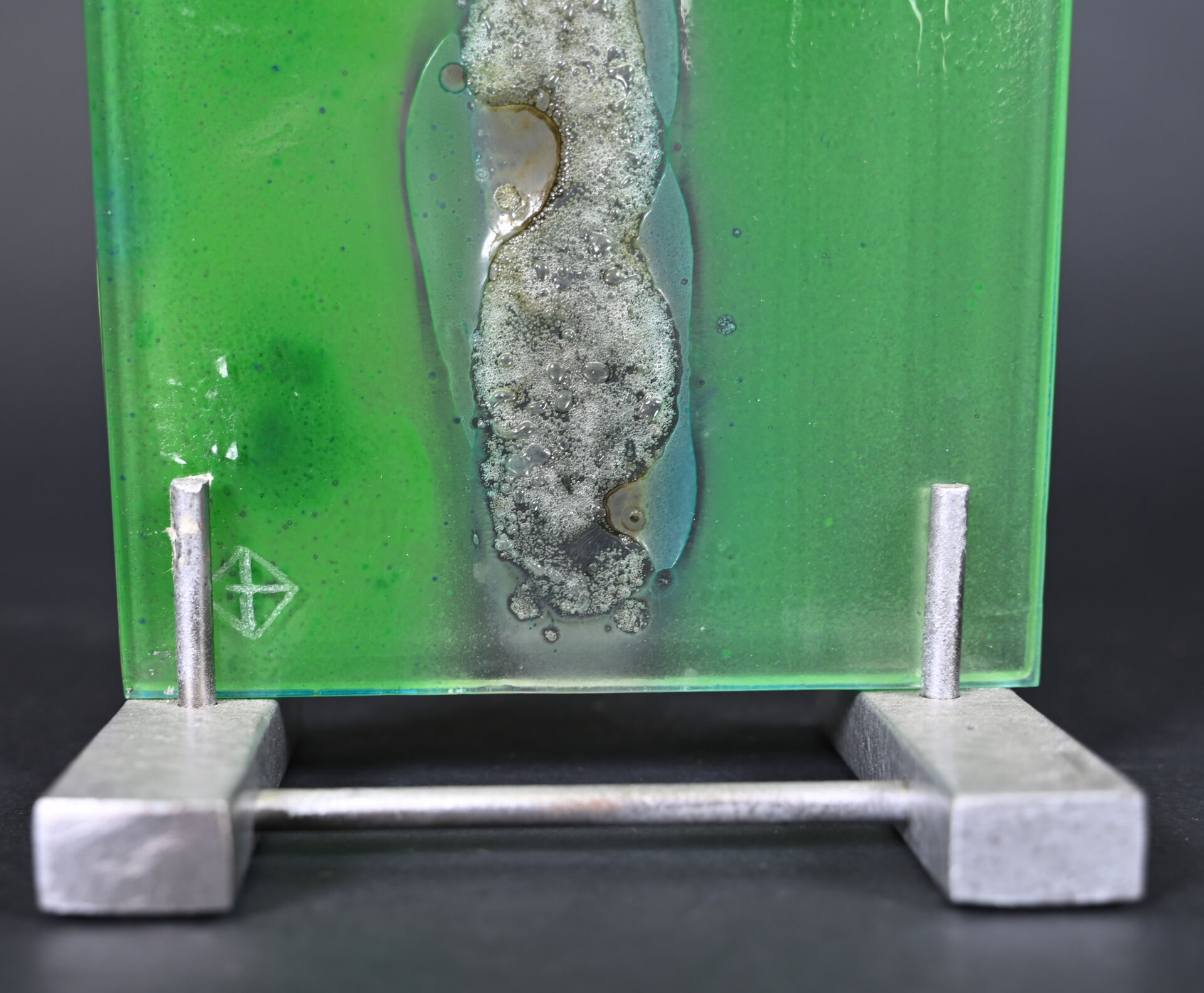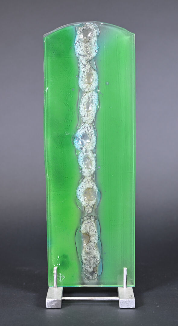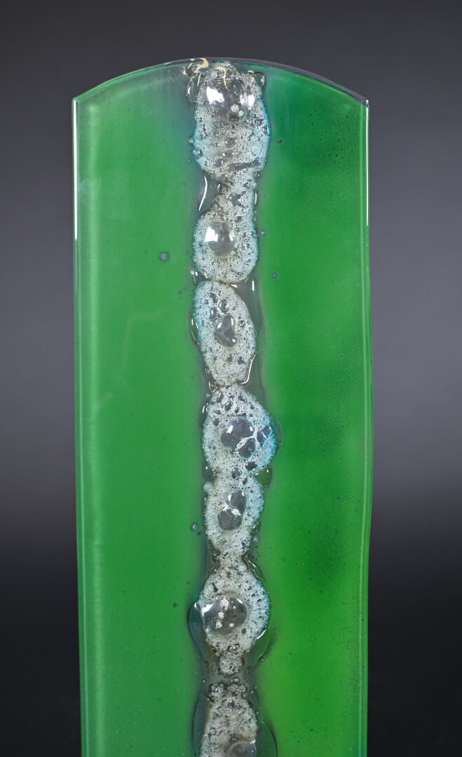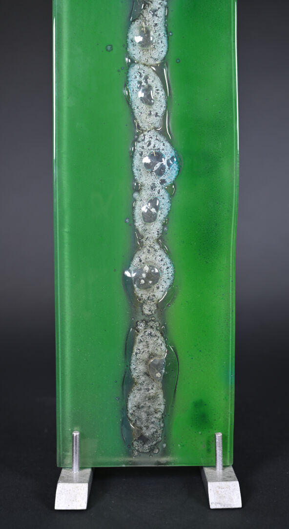 Plaque de verre translucide et vert nuancé, la partie centrale à bandeau de bulles de cuisson incrustées. Socle métallique. Travail moderne. Haut. : 46 cm. Larg. : 15 cm Prof. : 11 cm.