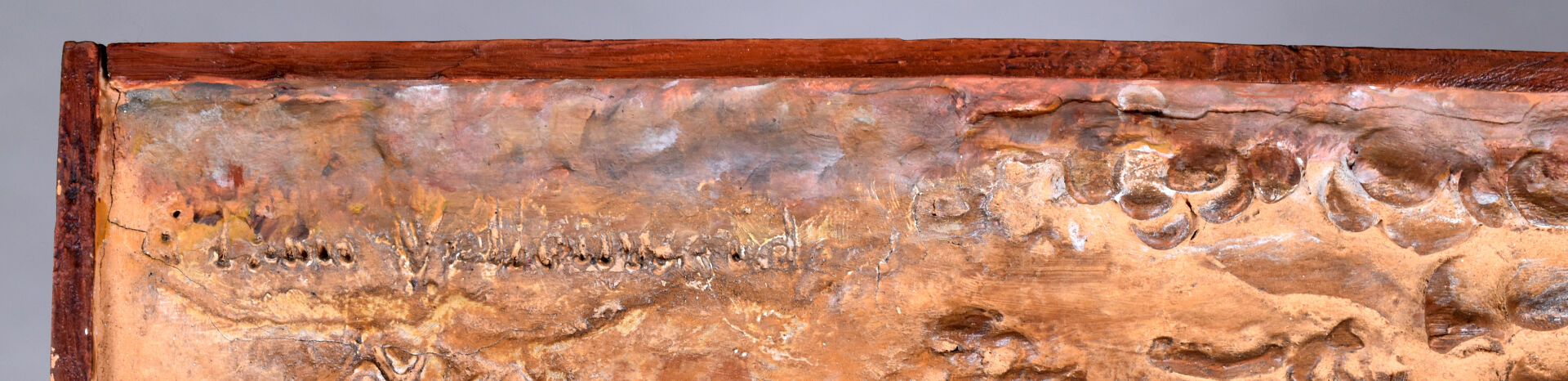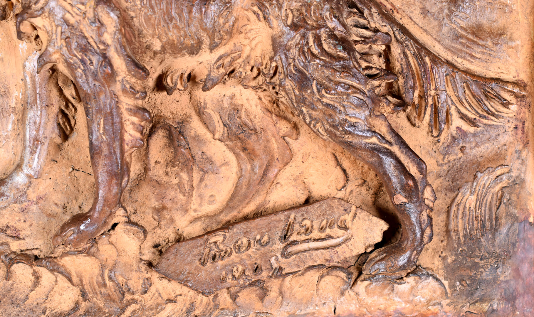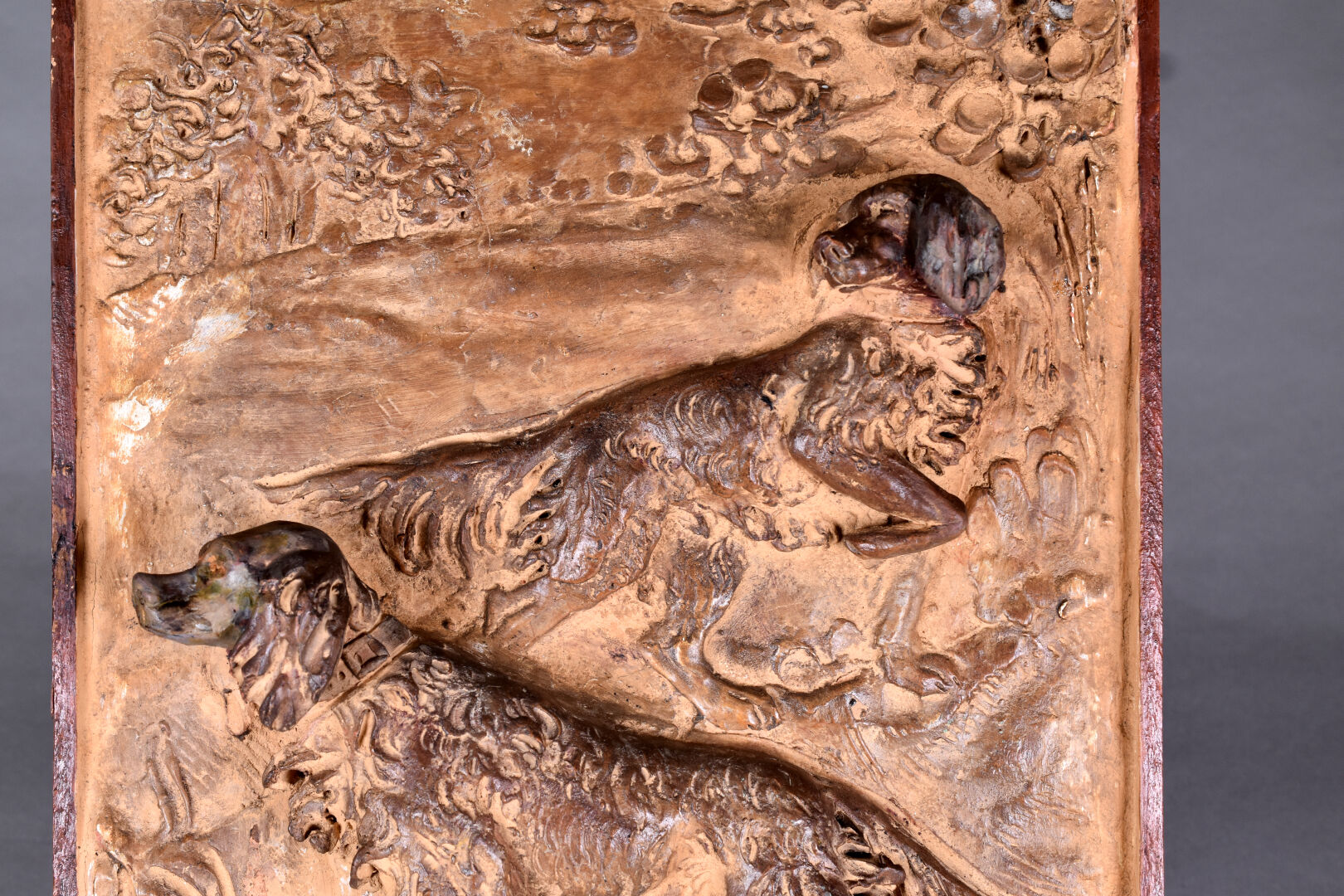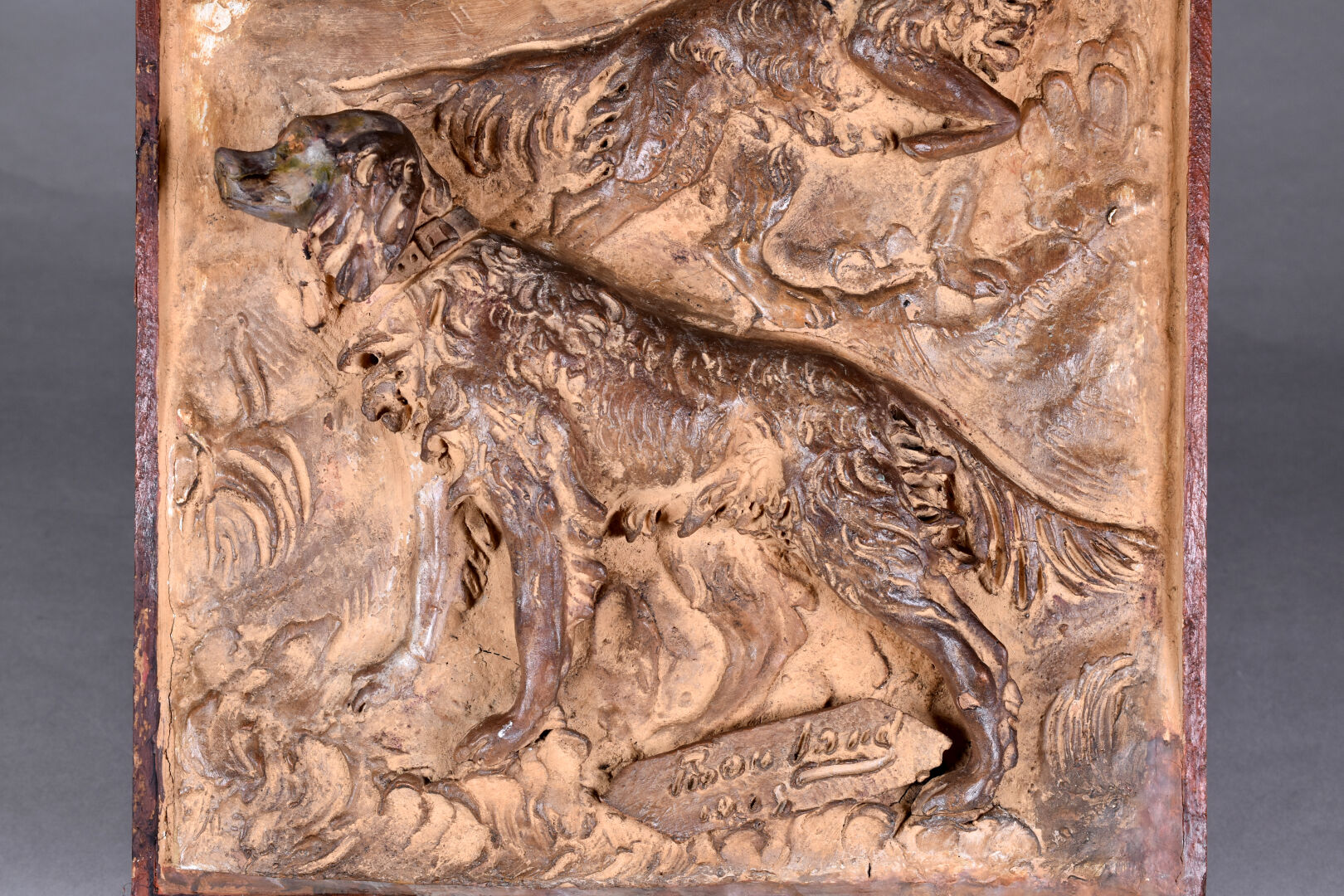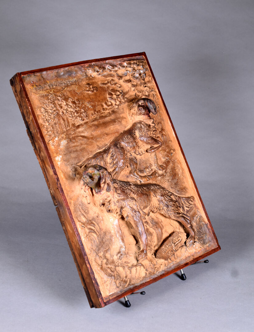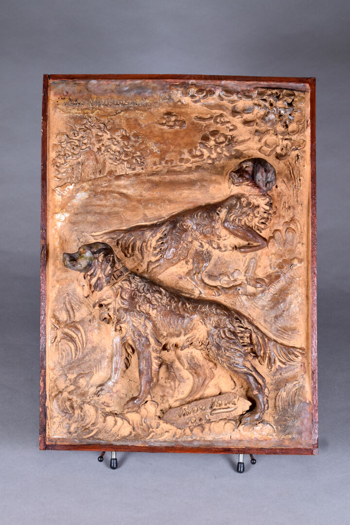 Plaque en céramique (terre cuite ?) en bas relief représentant deux chiens (setter ?). Signé et daté 1903 ? en bas. Cadre en bois. 44 x 33 cm.