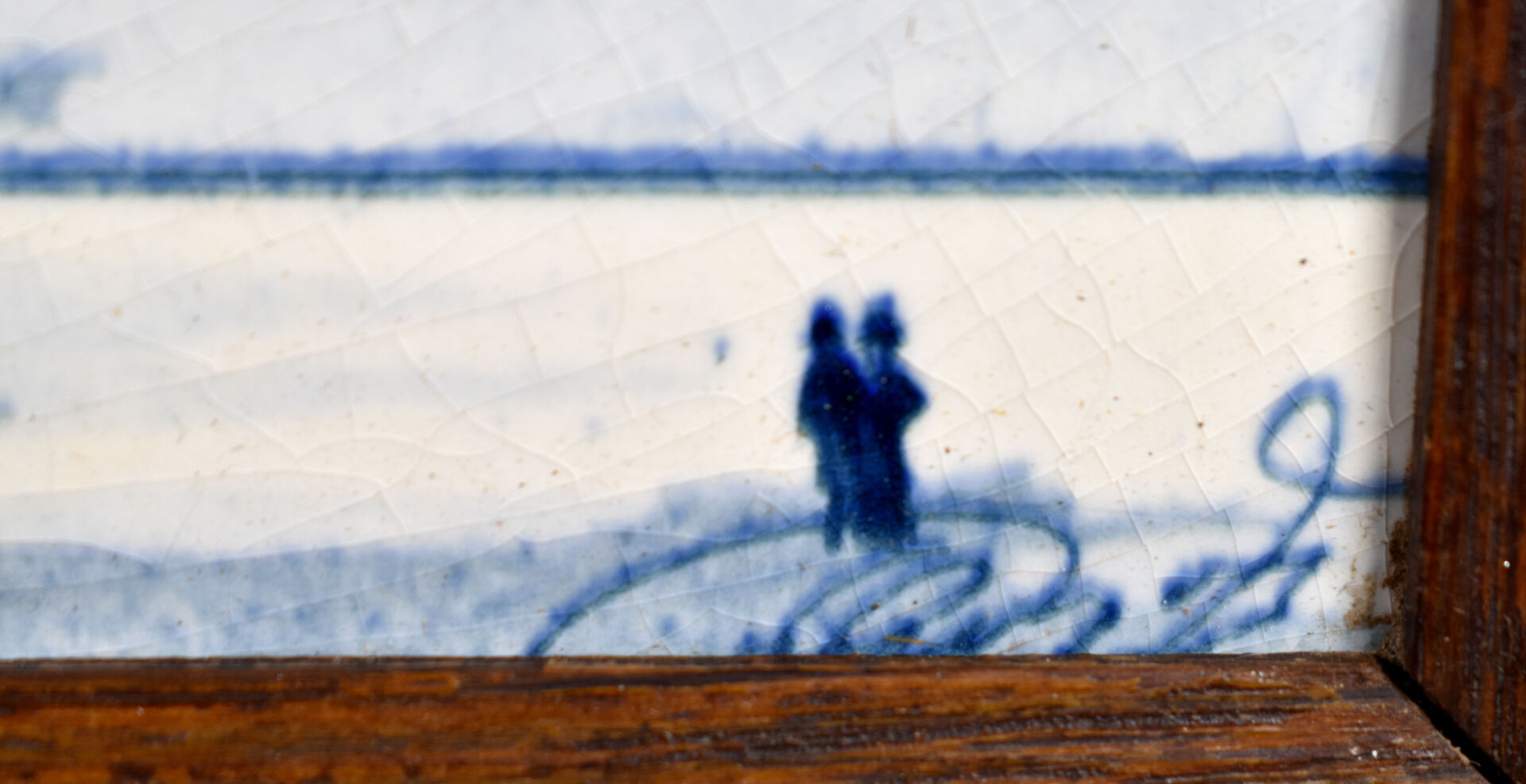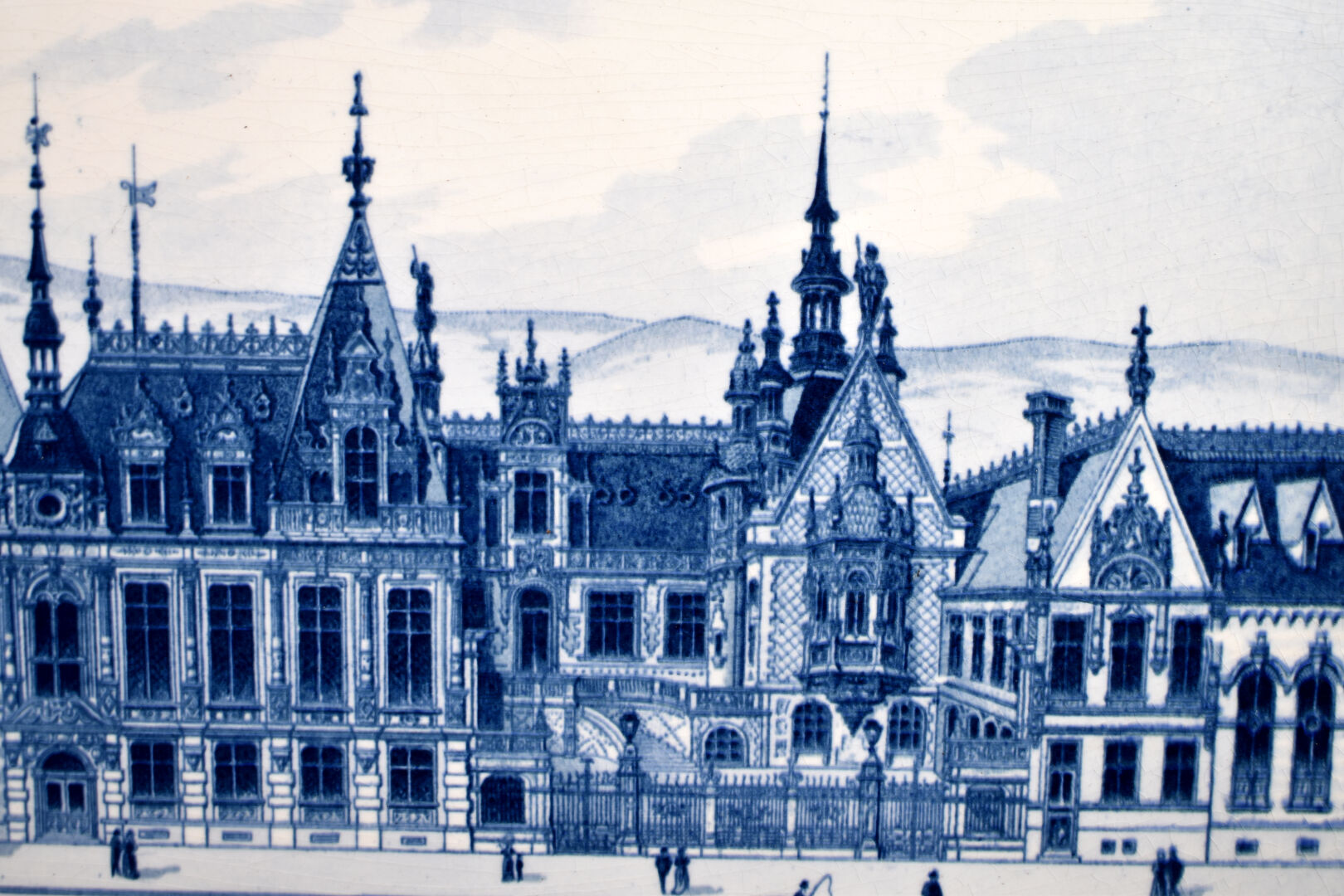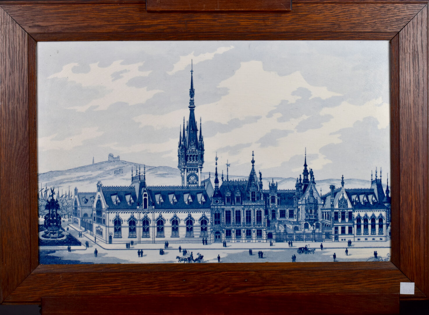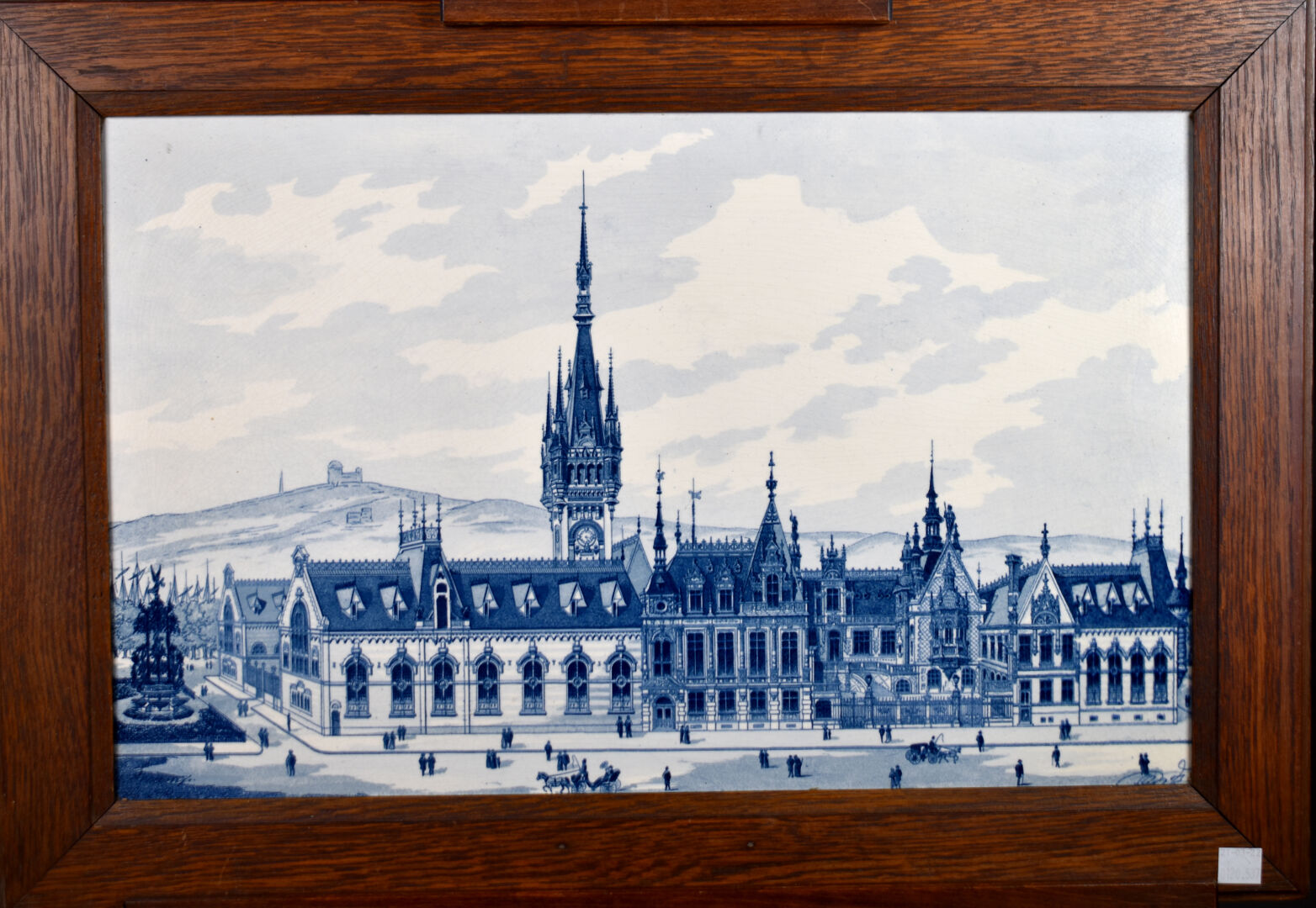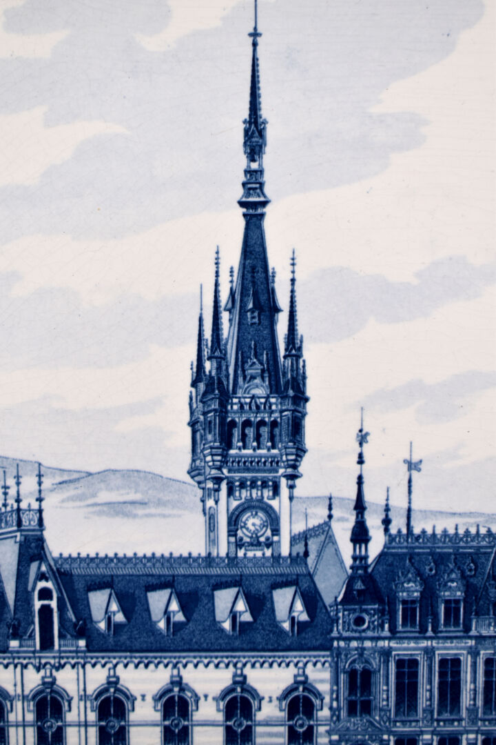 Plaque en faïence à décor en bleu sous couverte d’une ville (probablement des Pays-Bas). Delft, XXe siècle. 32,5 x 50,5 cm.