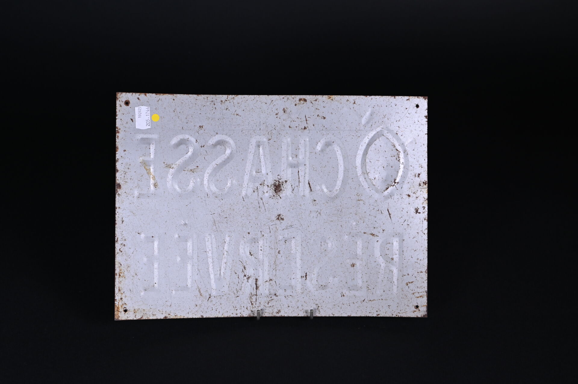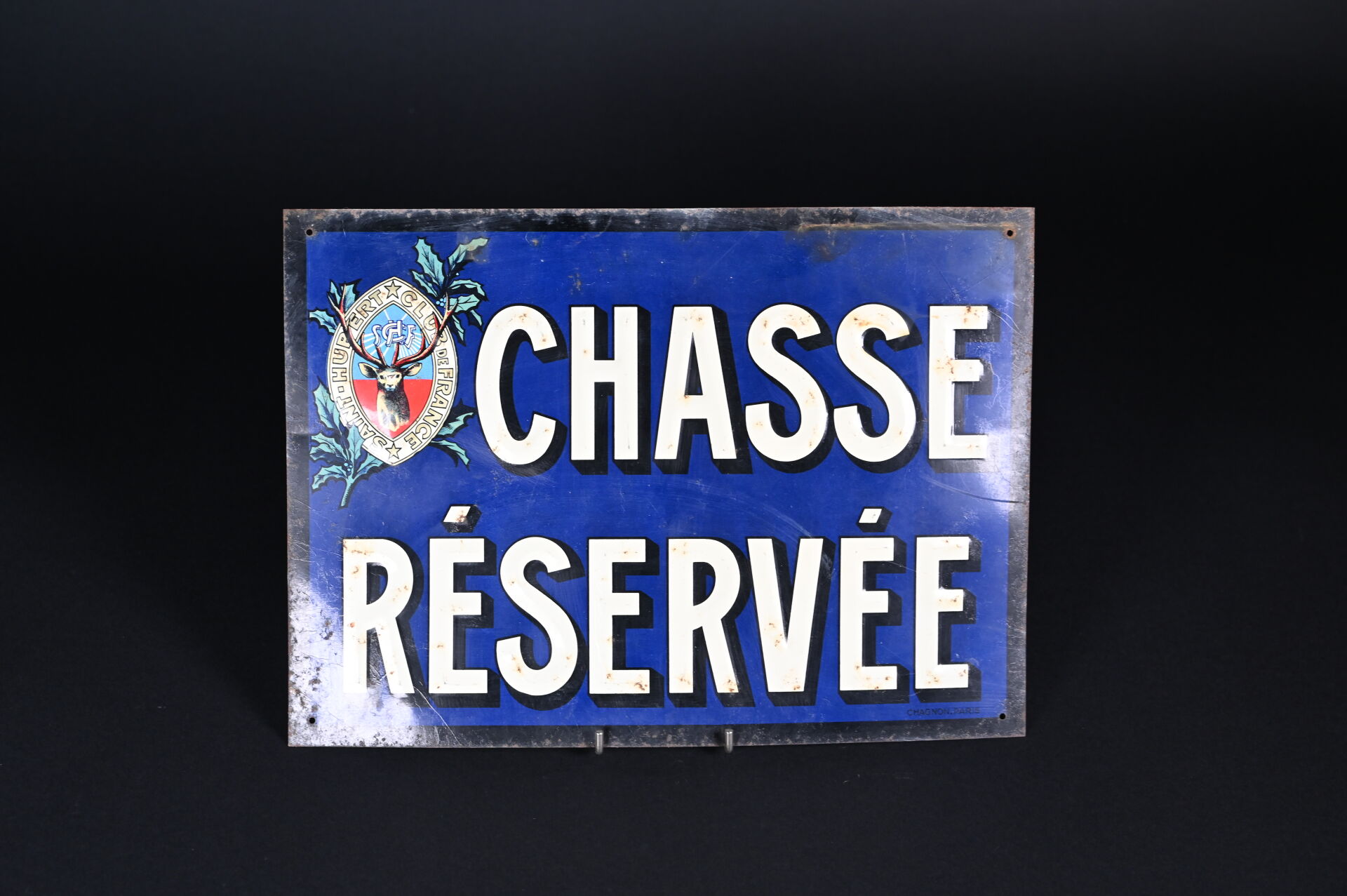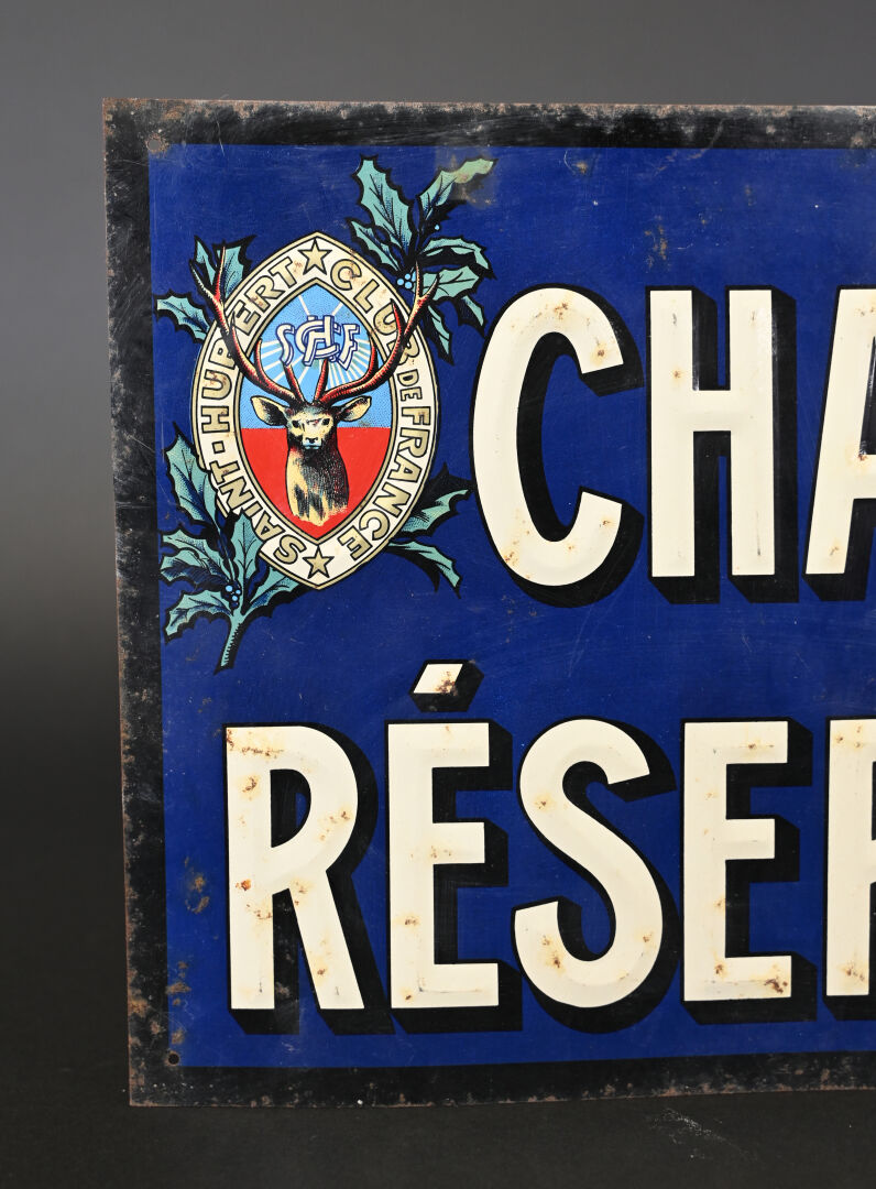 Plaque peinte CHASSE RESERVEE chez CHAGNON Paris – SAINT-HUBERT, CLUB DE FRANCE. (piqures, gondolée). 35 x 25 cm.