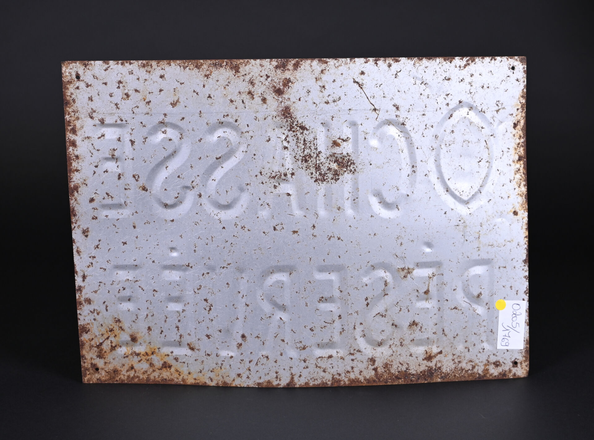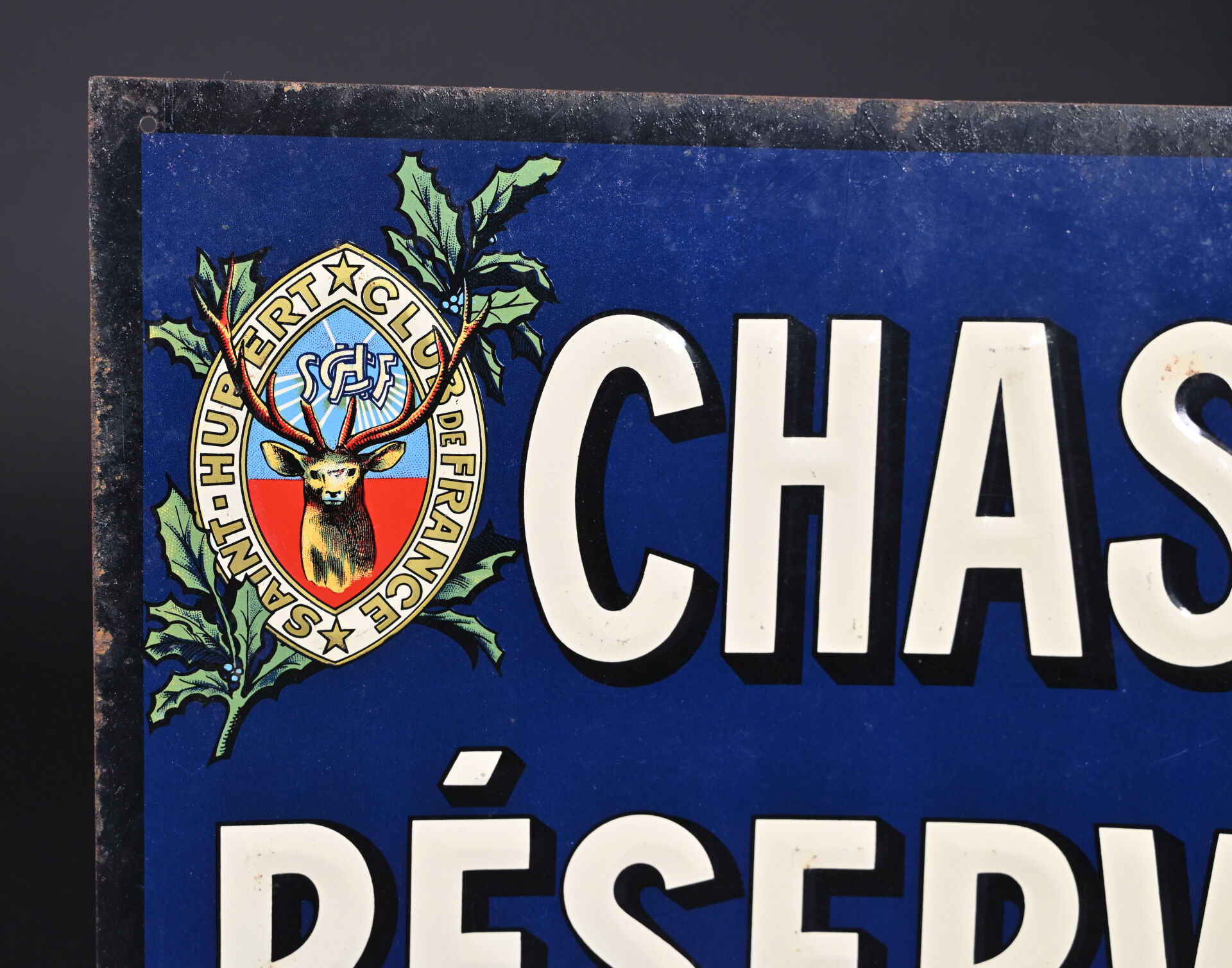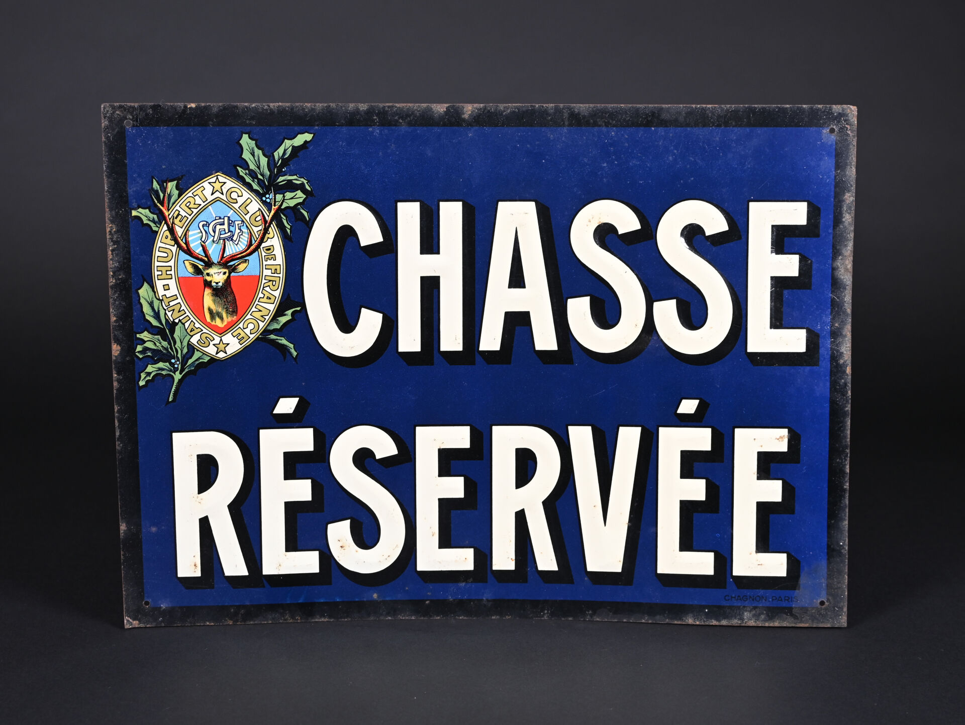 Plaque peinte CHASSE RESERVEE chez CHAGNON Paris – SAINT-HUBERT, CLUB DE FRANCE. (piqures, gondolée). 35 x 25 cm.