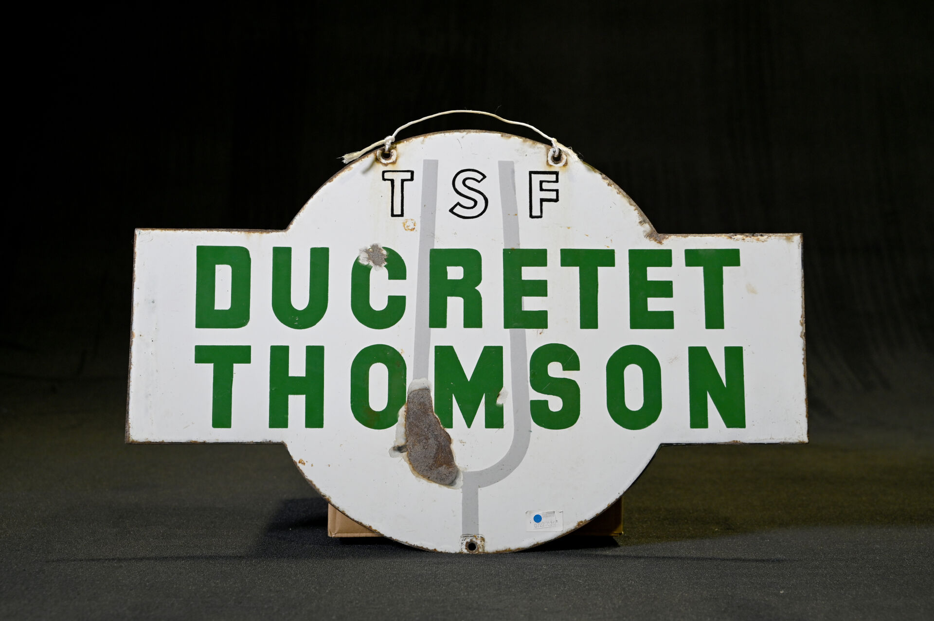 Plaque publicitaire en tôle émaillée double face à lettrage vert et noir sur fond blanc DUCRETET THOMSON TSF (éclats, craquelures) 45 x 70 cm.