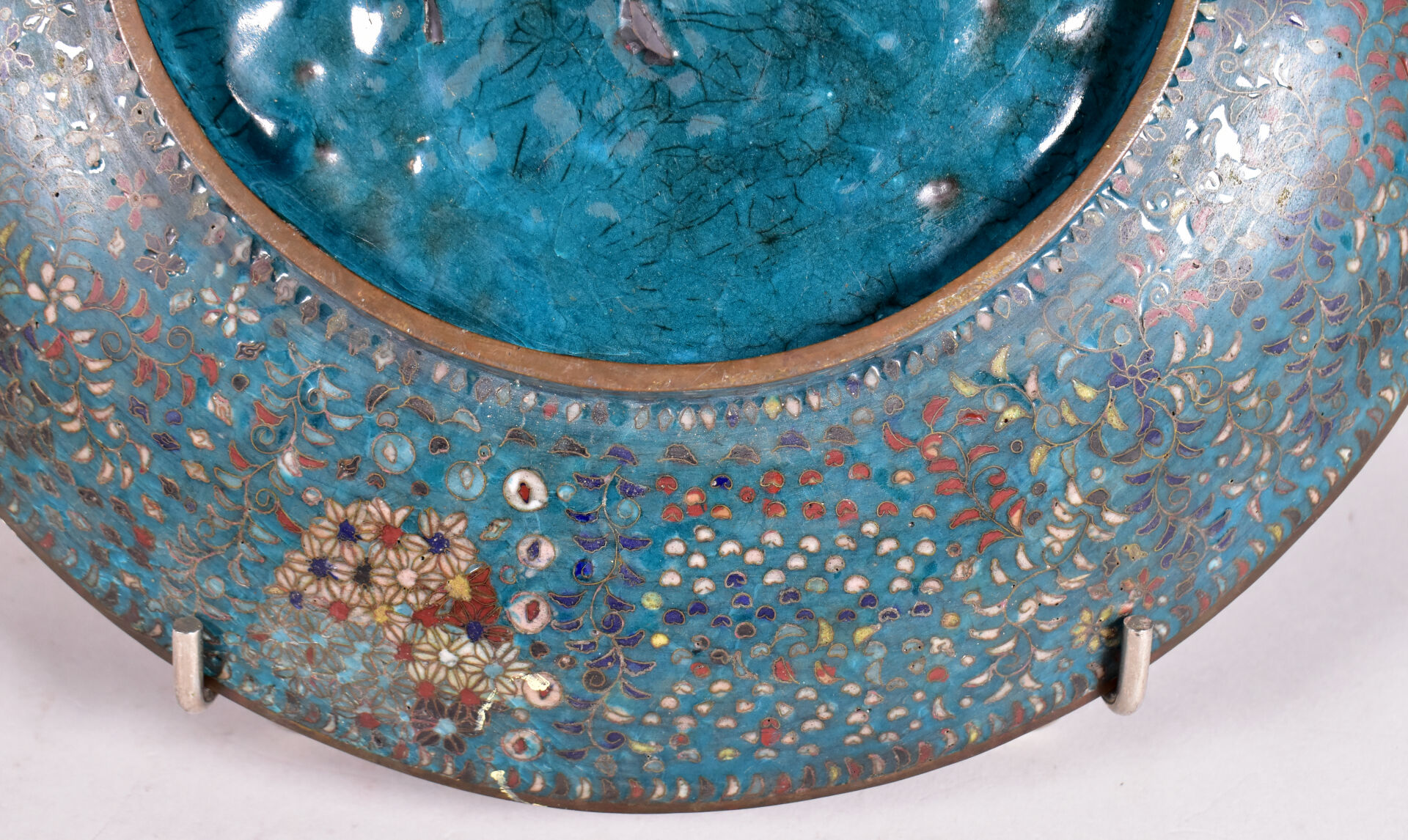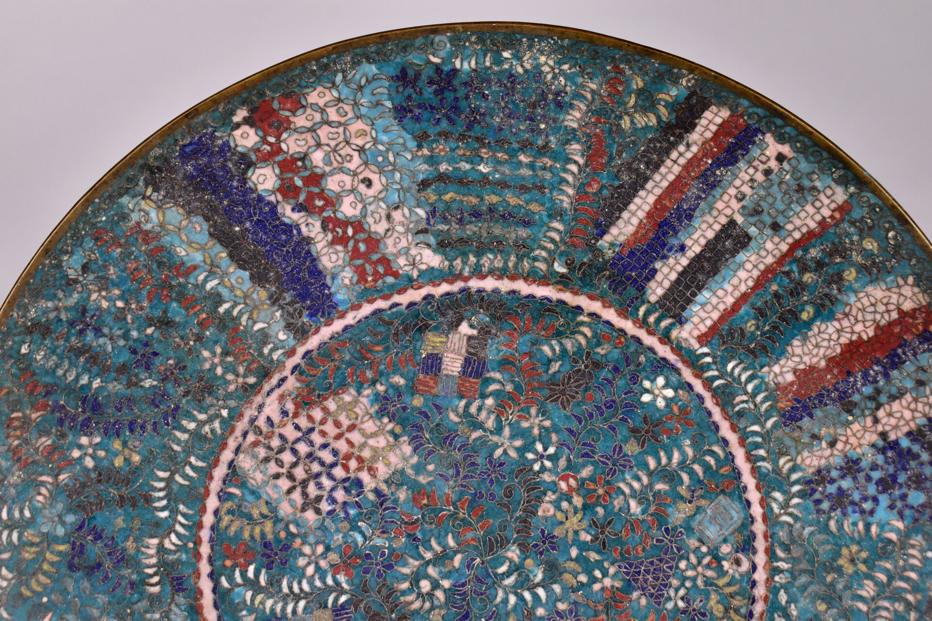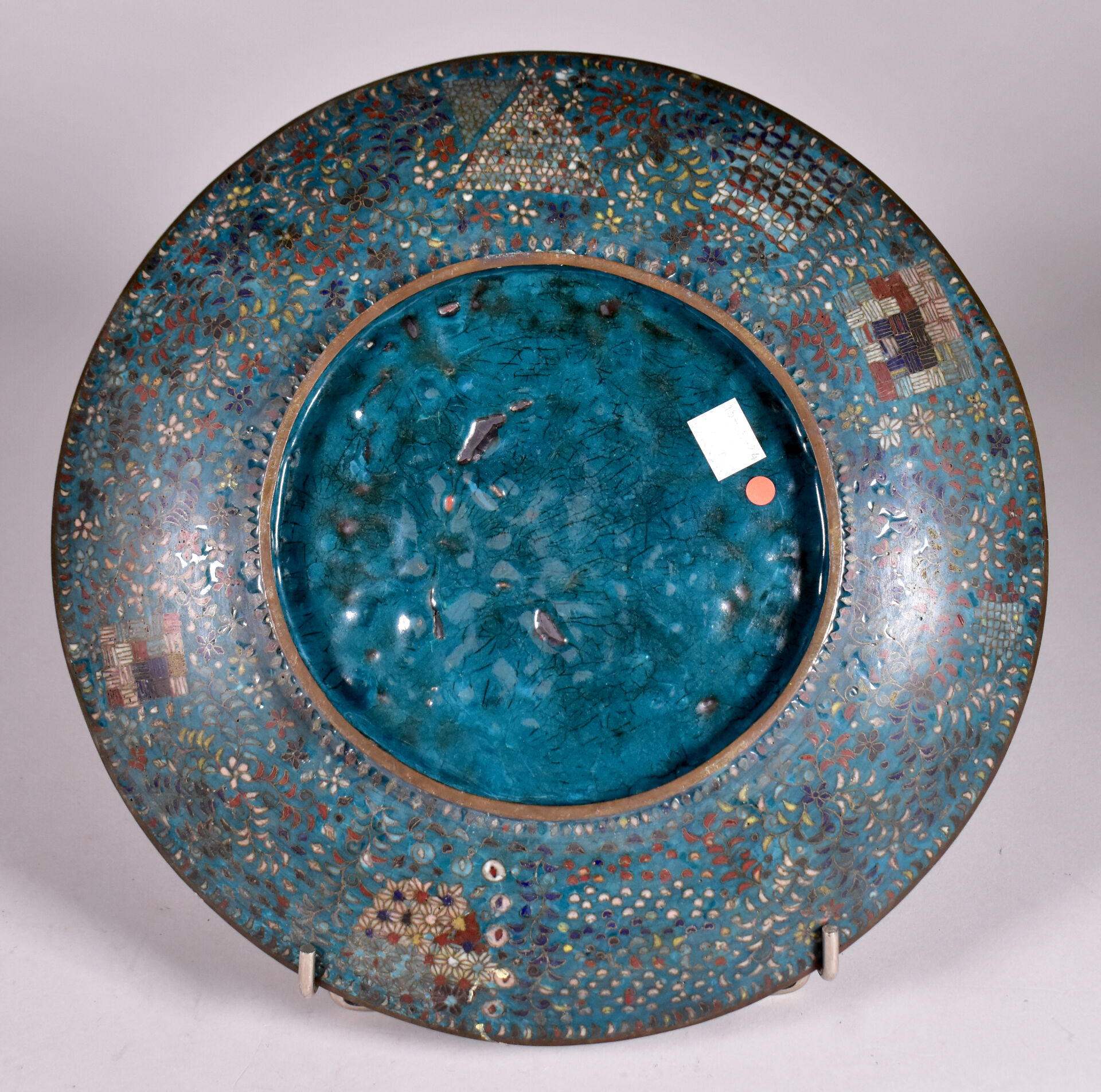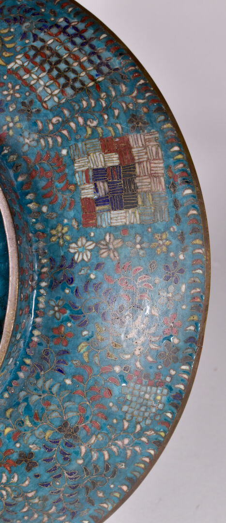 Plat à décor en émaux cloisonnés polychromes et fond turquoise sur cuivre. Japon vers 1900. Diam. : 31 cm.