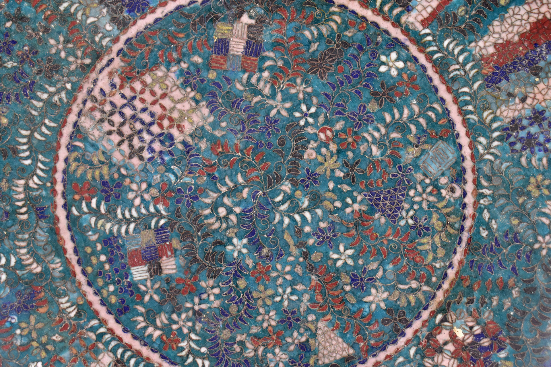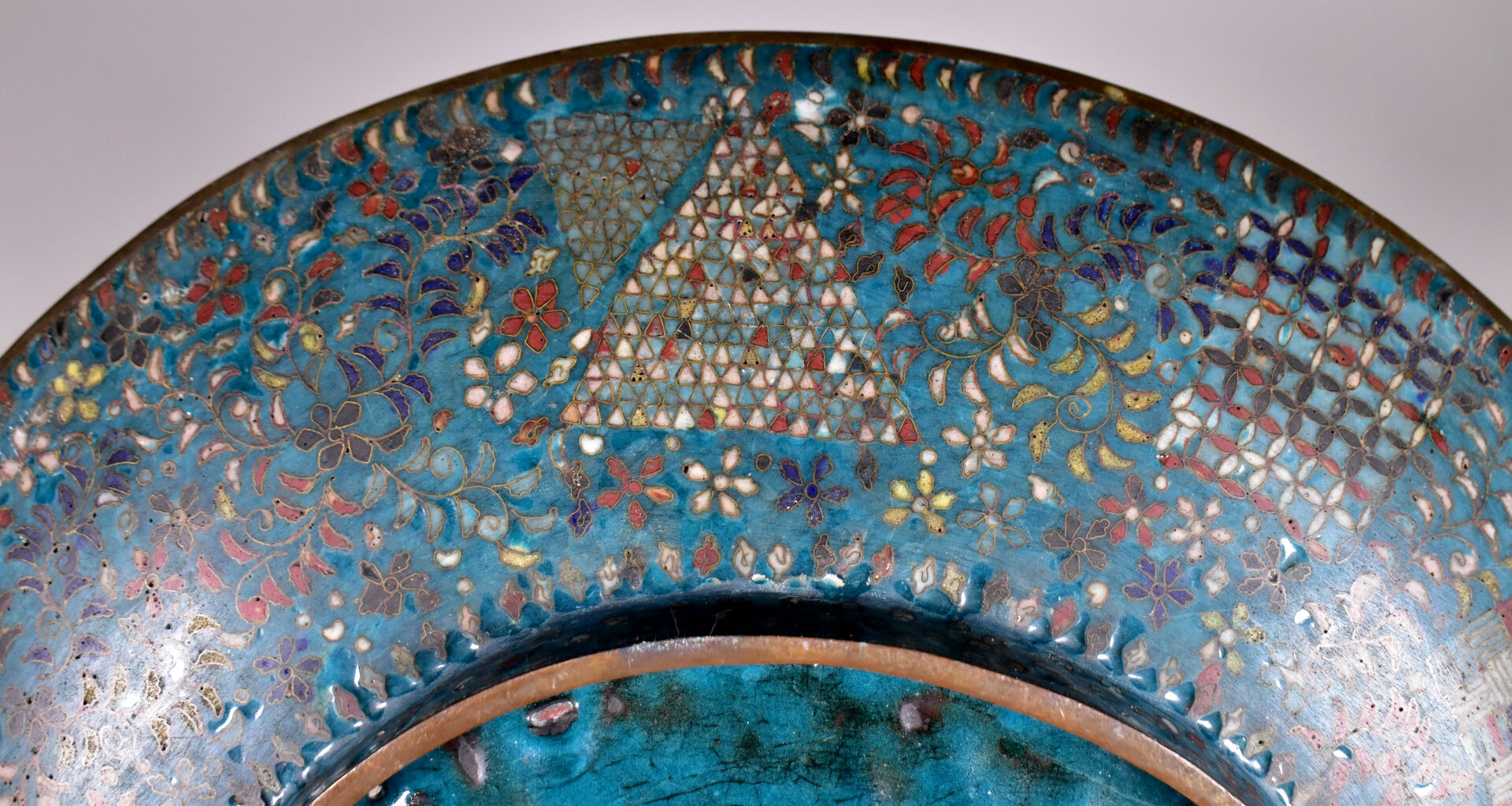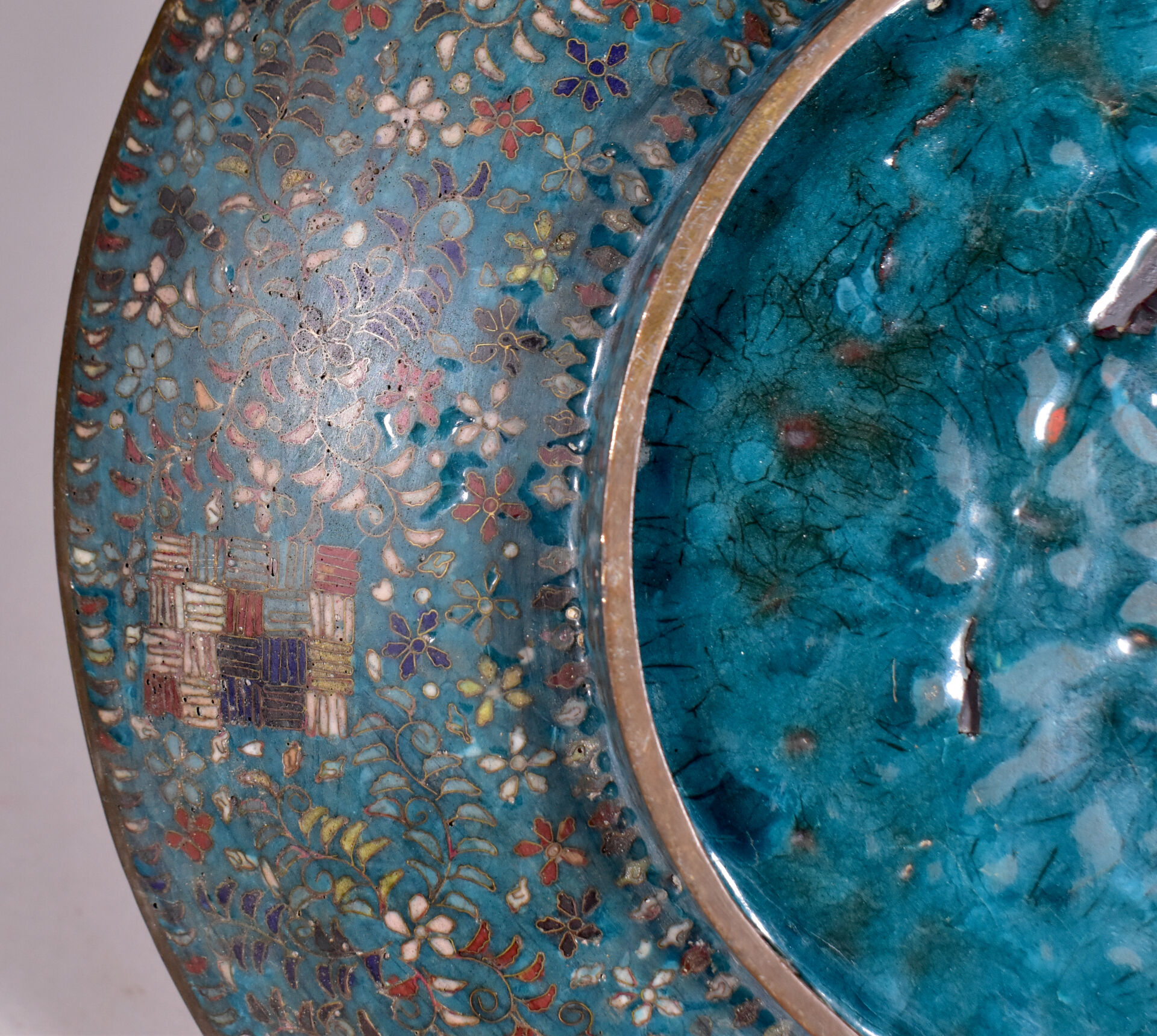 Plat à décor en émaux cloisonnés polychromes et fond turquoise sur cuivre. Japon vers 1900. Diam. : 31 cm.