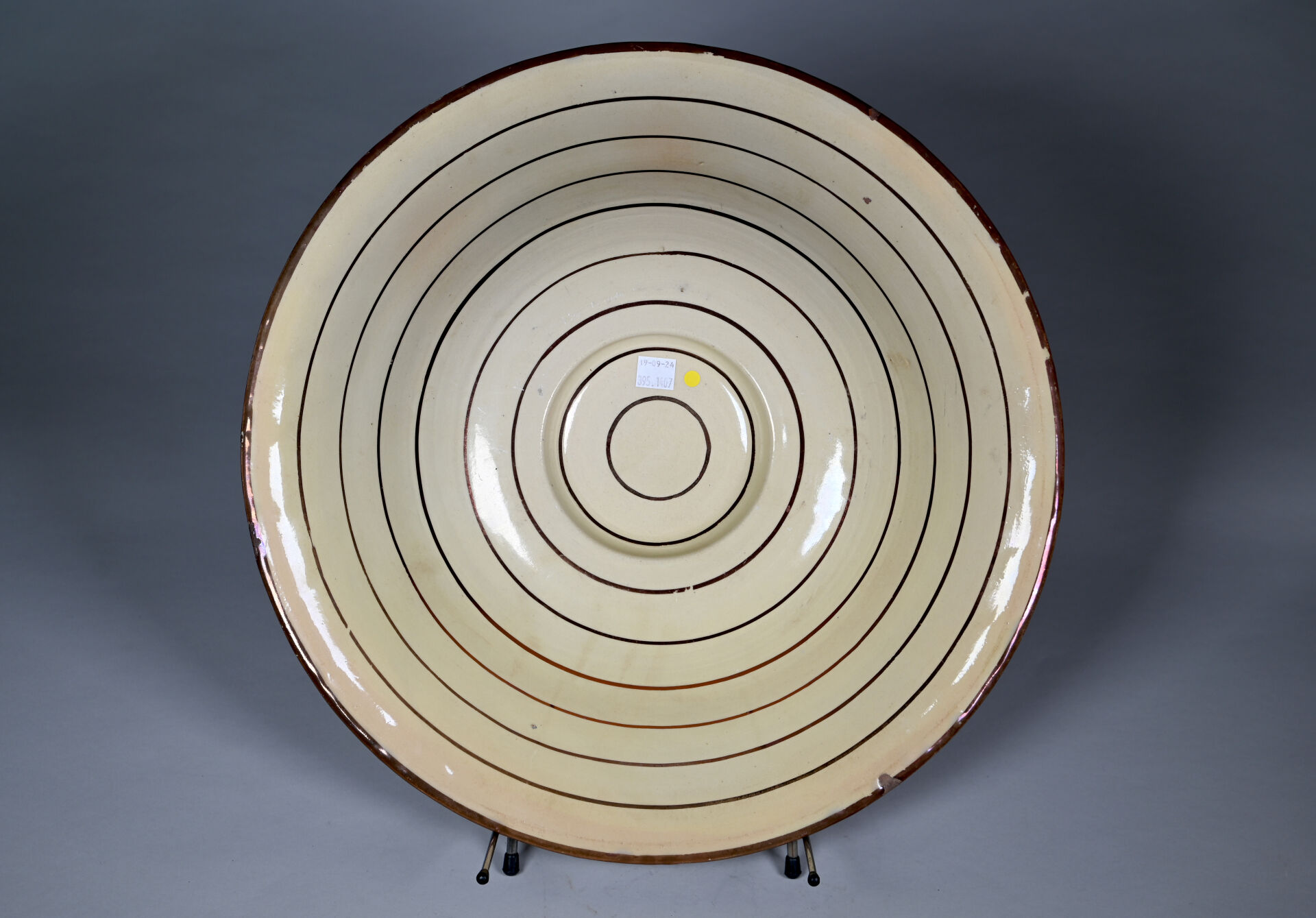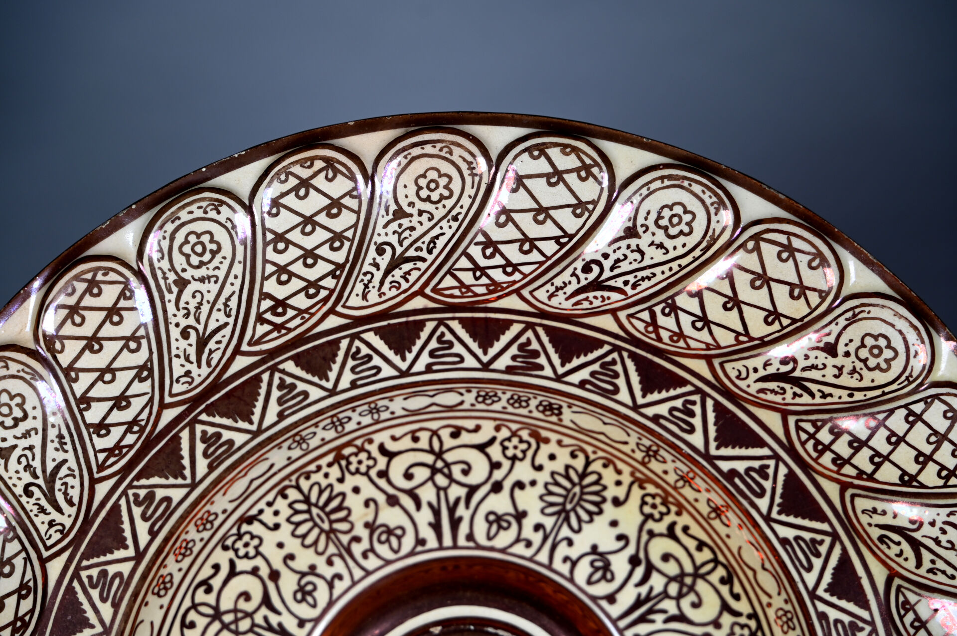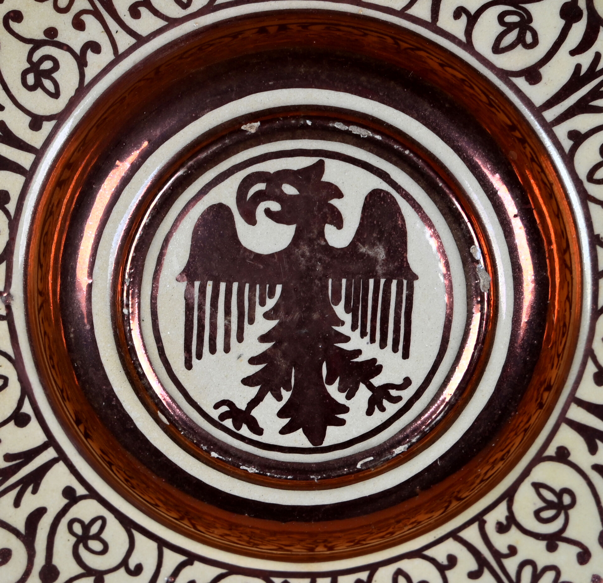 Plat à ombilic en céramique lustrée à reflets métalliques, décor d’arabesques centré d’un aigle (égrenures). Probablement hispano mauresque, Manises ? Diam. : 46 cm.