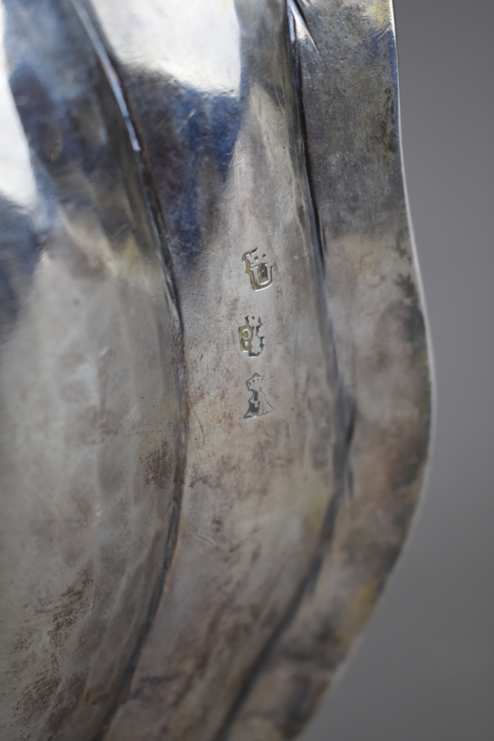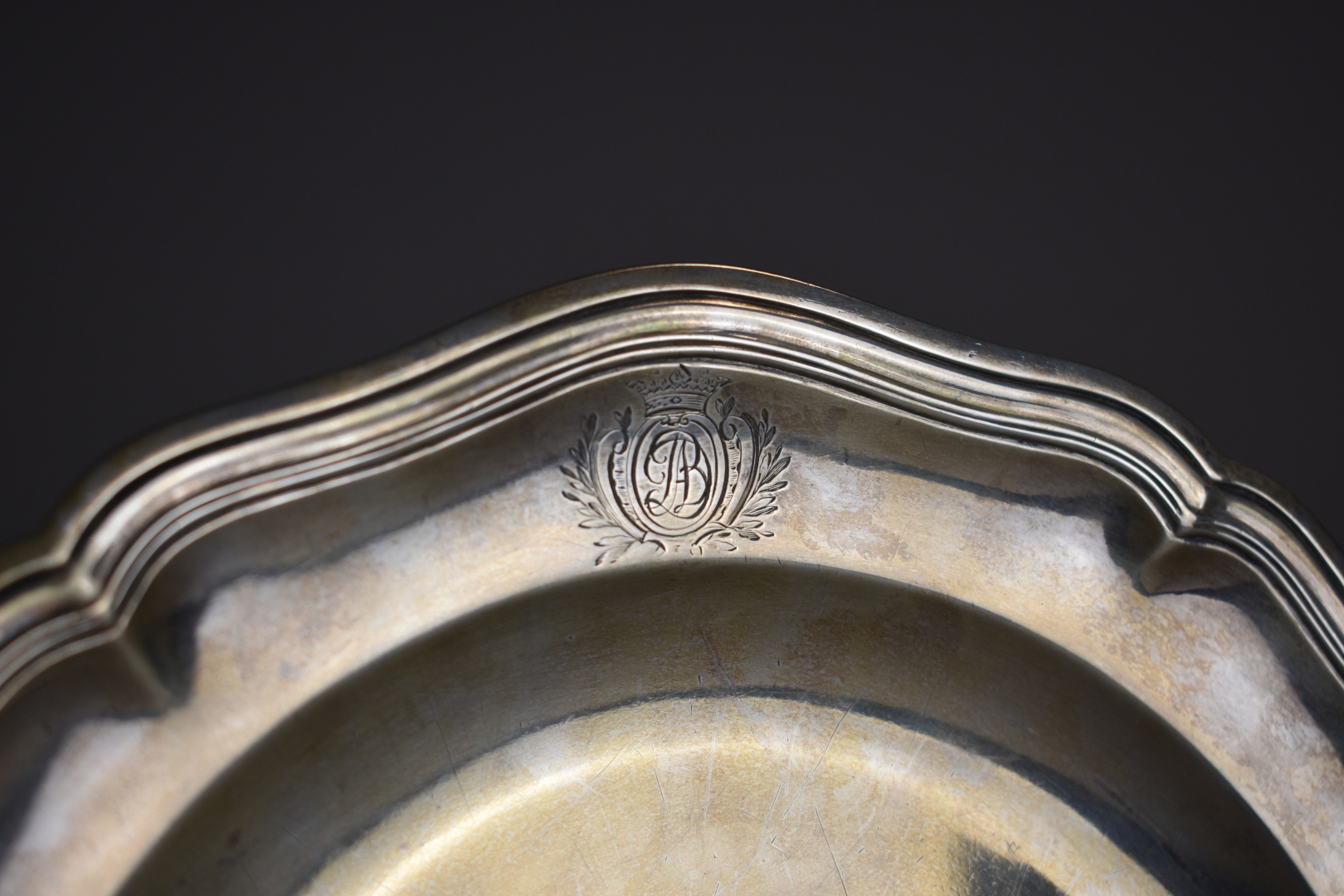 Plat circulaire à bordure violonée en argent 950/1000e (poinçon de charge Paris 1783 – 1789) . Trace de poinçon de Maître orfèvre. L’aile ciselée du chiffre A.B surmonté d’une couronne de Marquis. Poids : 663 g.