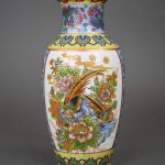 Plat circulaire en porcelaine à décor émaillé dans les camaïeu de bleu et rouge de fer d’oiseaux et de fleurs (deux fèles). Imari, Japon début du XXe siècle. Diam. : 36,5 cm. On joint deux assiettes en porcelaine dans le goût de Canton et un vase balustre.